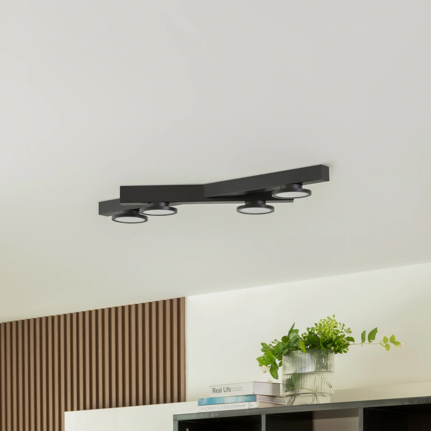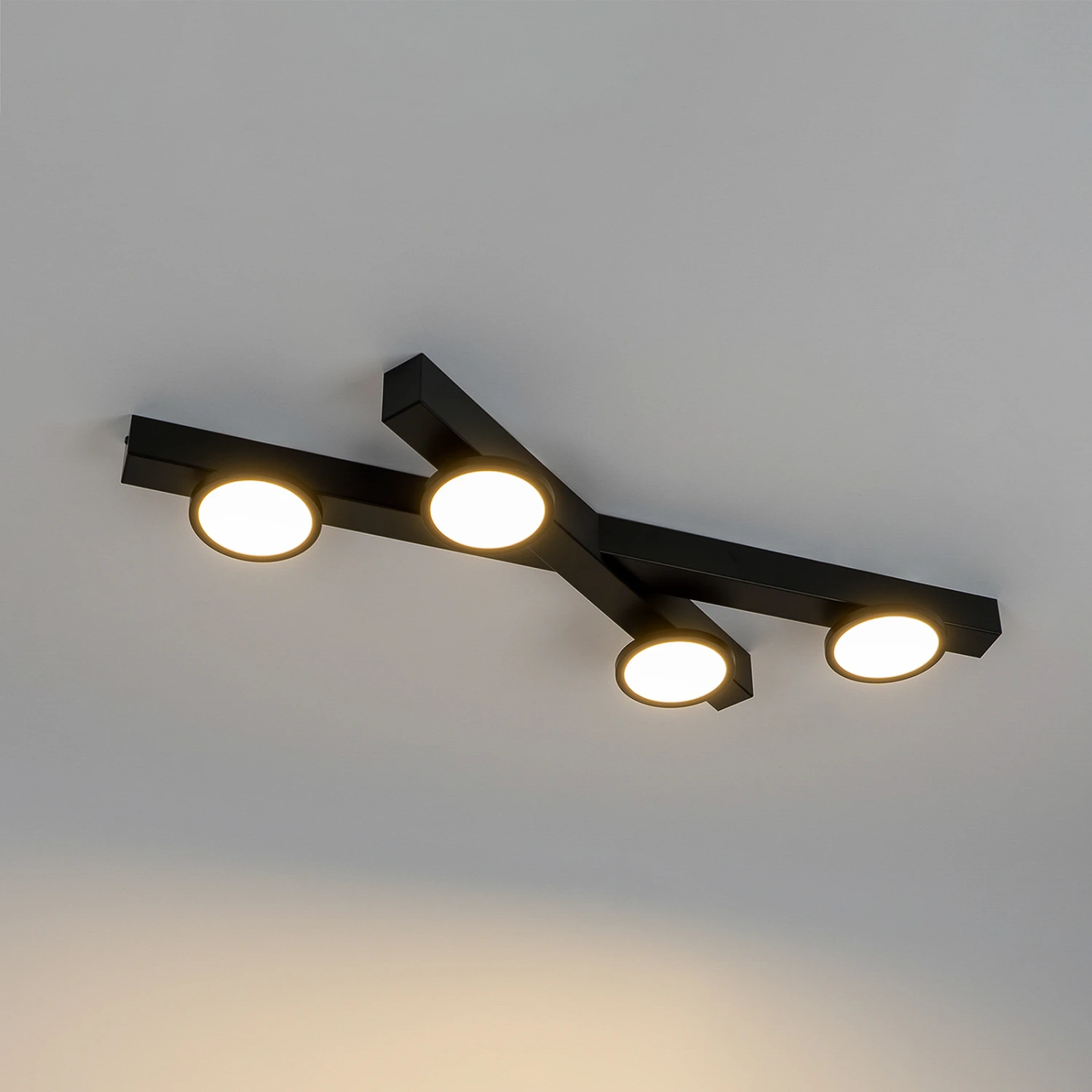 Gekreuzte LED-Deckenleuchte Kellino mit schwarzer Oberfläche, vierflammig, exklusives DesignDie Deckenlampe Kellino verleiht Ihrem Zuhause das gewisse Etwas. Die warmweiße Farbtemperatur des Lichts taucht Ihren Wohnbereich in eine tolle Atmosphäre. Mit dieser Deckenlampe treffen Sie eine Wahl für bewährte Lucande-Markenqualität. Die Leuchte aus Eisen vervollständigt Ihr persönliches Einrichtungskonzept dank des modernen Designs, welches von Ingo Thiele stammt. Das Modell Kellino findet in verschiedenen Anwendungsbereichen in Ihrem Zuhause einen Platz. Es bietet Ihnen mit vier bequem austauschbaren Leuchtmitteln perfektes Licht. Die schwarze Leuchte kommt außerdem GU10-Fassungen daher. Mit dieser Lampe können Sie das Gesamtbild Ihrer vier Wände weiter verschönern.