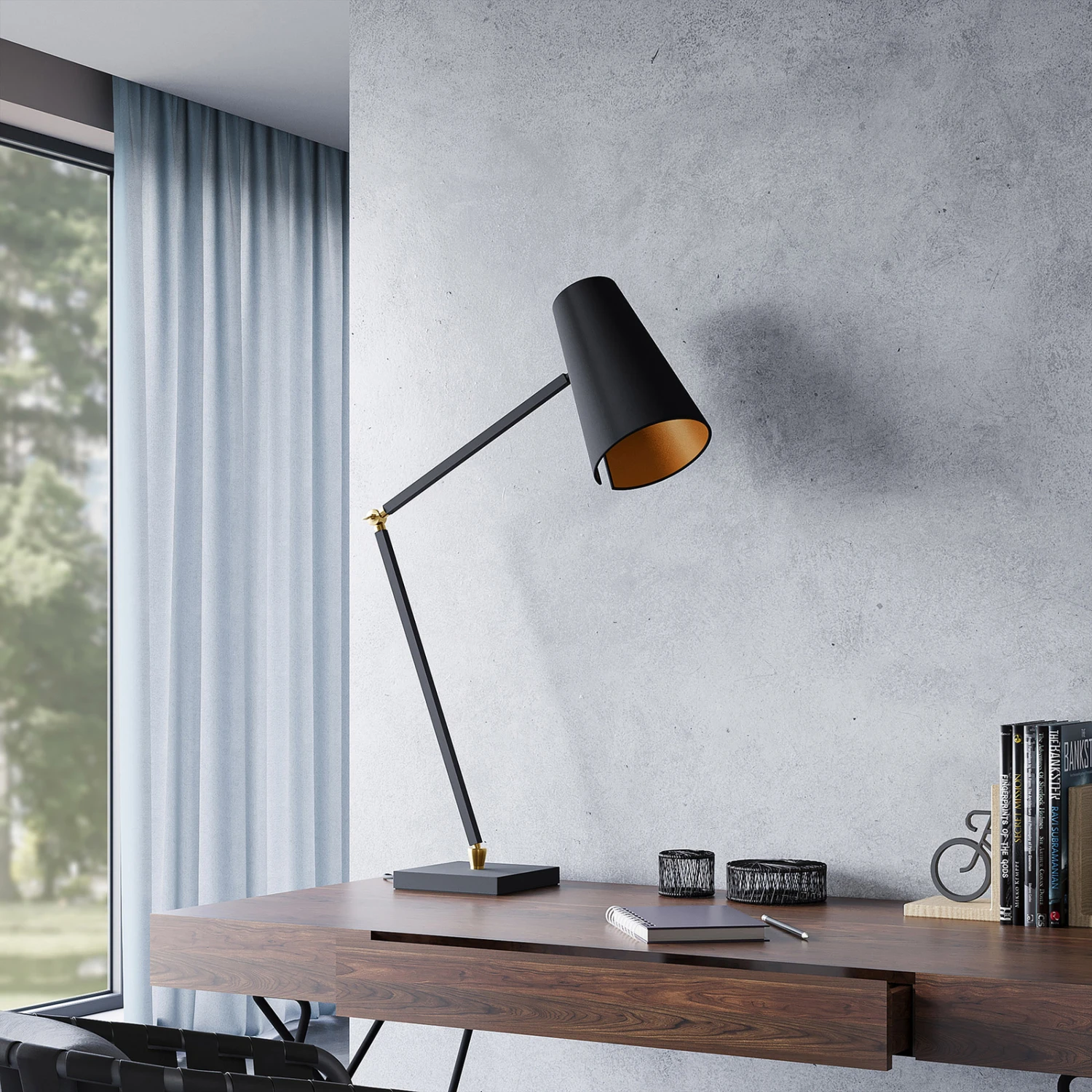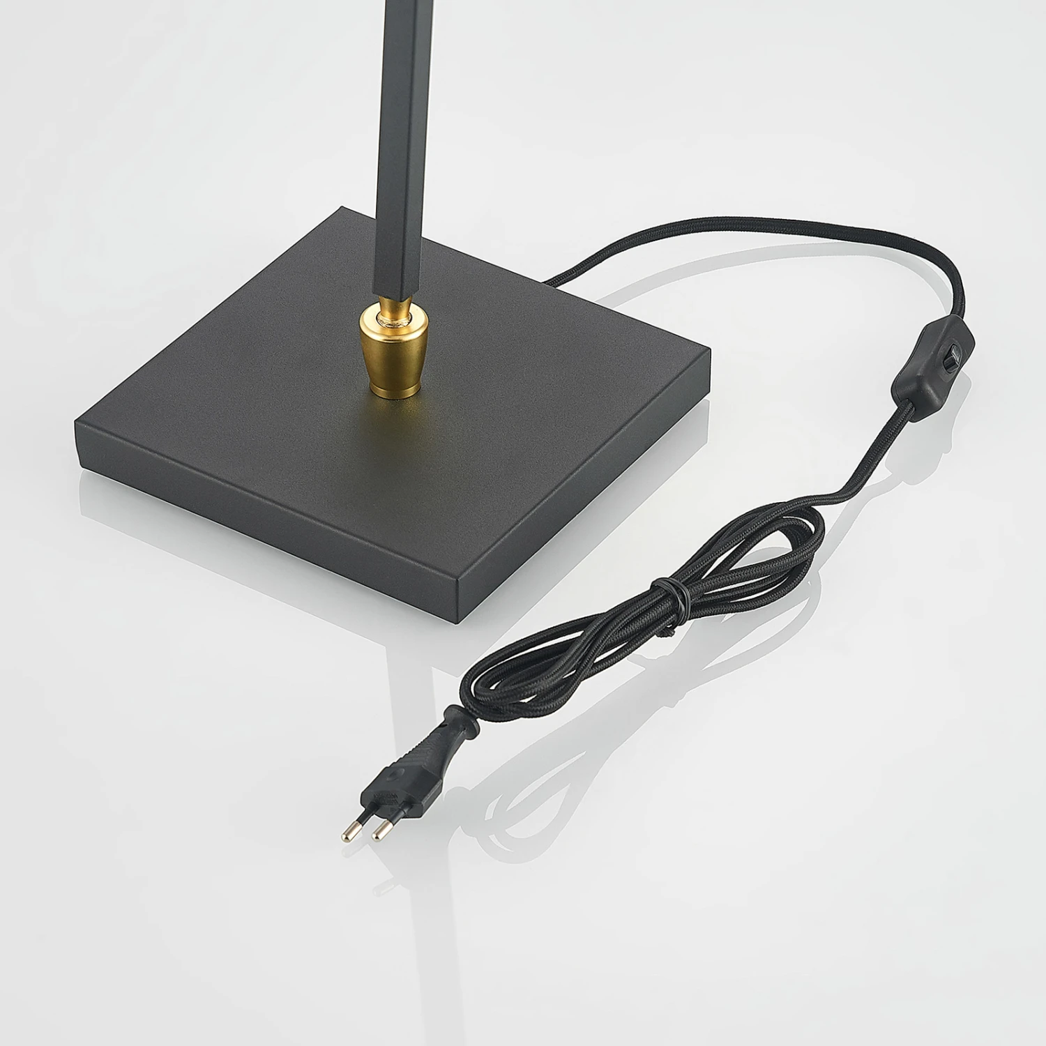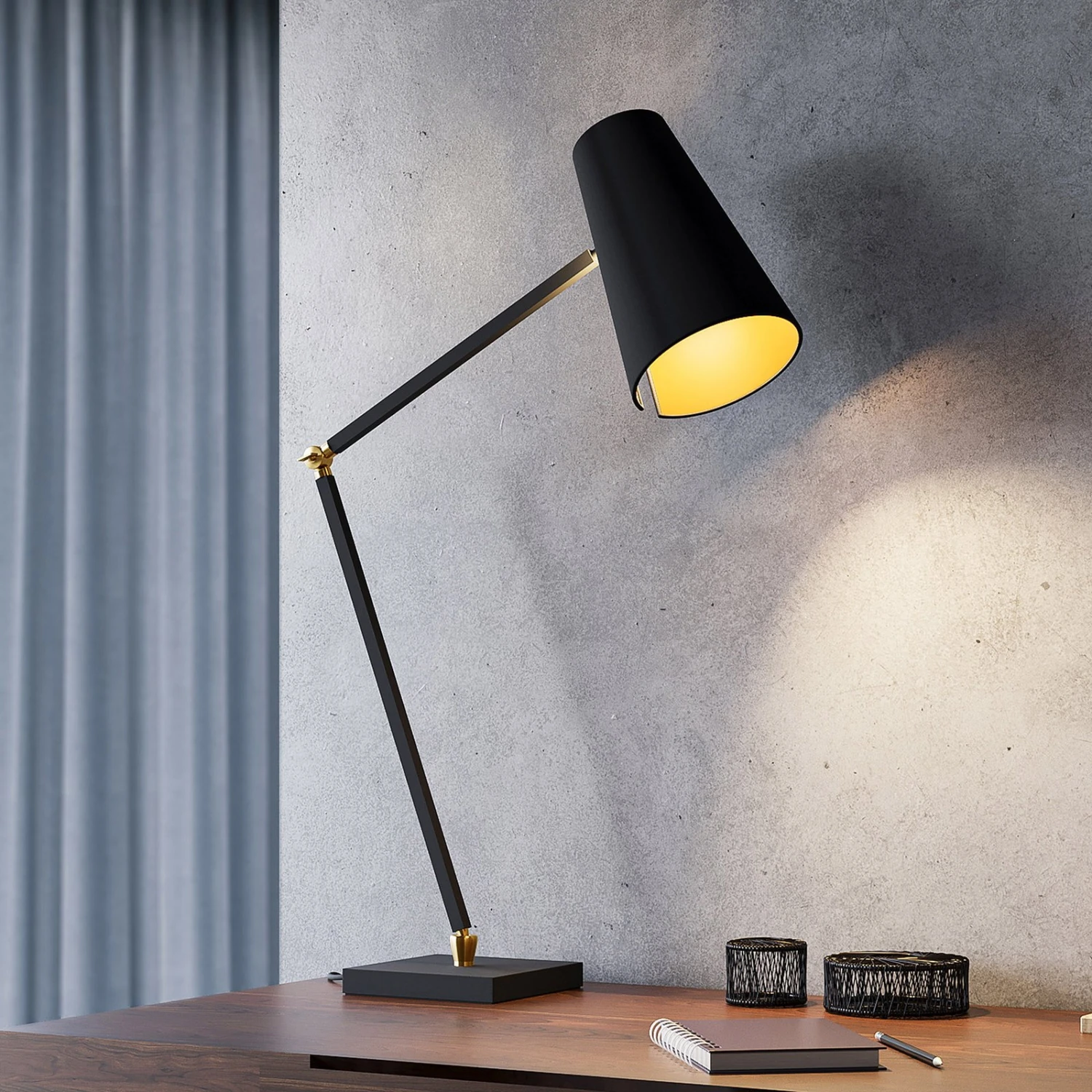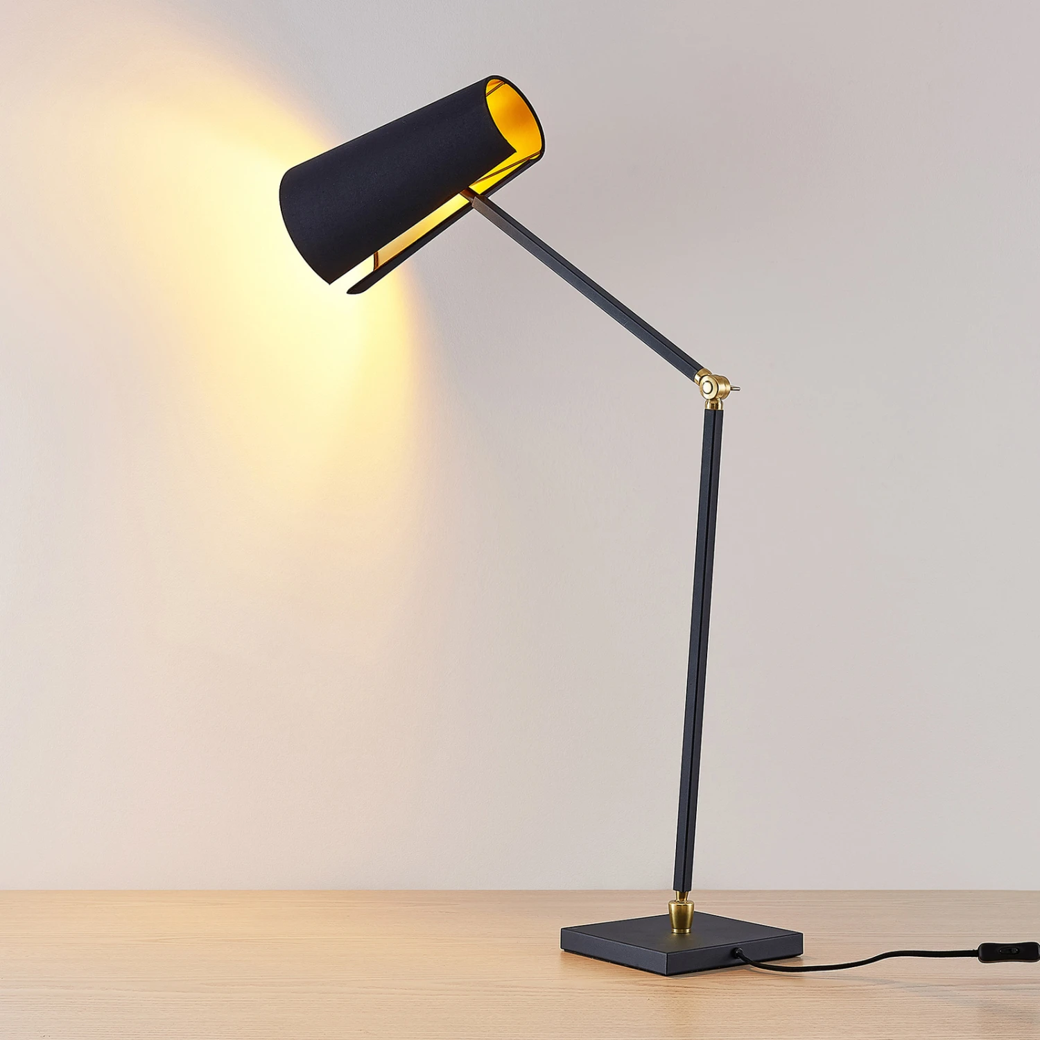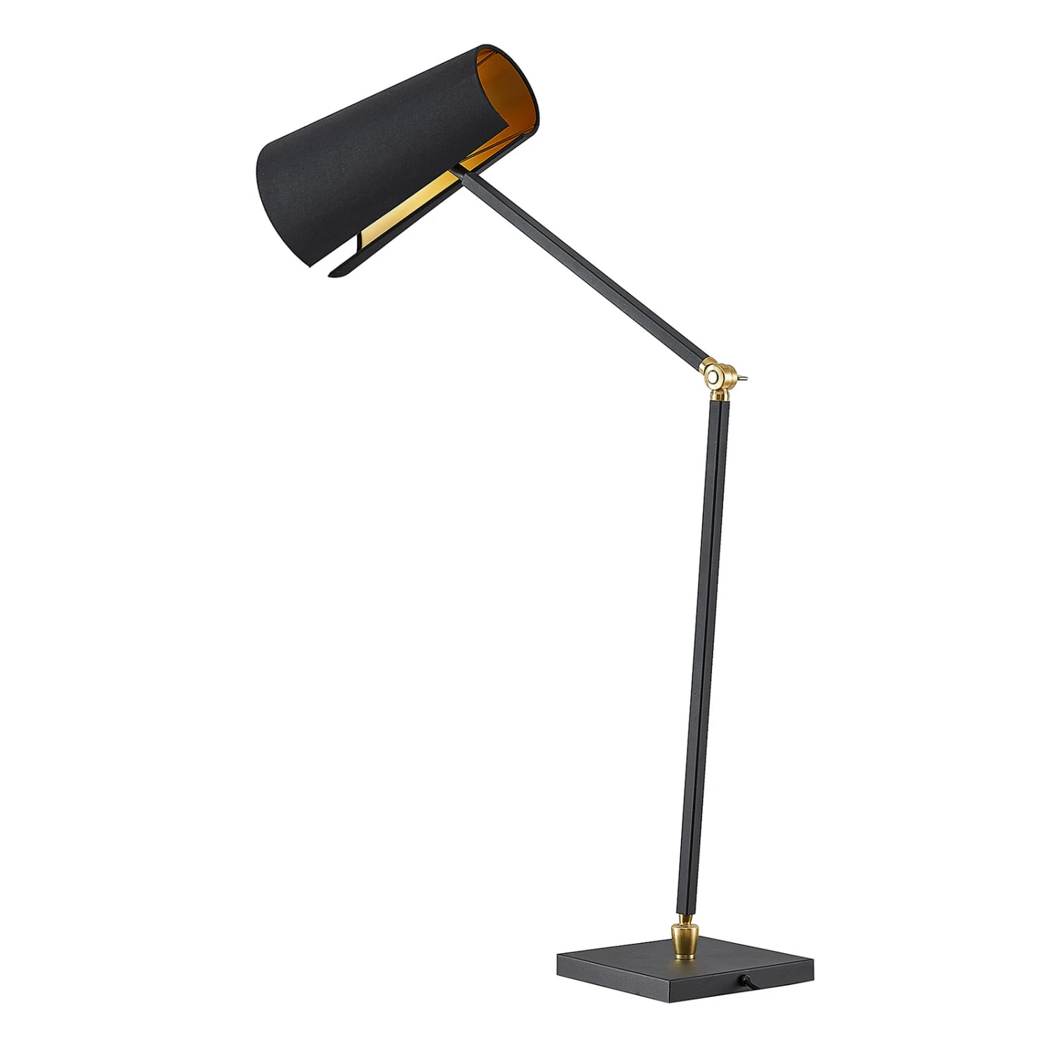 Die Tischlampe Kemoni besitzt einen stabilen Leuchtenfuß aus Eisen in quadratischer Form und ein schlankes Gestell, das sich bei Bedarf verstellen lässt. Der Leuchtenschirm wurde aus Textil gefertigt und in der klassischen Farbe Schwarz gehalten. Das Innere des Schirms überrascht jedoch mit einem warmen Goldton. Diese Tischleuchte ist definitiv designorientiert gestaltet und lässt sich nicht nur im privaten, sondern auch im gewerblichen Bereich nutzen. Mit ihrem modernen Look wertet sie jeden Schreibtisch auf und macht auch im ausgeschalteten Zustand eine gute Figur.