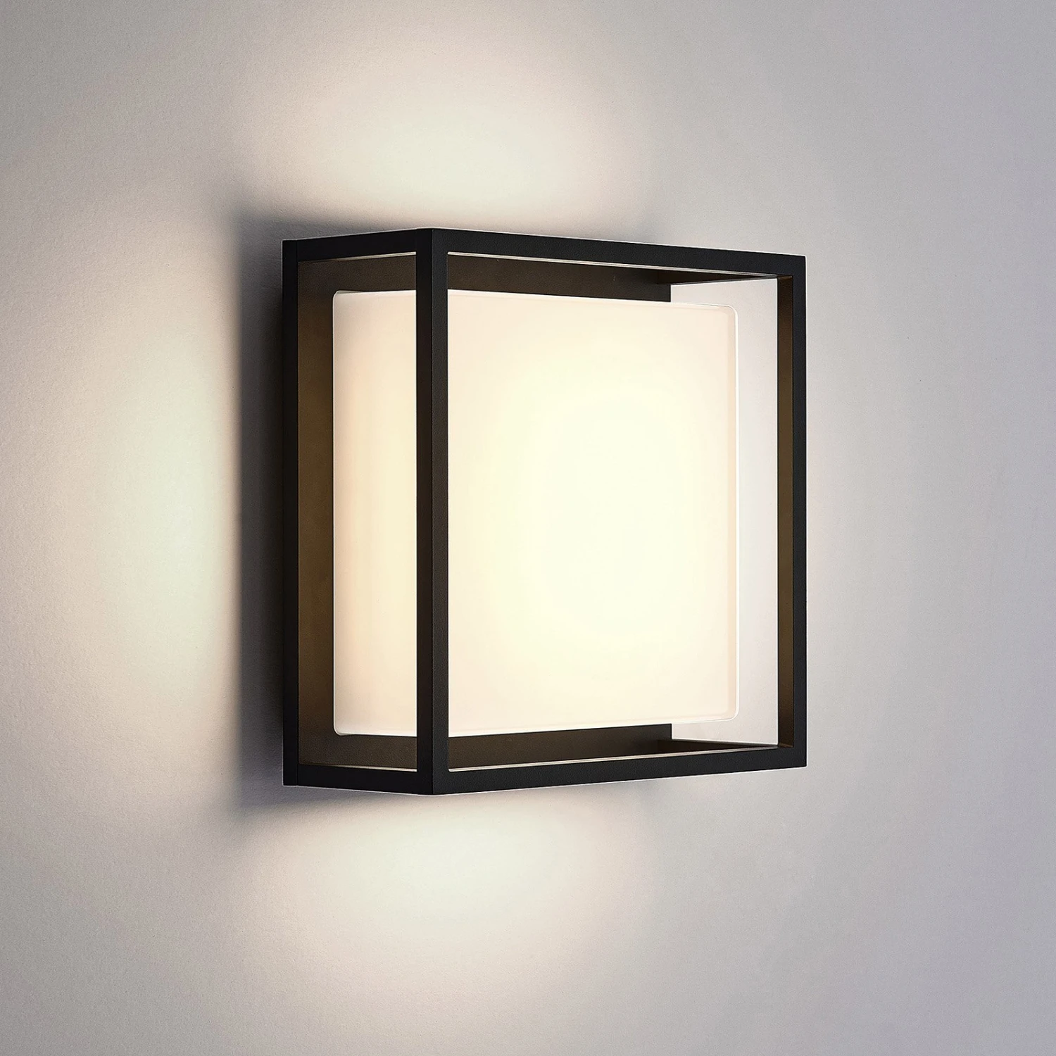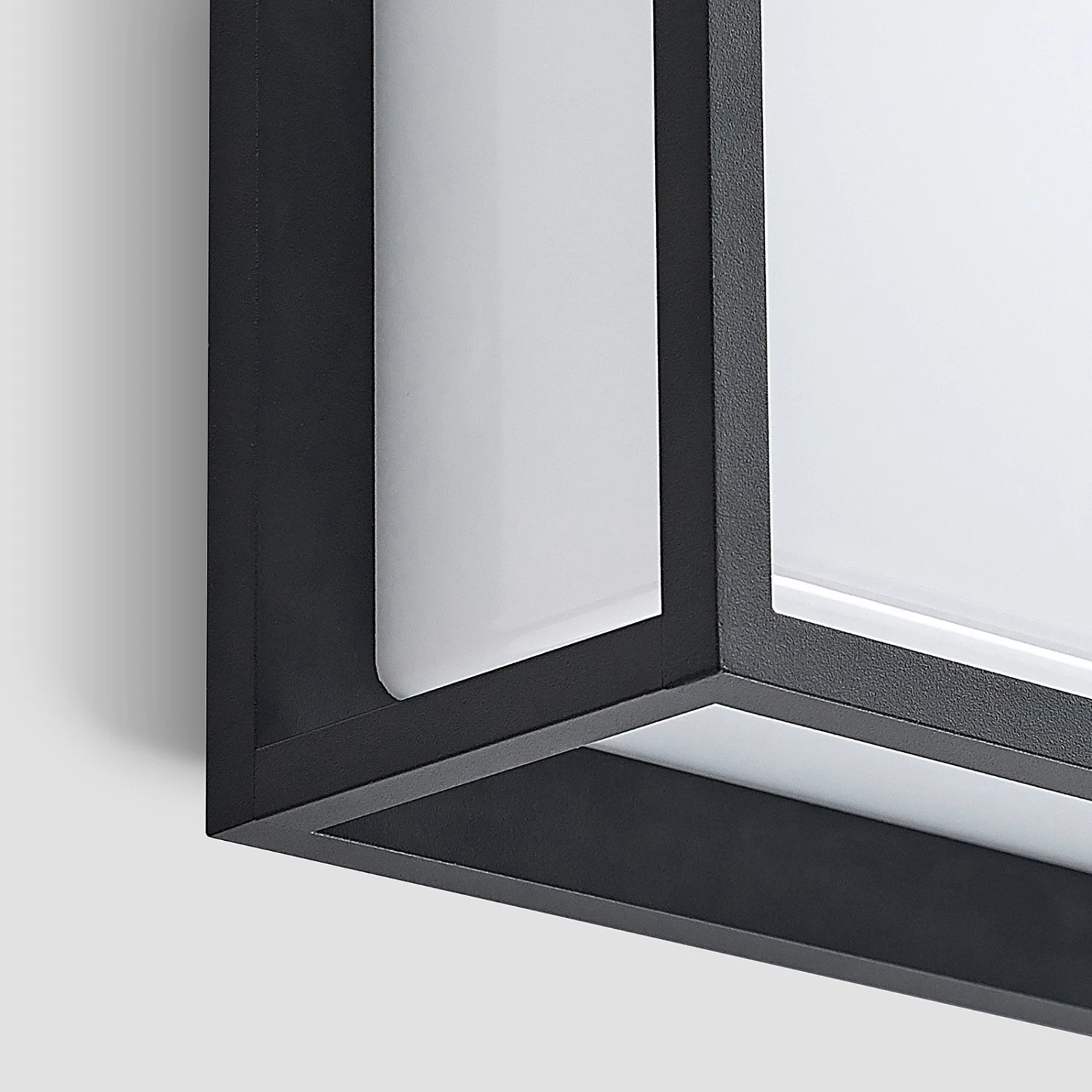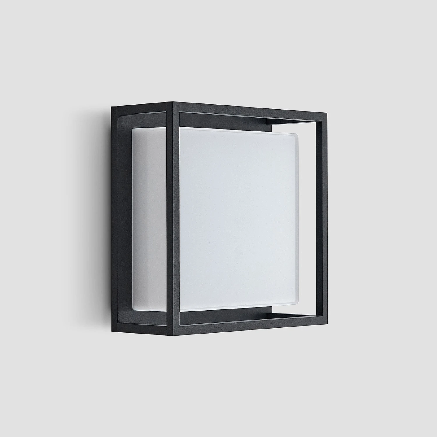 Das grafitfarbene Gestell der LED-Außenwandleuchte Kuga wurde aus Aluminiumdruckguss gefertigt und umschließt den quadratischen Leuchtenschirm wie eine Art Rahmen. Das Material wurde bewusst gewählt, um die Leuchte robust und langlebig zu gestalten. Des Weiteren ist sie dank ihrer Schutzart IP54 gut vor Witterung geschützt.