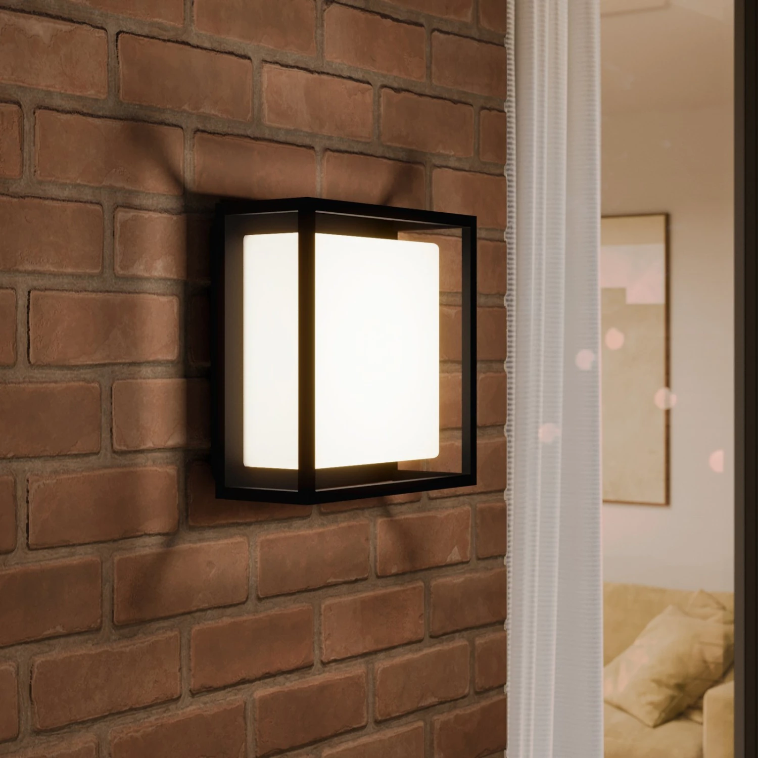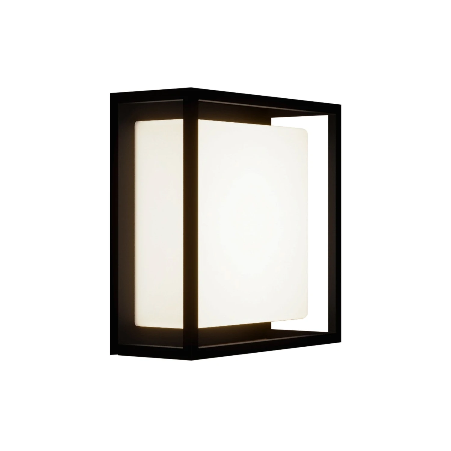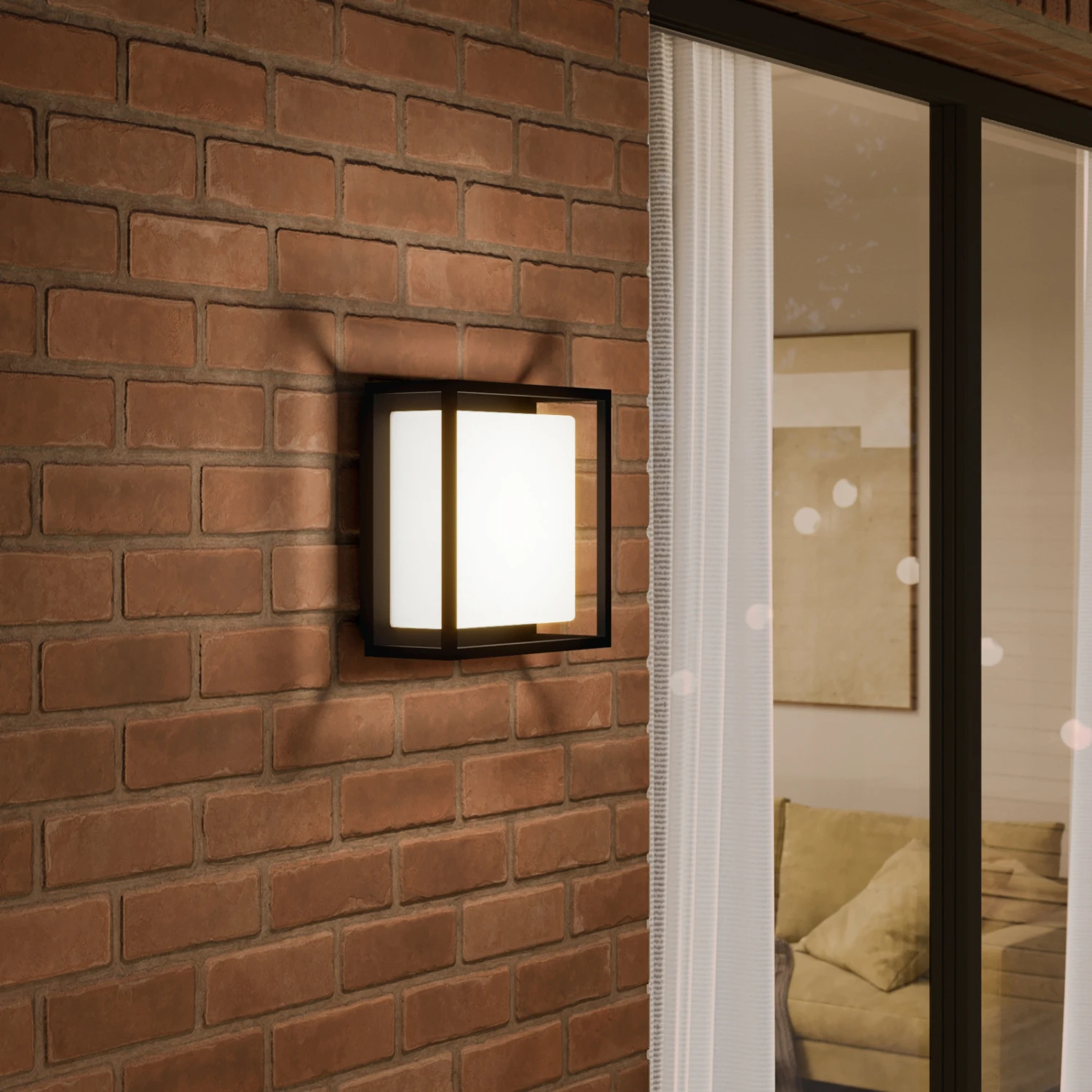 Das grafitfarbene Gestell der LED-Außenwandleuchte Kuga wurde aus Aluminiumdruckguss gefertigt und umschließt den quadratischen Leuchtenschirm wie eine Art Rahmen. Das Material wurde bewusst gewählt, um die Leuchte robust und langlebig zu gestalten. Des Weiteren ist sie dank ihrer Schutzart IP54 gut vor Witterung geschützt.