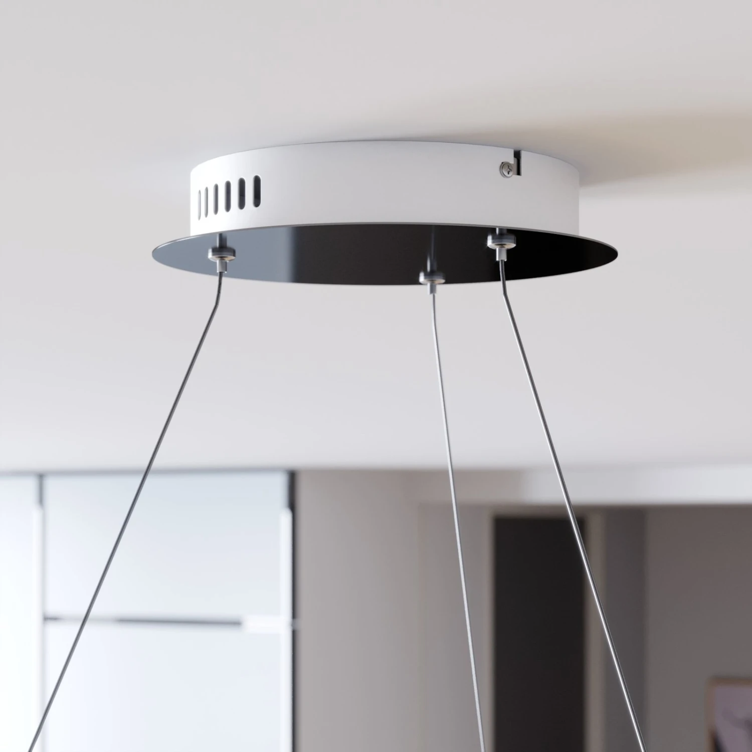 Lyani passt in Küchen und Esszimmer und ist vor allem für moderne Räumlichkeiten eine detaillos-elegante Beleuchtungslösung. Die Leuchtkraft der LEDs ist außerordentlich hoch und bei Bedarf kann man den Wandschalter als Dimmer nutzen und die Helligkeit in drei Stufen regulieren. Die Oberfläche des Metallrings ist glänzend verchromt, was die stilvolle Wirkung der LED-Hängeleuchte verstärkt.