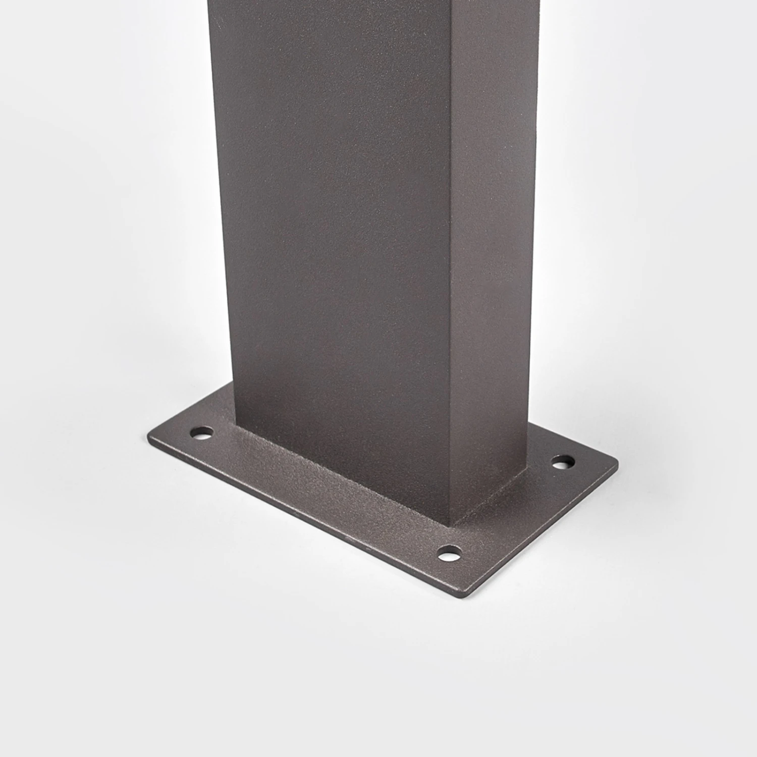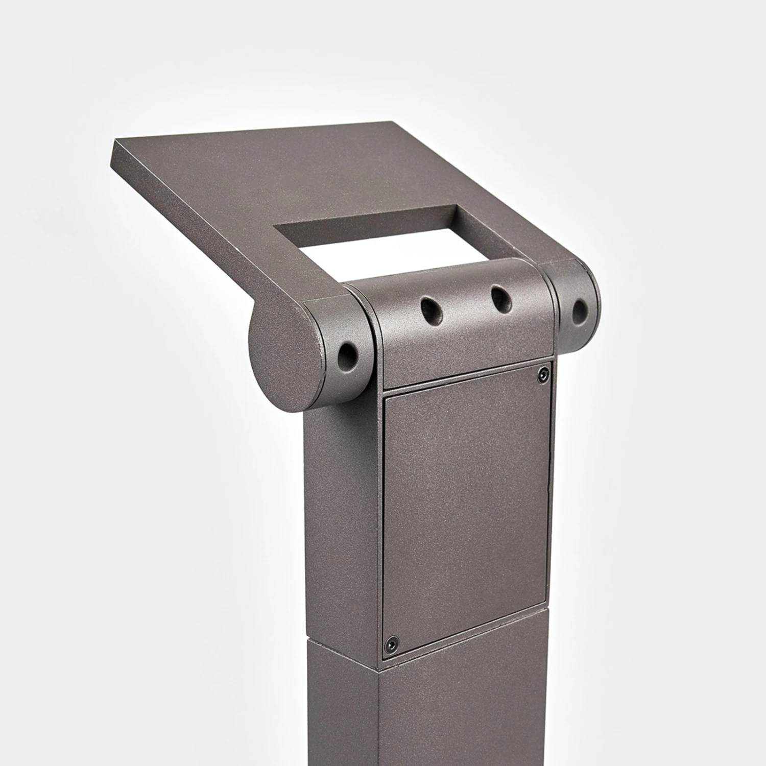 Es ist unschwer zu erkennen, dass die Pollerlampe Marius eher einen modernen Charakter trägt, denn der aus Aluminium bestehende Leuchtenkörper ist grafitgrau lackiert und hat keine auffälligen Details, sondern vermittelt eher einen reduzierten Ausdruck. Der flache Leuchtenkopf ist mit hochwertigen LEDs bestückt, die in einem angenehmen Warmweiß leuchten und ein helles Licht erzeugen. Um den Lichtschein besser ausrichten zu können, ist die LED-Pollerlampe mit einem Gelenk versehen, anhand dessen man den Leuchtenkopf nach oben und unten bewegen kann.
