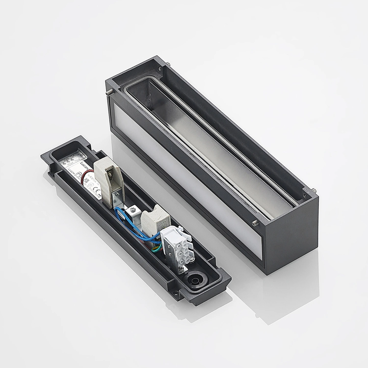 Breit und schmal geformt aus dunkelgrauem Aluminiumdruckguss und an den Flächen seitlich und frontal mit warmen Holzapplikationen geschmückt, stellt die Außenwandleuchte Lengo eine moderne Lichtquelle für die Fassade dar, die sich von einer hellen Wand dekorativ abhebt. Das hinter einer satinierten Glasabdeckung sitzende Leuchtmittel (R7s – nicht enthalten) streut das Licht blendfrei nach unten in Richtung des Bodens. Die Außenwandleuchte Lengo ist mit Schutzart IP65 vor Witterungseinflüssen geschützt und kann deshalb problemlos an allen Fassaden moniert werden.