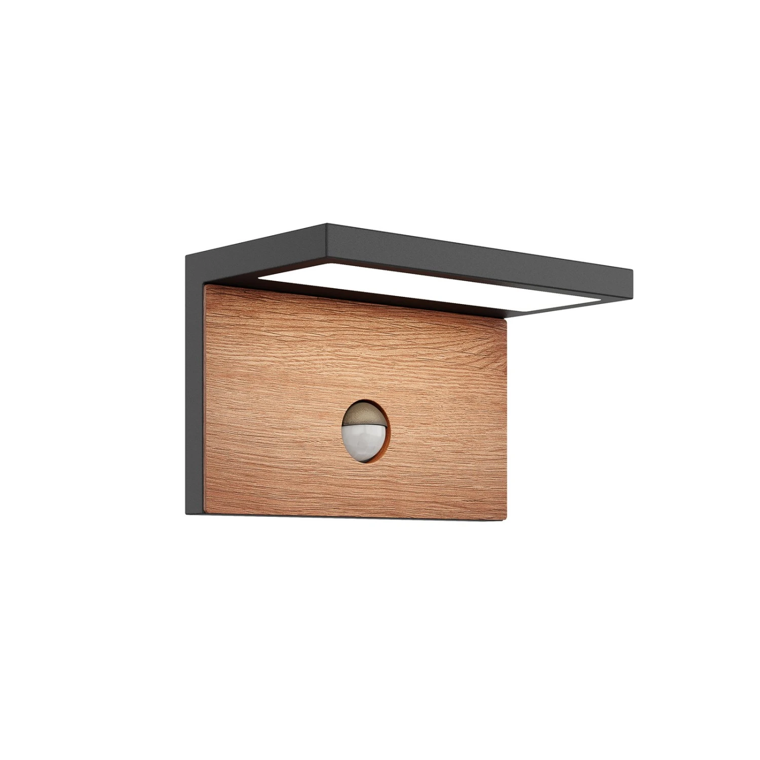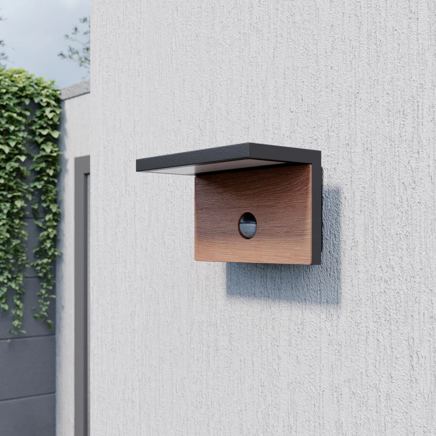 Geradlinige LED-Außenwandleuchte Lignus mit Panel in Holzoptik und technischen Features