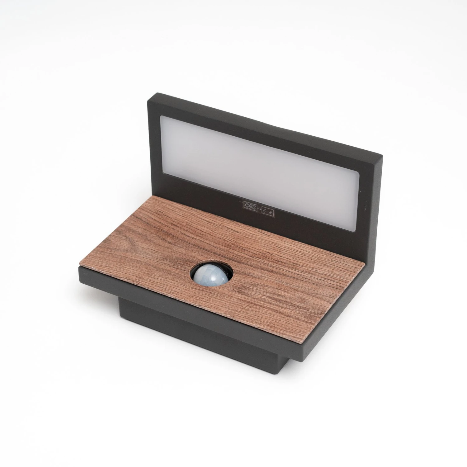 Für das stabile und geradlinige Gestell wurde ein auffallendes Dunkelgrau als Finish gewählt. Als markanter Akzent wurde eine Front in Holzoptik verwendet, die auffallend und kontrastreich wirkt. Deshalb eignet sich diese besondere Leuchte vor allem für modern gestaltete Außenbereiche.