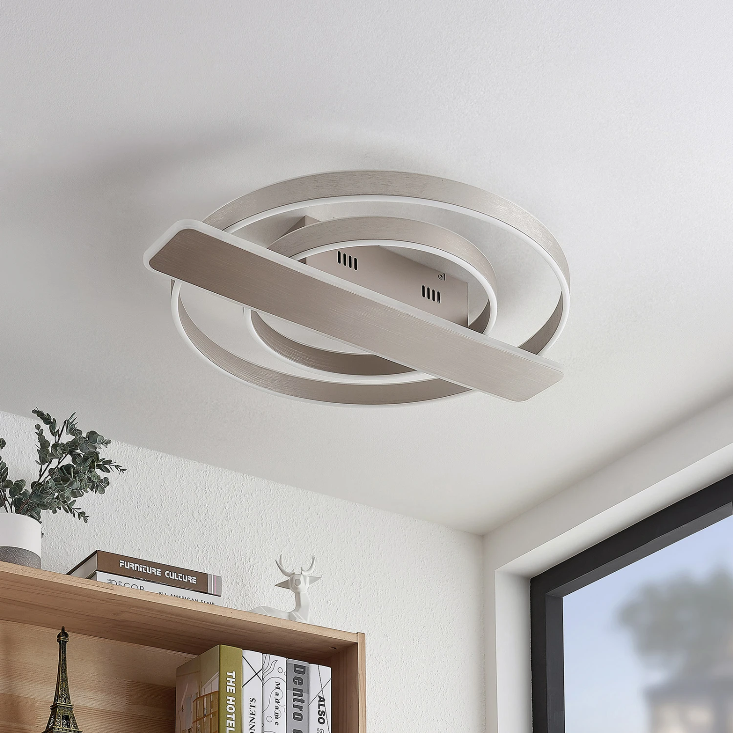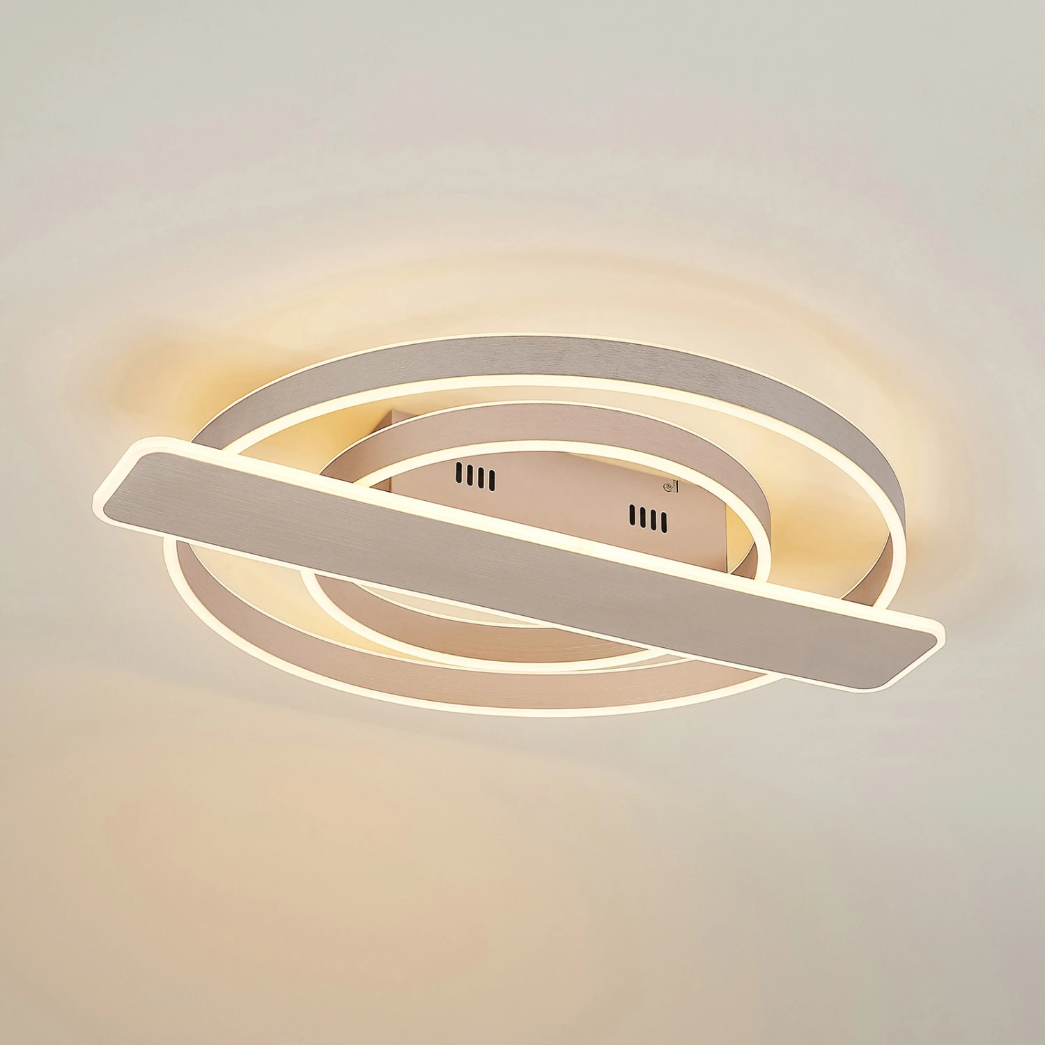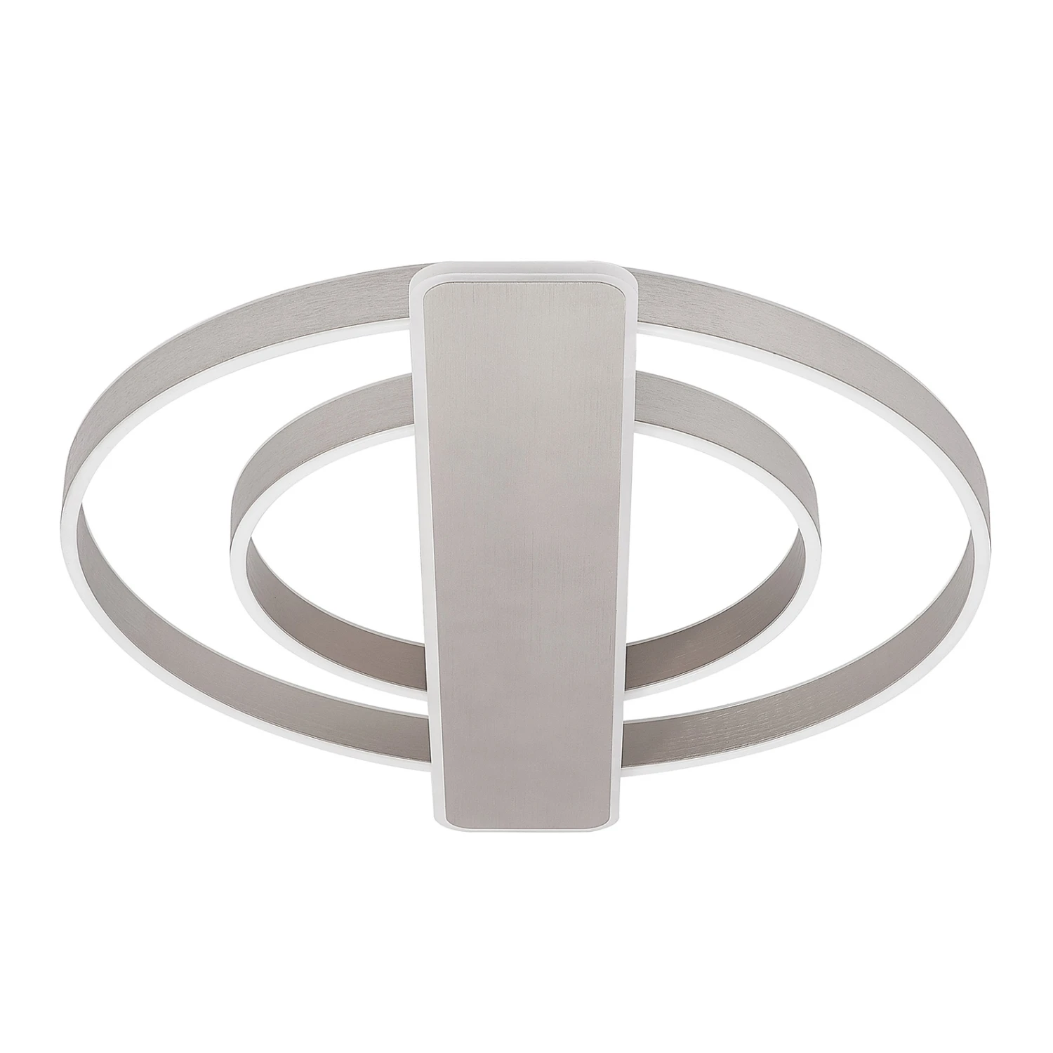 LED-Deckenleuchte Linetti – dimmbar über Wandschalter Das nickelfarbene Gerüst der Deckenlampe Linetti ist aus Aluminium und Eisen, die Abdeckungen über den LEDs aus Silikon gefertigt. Die beiden unterschiedlich großen Leuchtkreise sind durch ein ebenfalls mit LEDs besetztes Rechteck unterbrochen, das zentral über der Kabelabdeckung sitzt. Durch einen Wandschalter ist es möglich, die Leuchte wie gewohnt ein- und auszuschalten. Durch die 3-Stufen-Dimmtechnik mit integrierter Off-Funktion lässt sie sich zudem durch mehrmaliges Betätigen des Schalters in drei unterschiedlichen Stufen ihrer Helligkeit dimmen: 100 %, 50 % und 10 %.