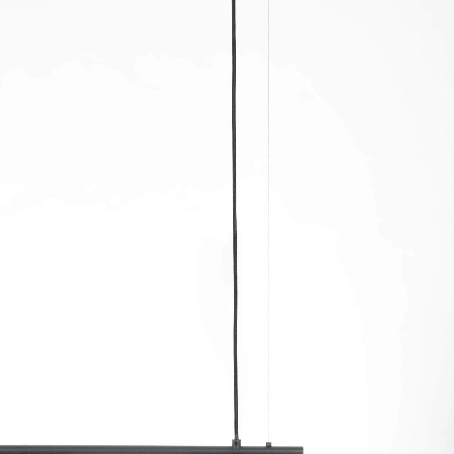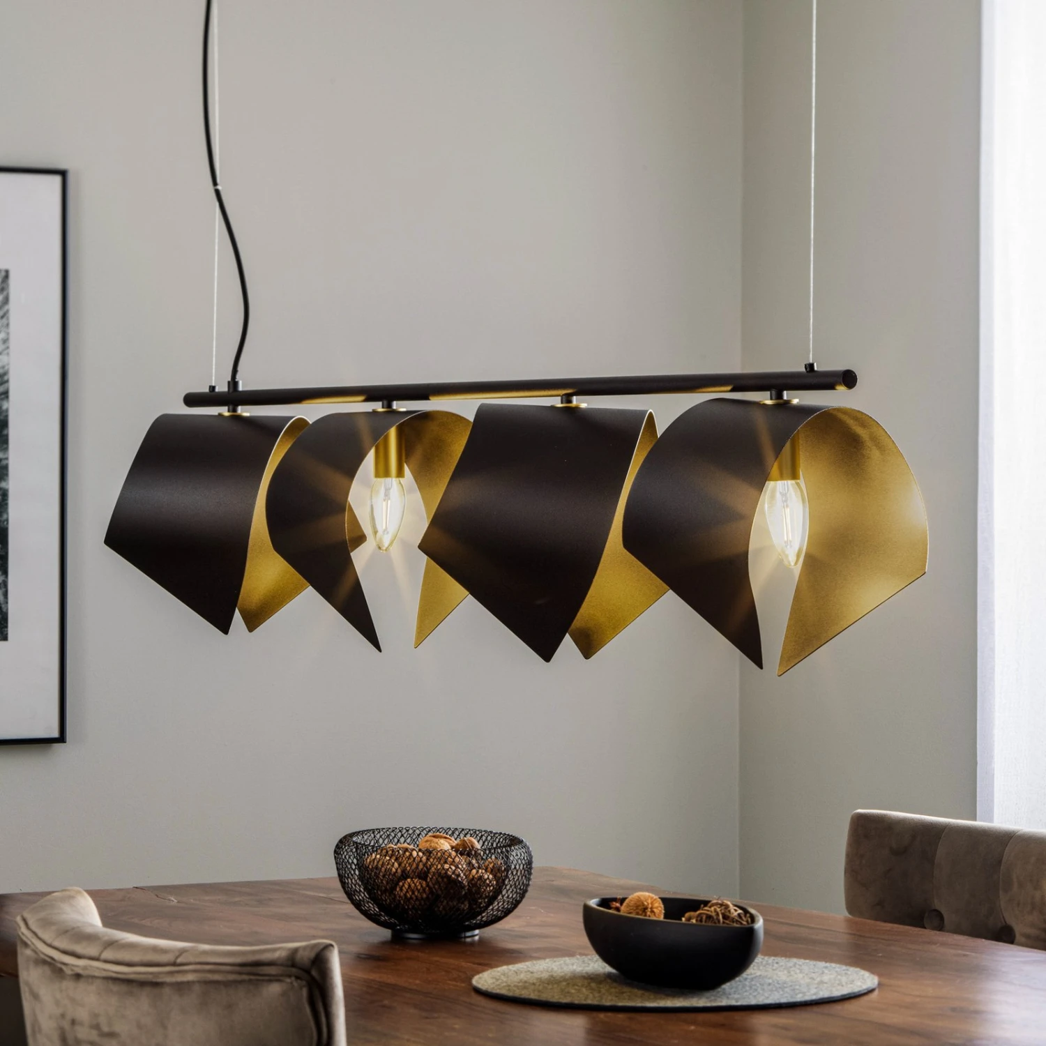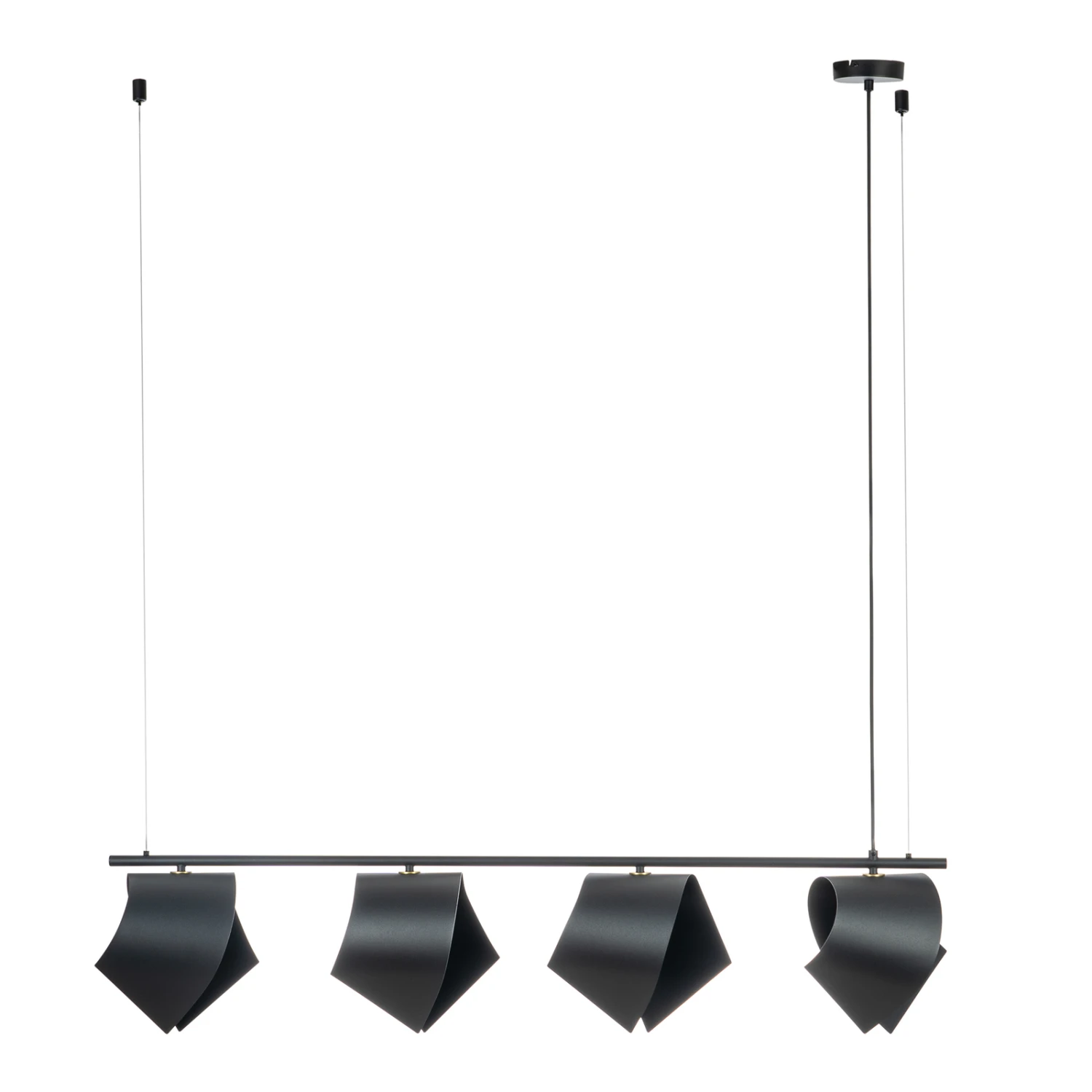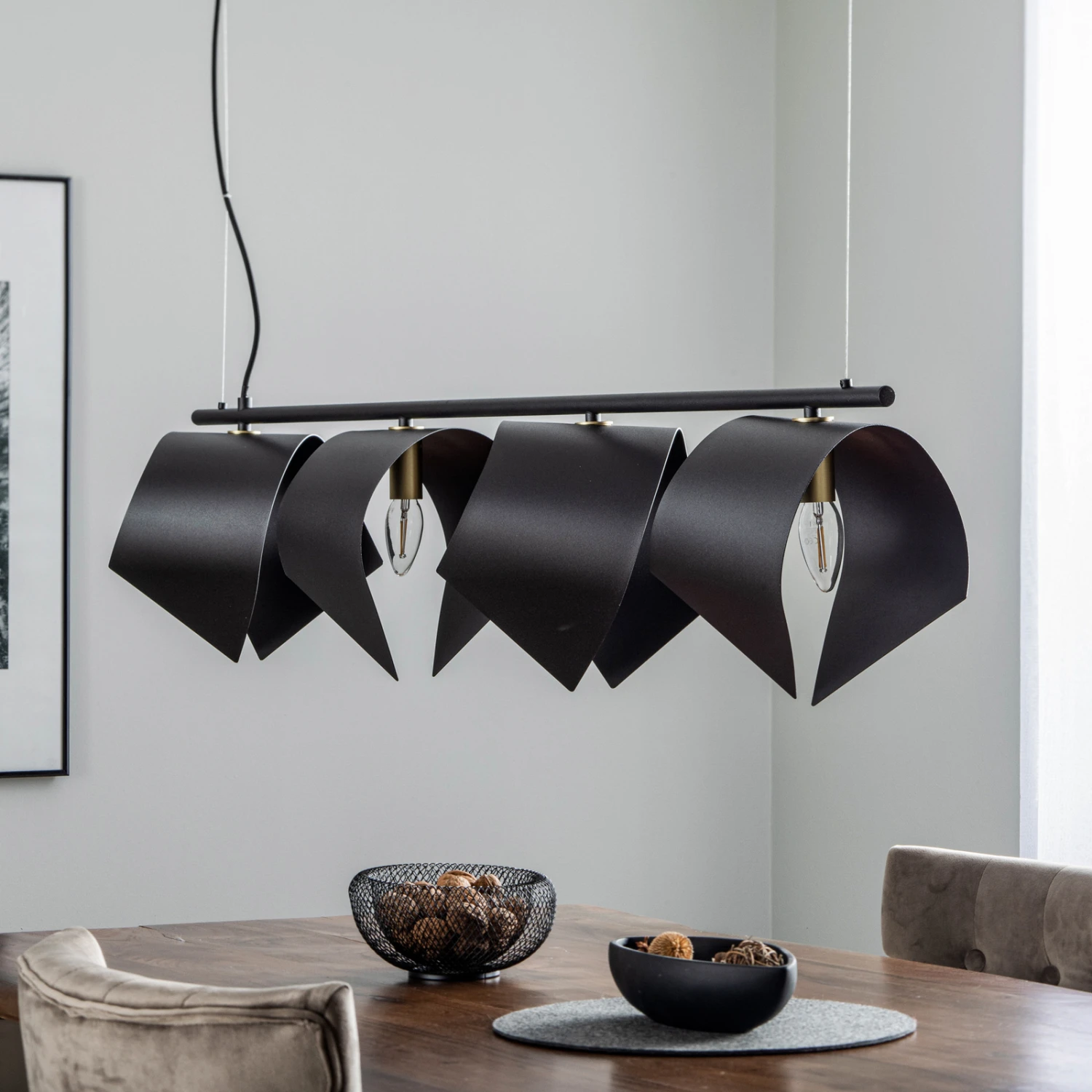 Mikolay ist ein zuverlässiger Lichtspender und ein attraktives Dekorationsstück für den Innenbereich. Die Hängelampe hängt an einer Aufhängung und besteht aus einer länglichen Strebe, die horizontal vier Leuchtenschirme trägt. Diese Schirme besitzen ein besonderes Design aus gebogenen Elementen und können mit entsprechenden Leuchtmitteln bestückt werden. Die längliche Form der Hängeleuchte Mikolay eignet sich hervorragend für eine Installation über einem Tisch und sorgt für eine angenehme Beleuchtung während des Essens. Sie besteht darüber hinaus aus Stahl und präsentiert sich in einer stimmigen, sandschwarzen Farbgebung. Die Idee des Stils der Leuchte entstammt dem Portfolio von Ingo Thiele.