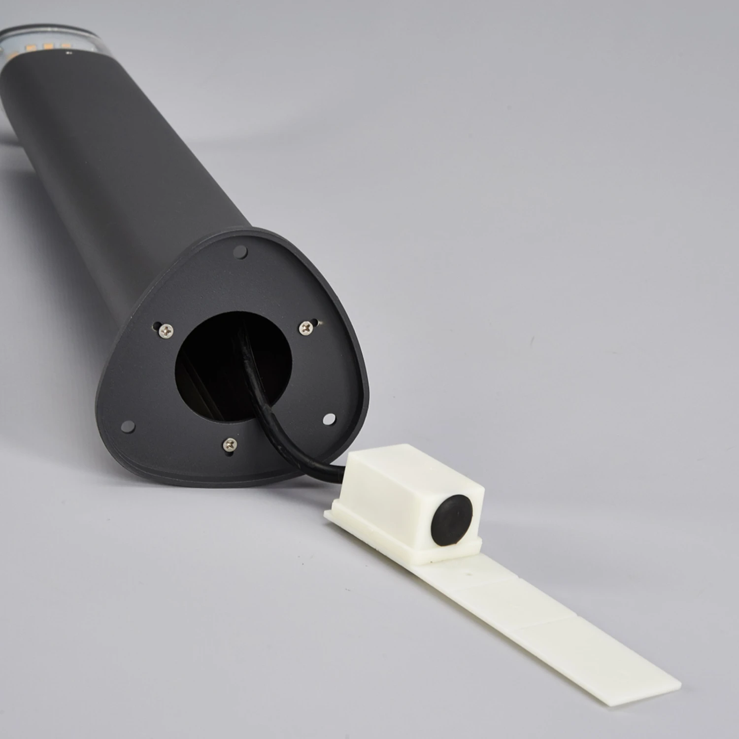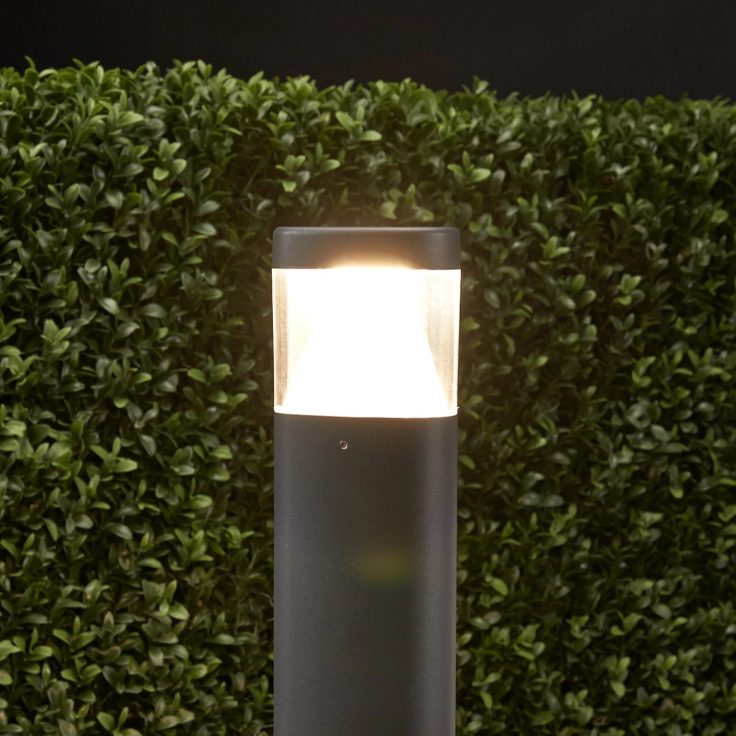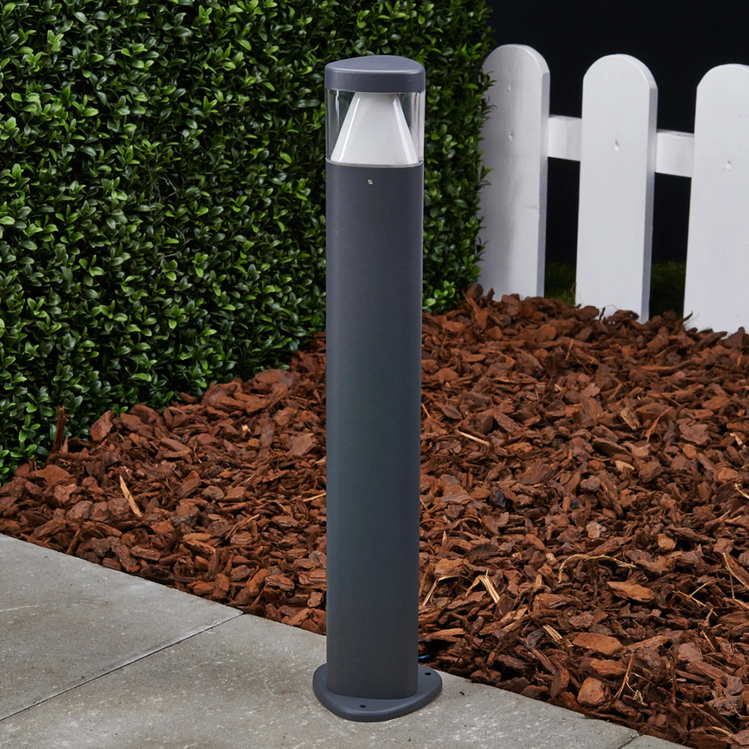 Die Sockelleuchte Milou ist aus Aluminium-Druckguss gefertigt und präsentiert sich in zeitgemäßer Optik. Die Oberfläche des dreikantigen Aluminium-Korpus ist anthrazitfarben lackiert, im oberen Teil befindet sich ein Einsatz aus Polycarbonat, hinter dem das leuchtstarke LED-Leuchtmittel von Osram sitzt.