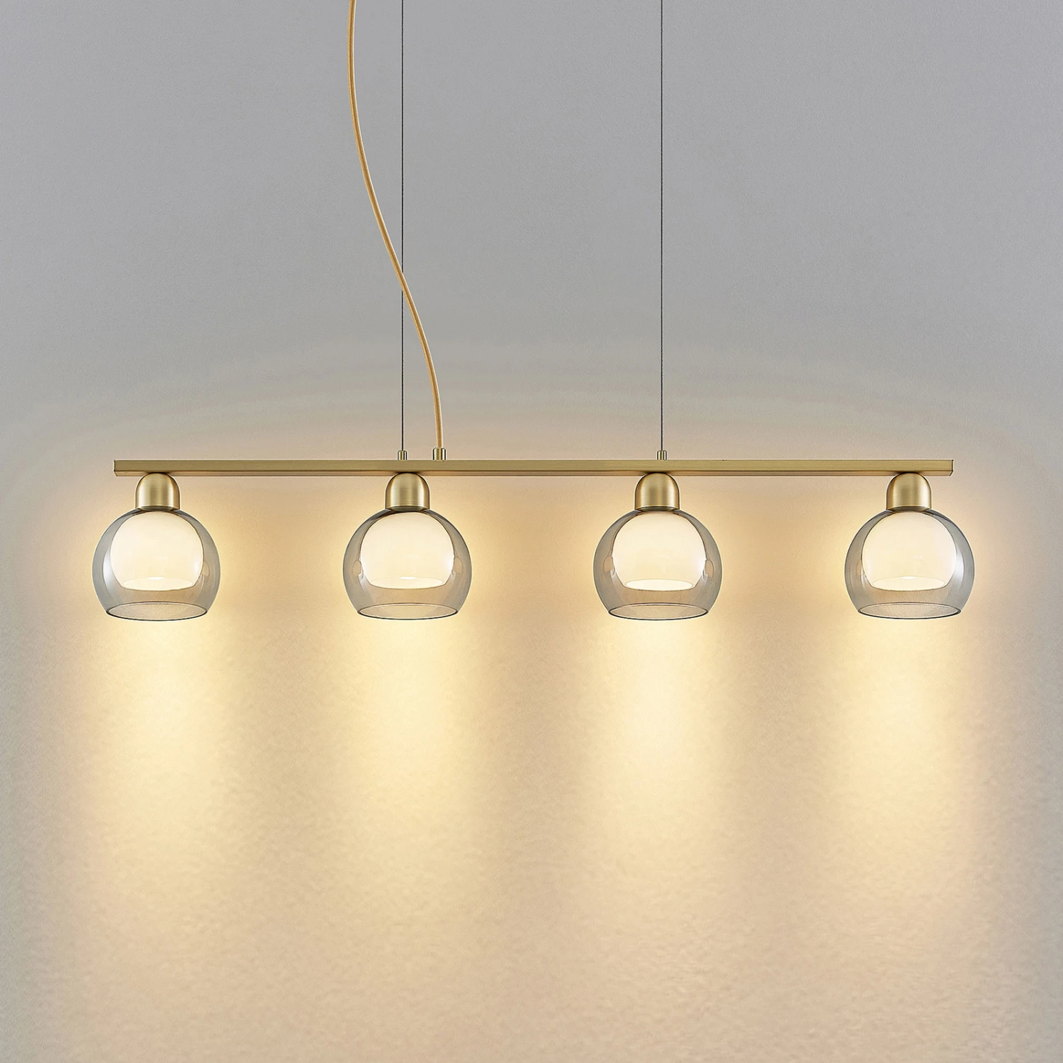 Wer auf der Suche nach einer besonderen Innenbeleuchtung ist, wird mit Mylah nicht enttäuscht. Die Hängelampe besteht aus Eisen und trägt vier Leuchtenschirme, die sich jeweils aus zwei Schirmen zusammensetzen, die in weißer und rauchiger Farbe gehalten sind. Da die Hängeleuchte Mylah mit entsprechenden Leuchtmitteln bestückt werden kann, kann hier die Lichtintesität und Lichtfarbe an die persönlichen Bedürfnisse angepasst werden. Das längliche Design der Leuchte eignet sich hervorragend für die Installation in einem Esszimmer über einem Esstisch und sorgt für die nötige Beleuchtung beim abendlichen Abendessen.