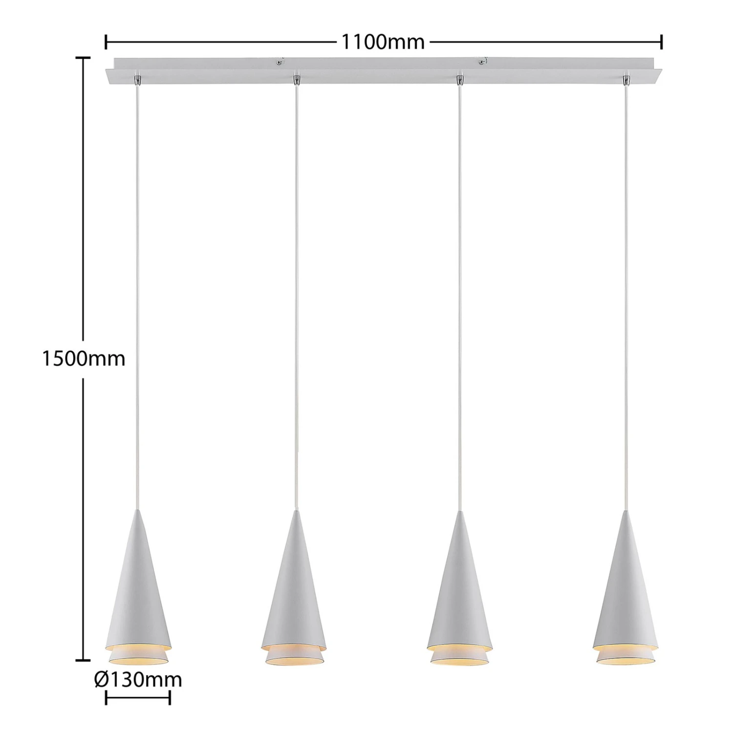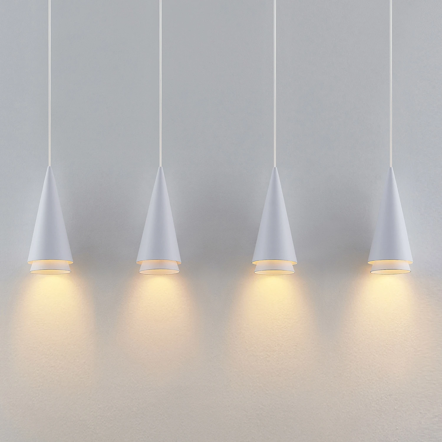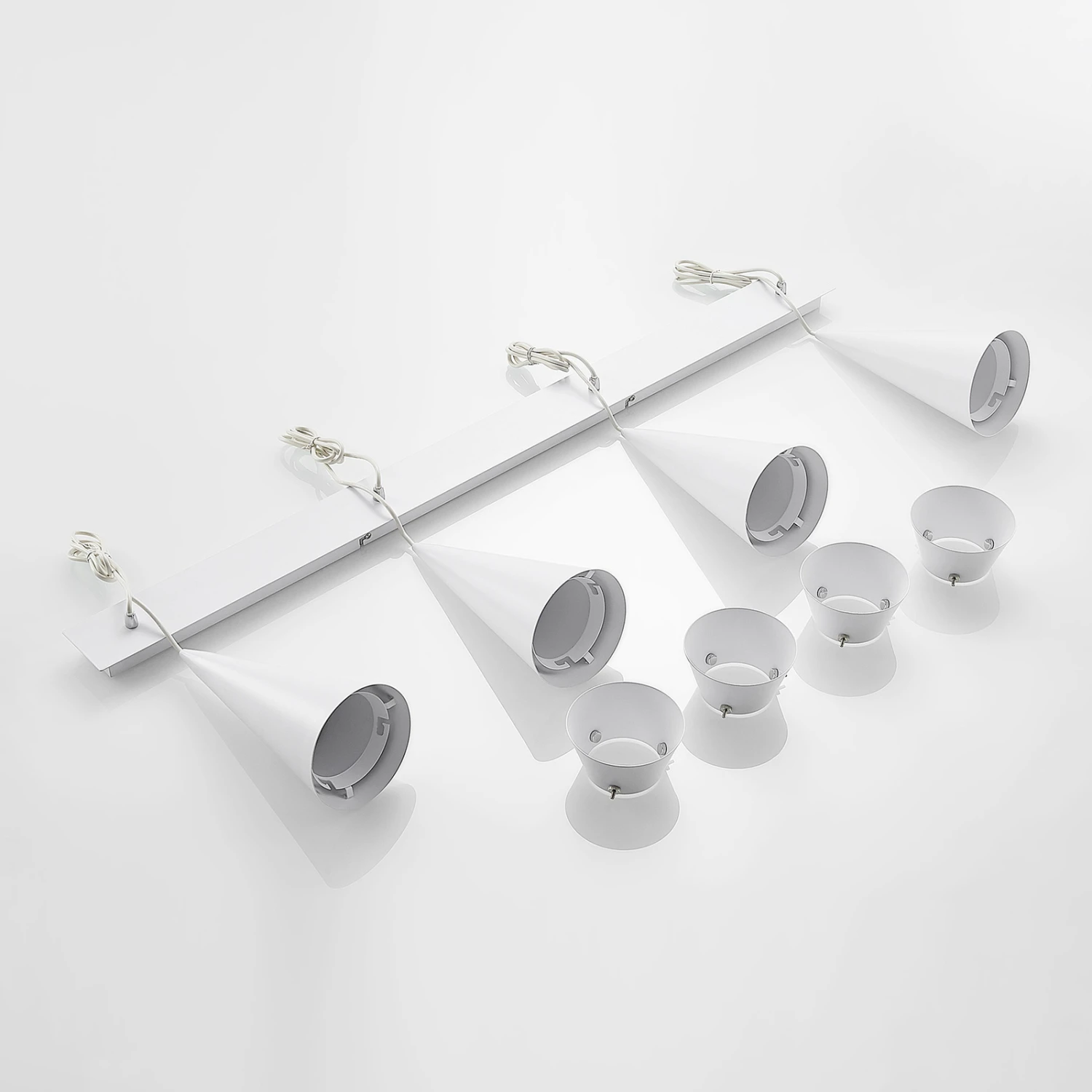 Vierflammige Balkenpendellampe Naoh mit Kegelschirmen in Weiß – ideal fürs Esszimmer