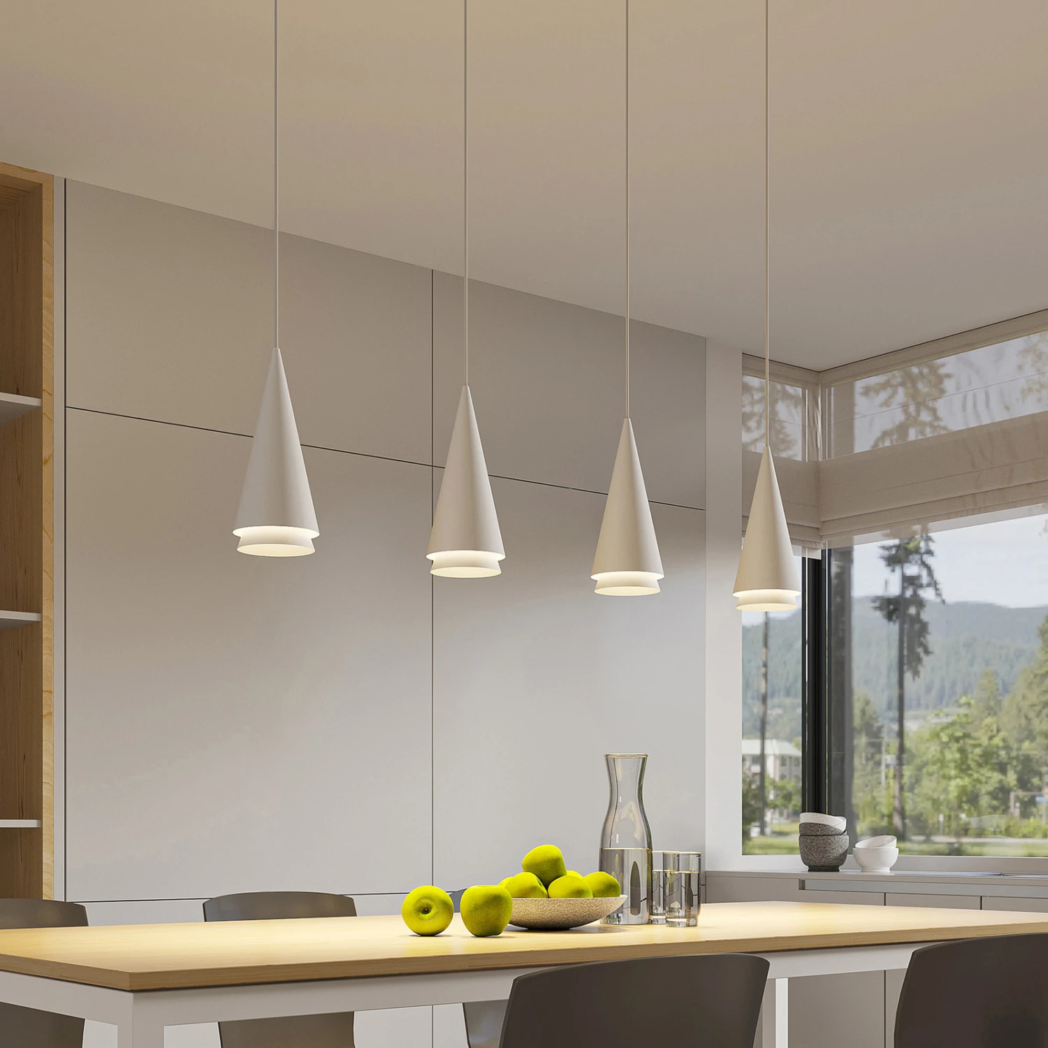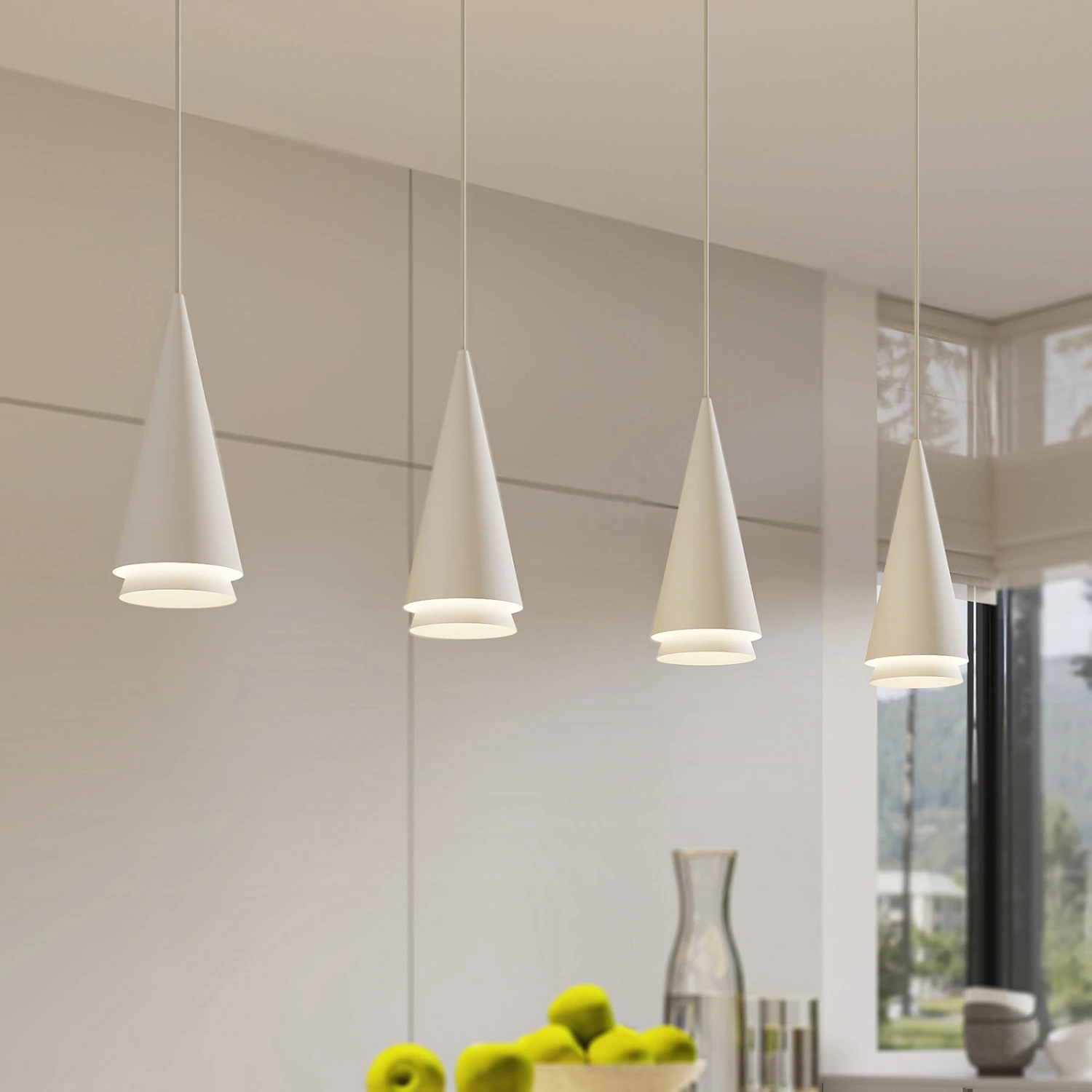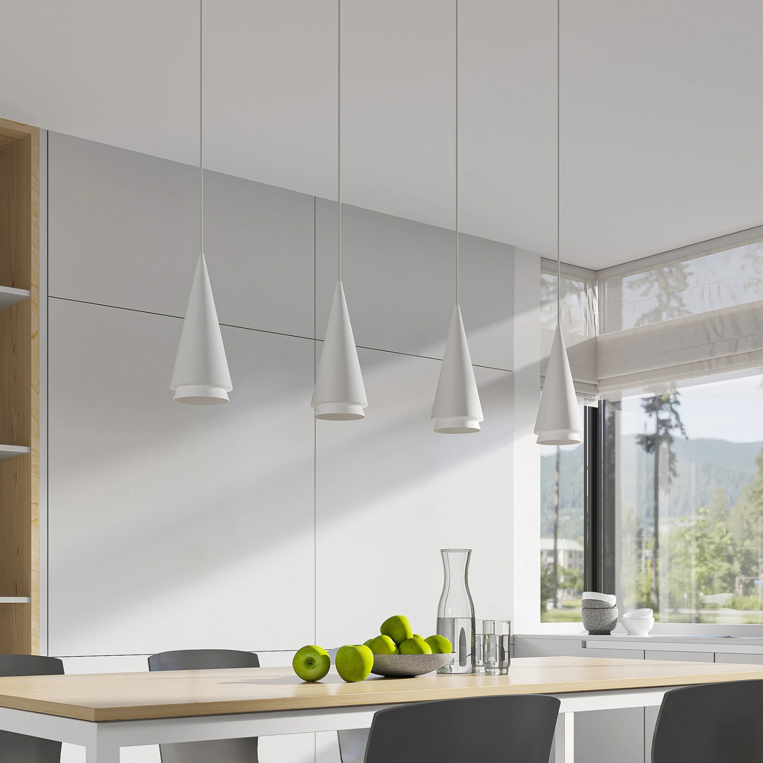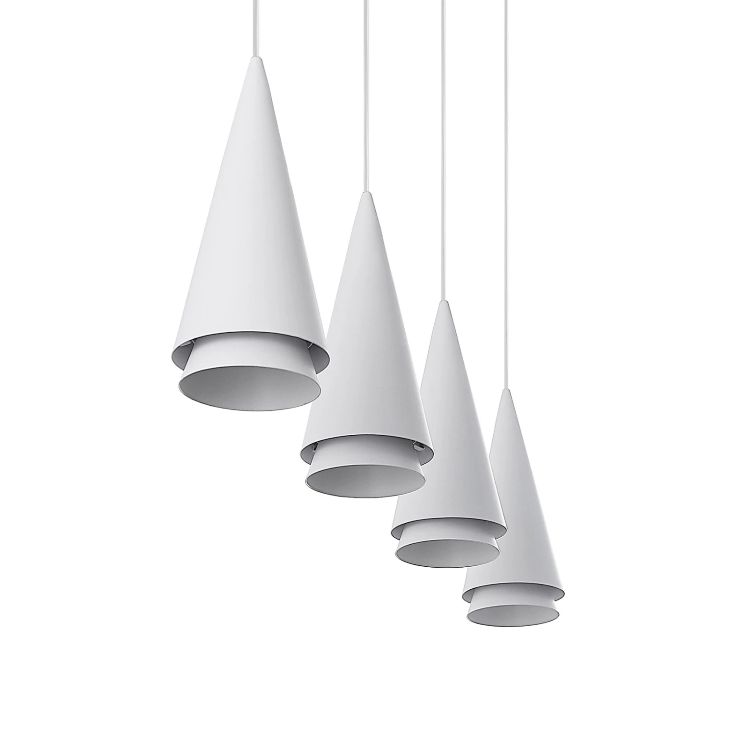 Vierflammige Balkenpendellampe Naoh mit Kegelschirmen in Weiß – ideal fürs Esszimmer