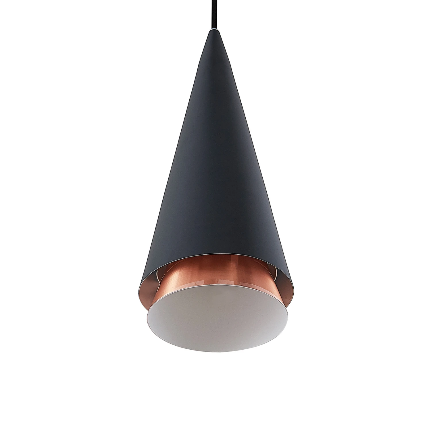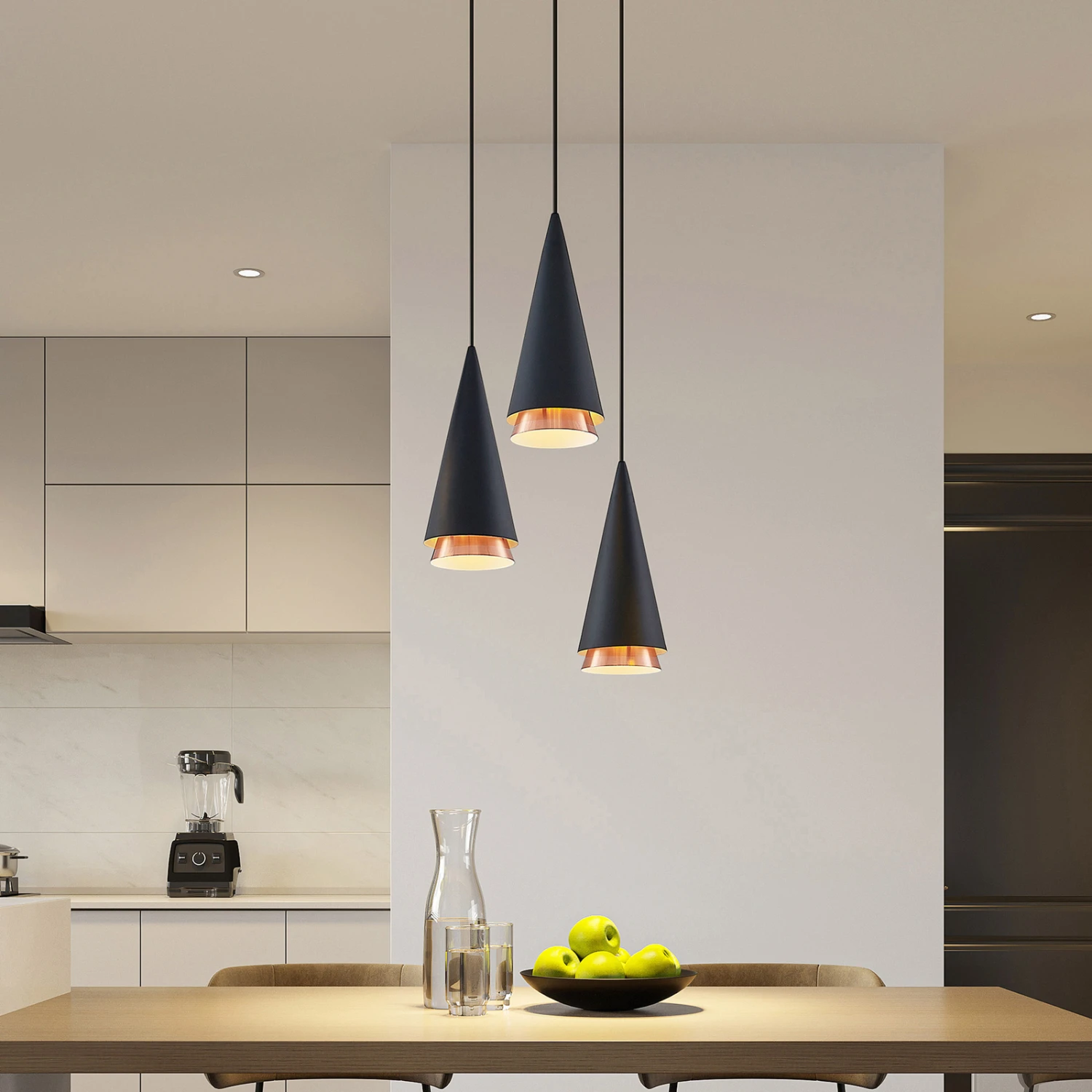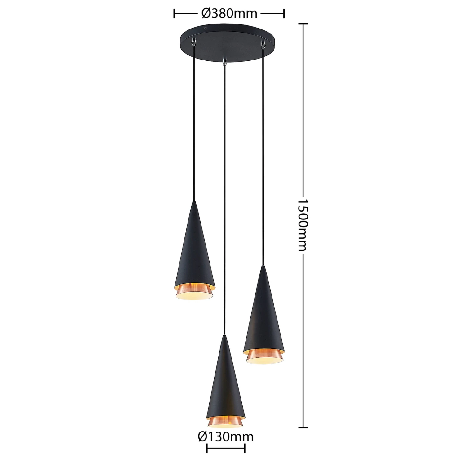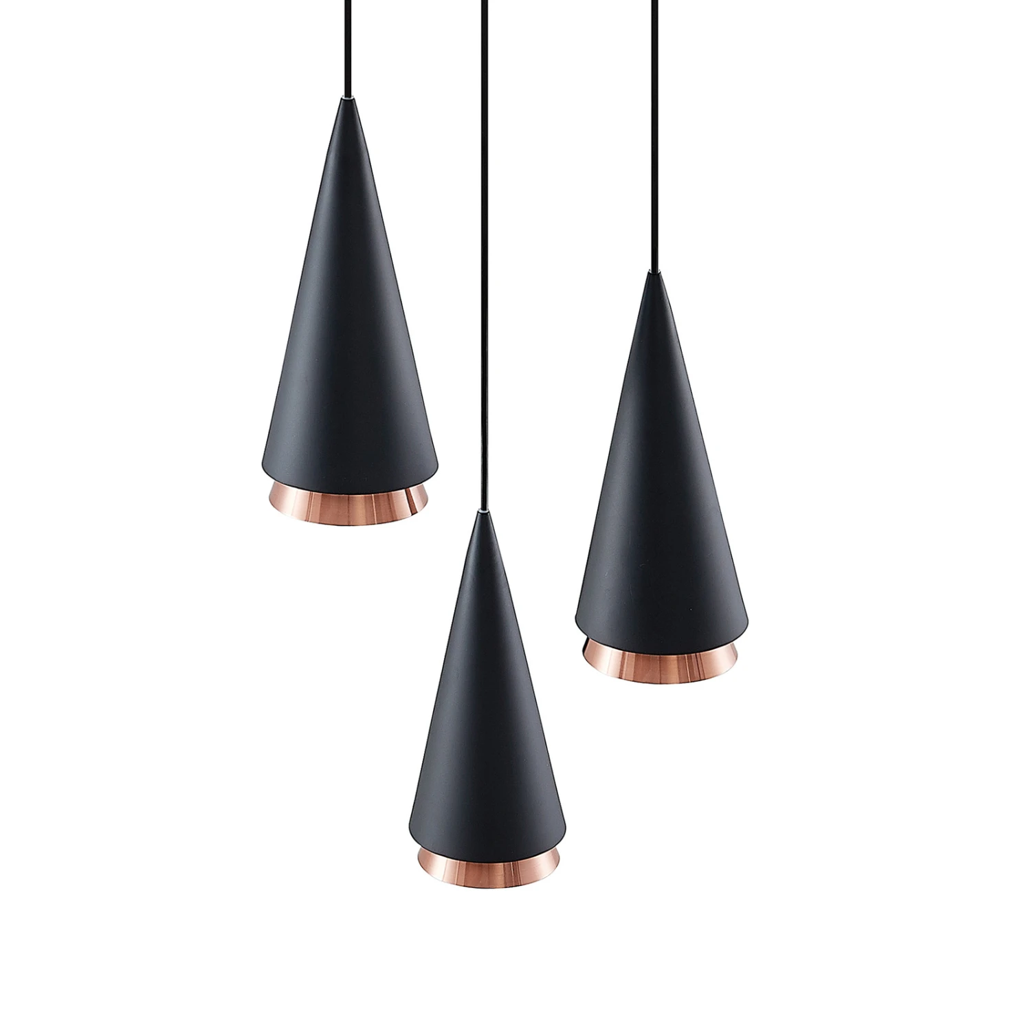 Dreiflammige Pendelleuchte Naoh mit schwarzen Kegelschirmen und kupferfarbenen Details