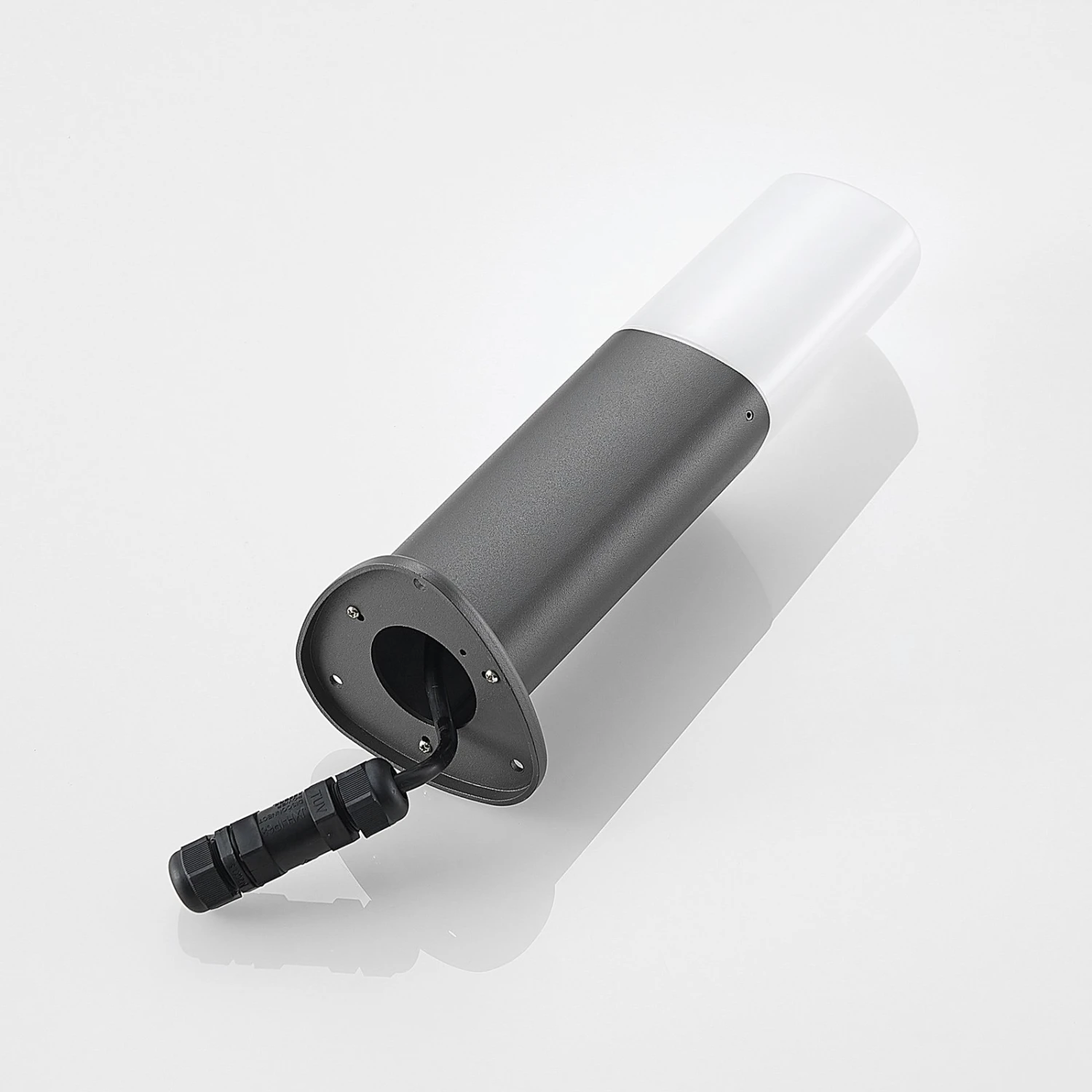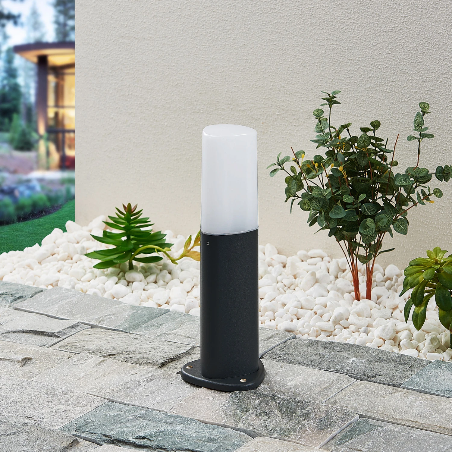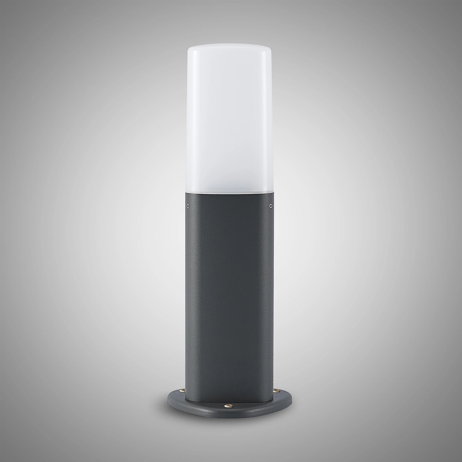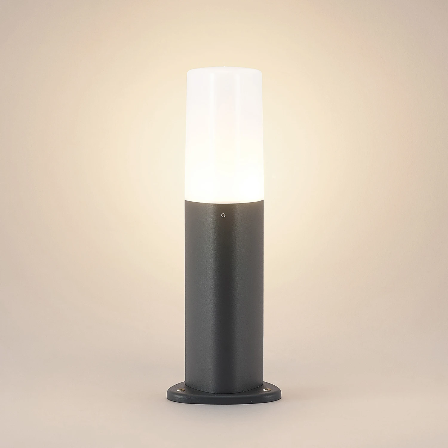 Das moderne Design der Sockelleuchte Obbie ist geprägt von der dreieckigen Säulenform, die mit sanften Rundungen aufwarten kann. Der untere Teil und das Gestell sind aus dunkelgrauem Aluminiumdruckguss, der Lampenschirm oben ist aus opalweißem Kunststoff. Dieser sorgt dafür, dass das Licht des einzusetzenden Leuchtmittels gleichmäßig in die Umgebung abgegeben wird. Gerade im Bereich von Terrassen oder in der Nähe des Hauseingangs ideal für eine sichere Beleuchtung und ein sanftes Geleit bei Dunkelheit.