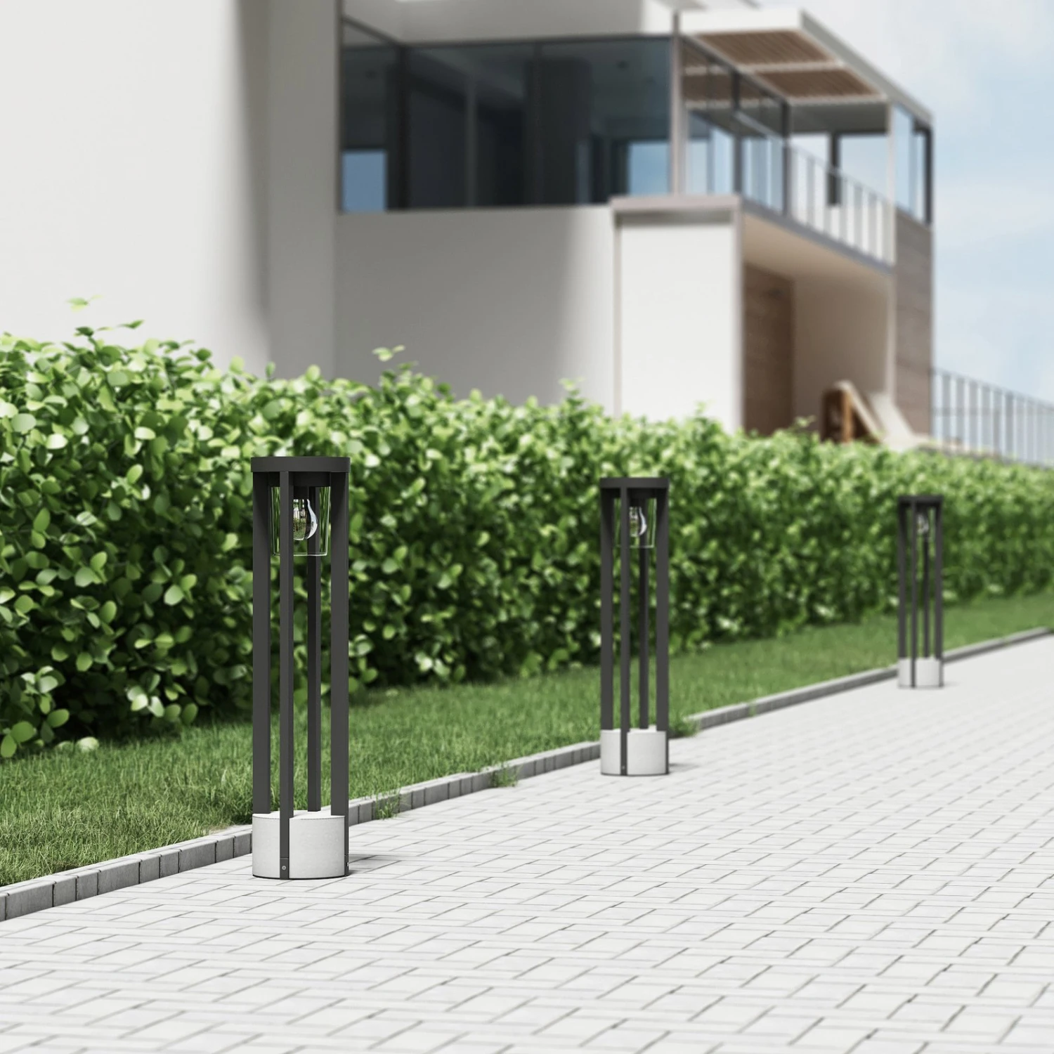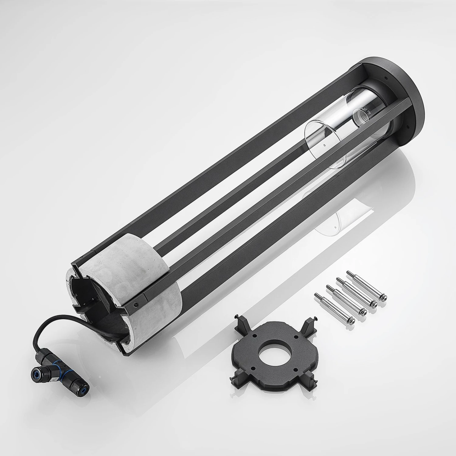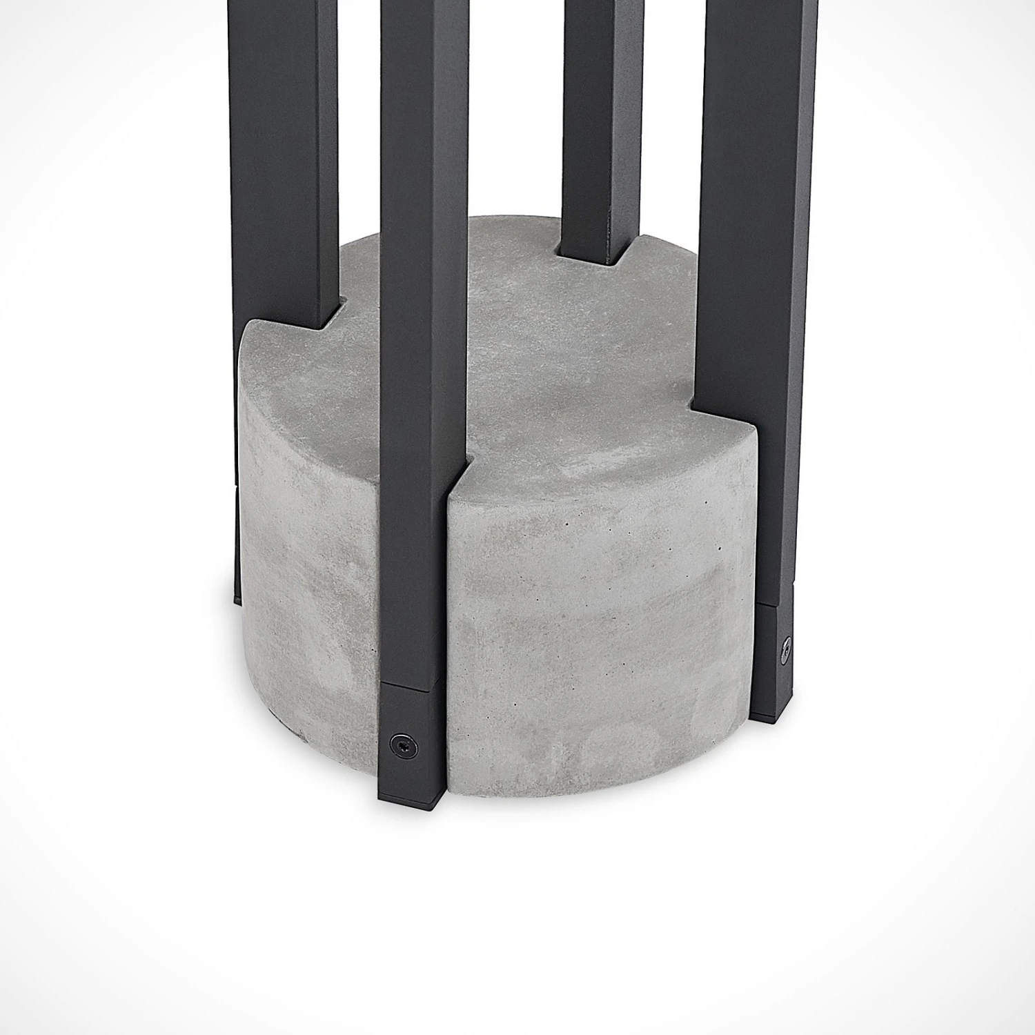 Die Wegeleuchte Overa überrascht mit einem besonderen Design und einer gelungenen Kombination aus unterschiedlichen Materialien. Das Gehäuse wurde gänzlich aus Aluminium hergestellt und mit einem dunkelgrauen Oberflächenfinish überzogen. Der Sockel der Leuchte besteht aus Zement und sorgt dafür, dass Overa stabil auf dem Boden steht.