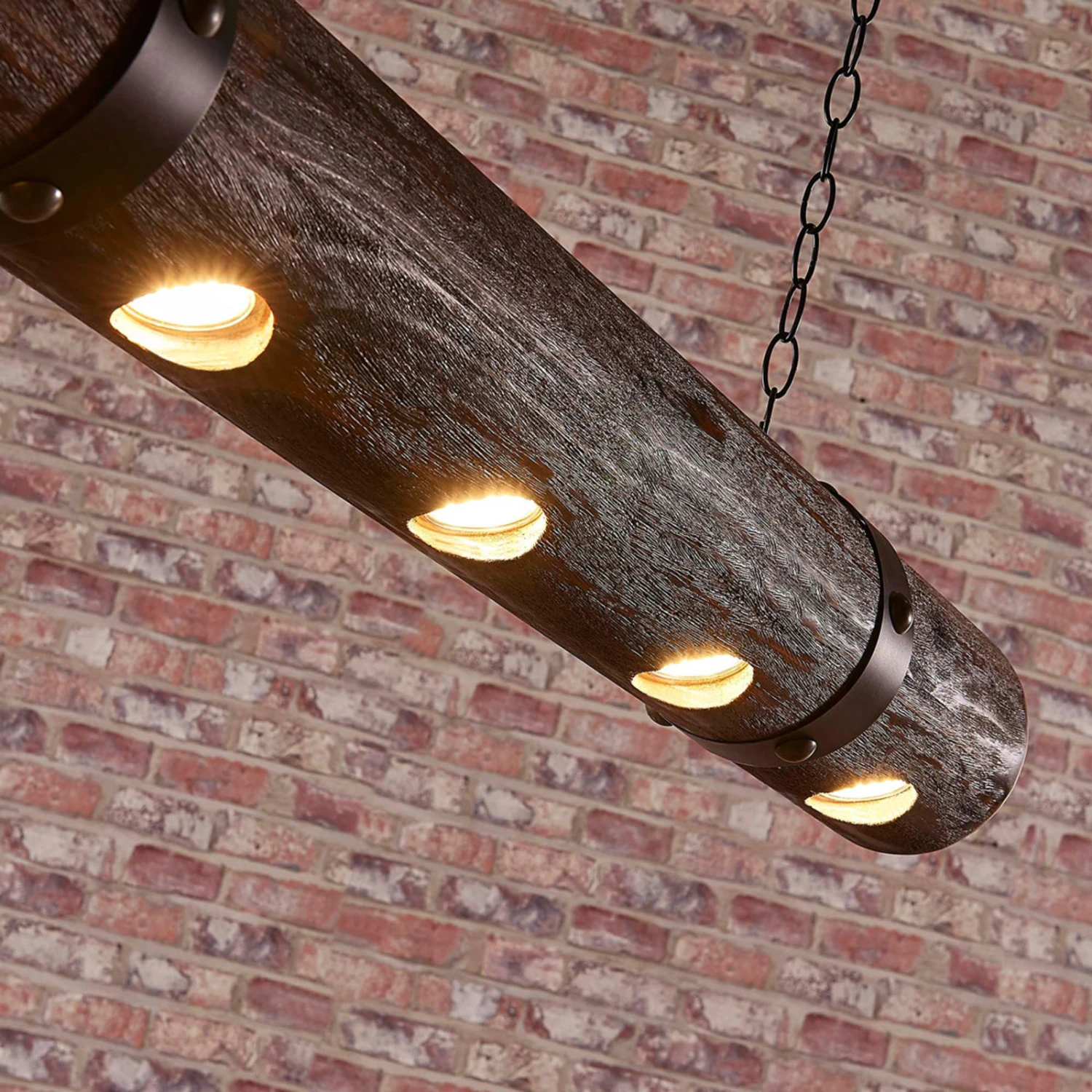 Das Besondere an dieser Pendelleuchte: Sie ist aus einem echten Holzstamm gefertigt! Zusammen mit der dunklen Tönung des Holzes und der massiven Kettenaufhängung entsteht dadurch eine besonders rustikale Wirkung. Diese ist zum Beispiel in gemütlichen Landhausumgebungen stets sehr willkommen und auch im gastronomischen Bereich, wo rustikale Behaglichkeit zum gelebten Stil zählt, wie etwa in urigen Almhütten, kann die Holz-Pendelleuchte Legno eine echt tolle Ergänzung darstellen, die das bestehende Ambiente stilecht untermalt.
