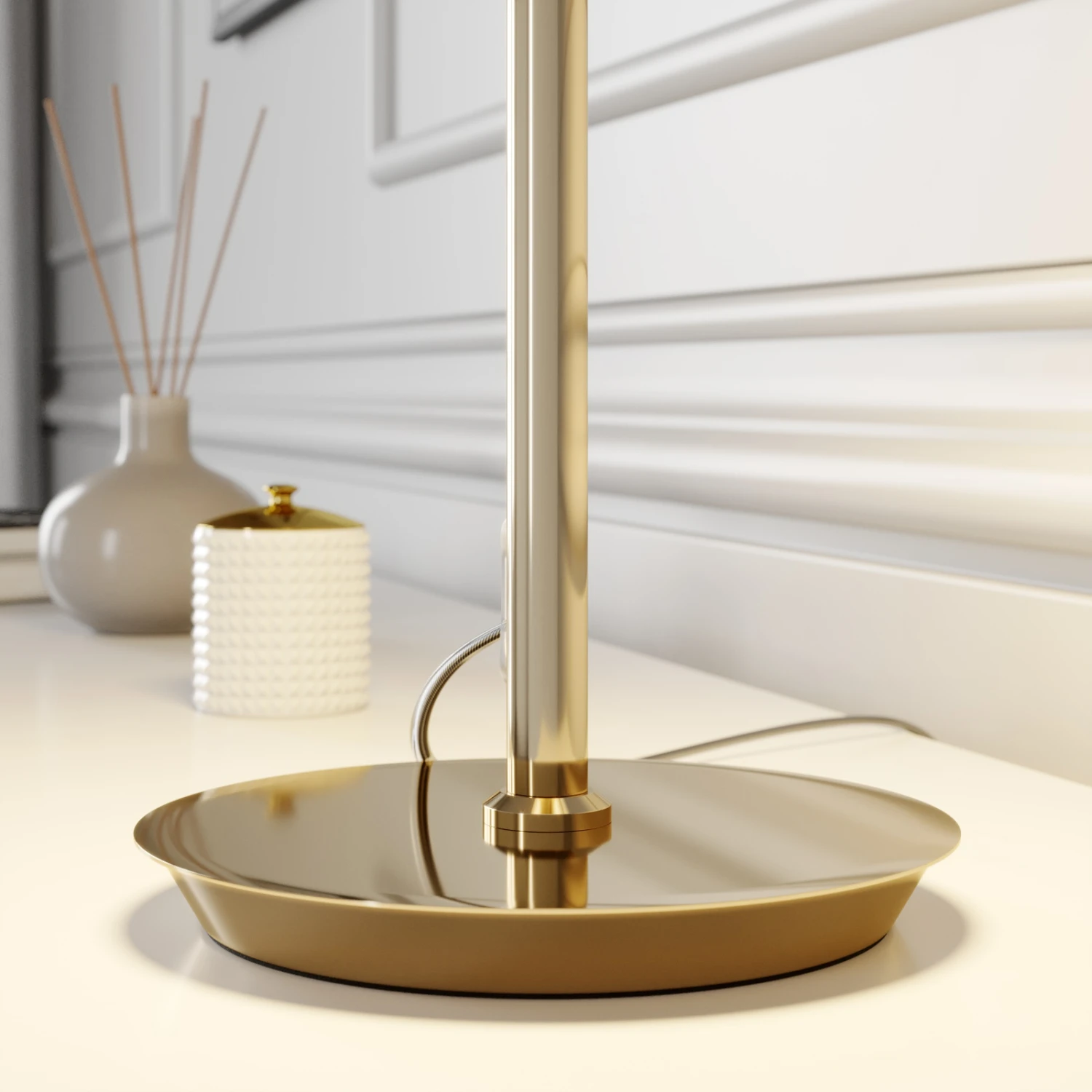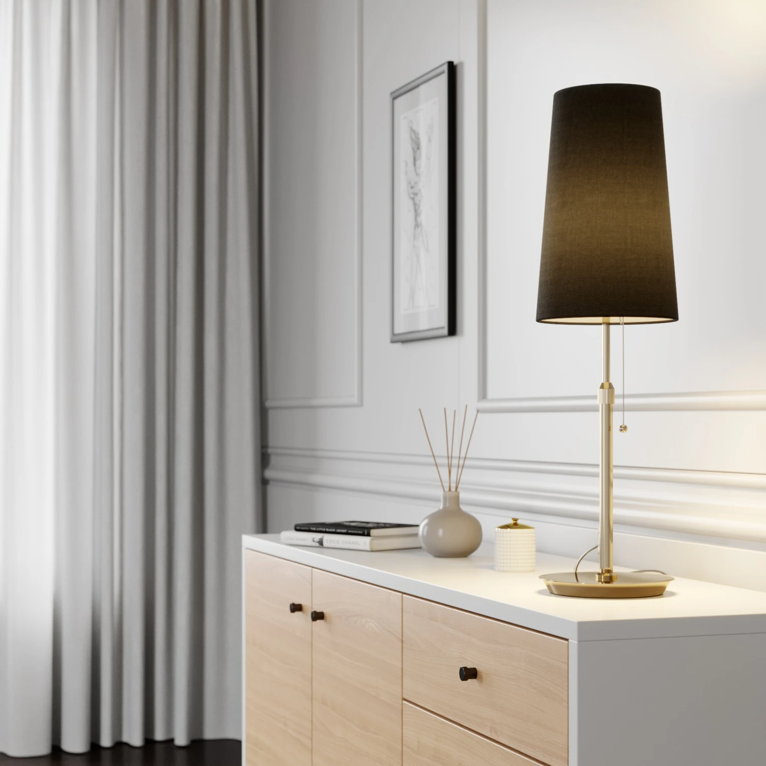 Pordis passt mit dem Gestell in Messing sehr gut zu klassisch wirkenden Einrichtungen. Der schwarze Stoffschirm ergänzt das Gesamtdesign der Tischlampe auf stilvolle, passende Weise und sorgt für abgedämpften Lichtschein mit behaglicher Wirkung, so dass man Pordis gut als Akzentbeleuchtung im Wohnbereich einsetzen kann, wenn die Gemütlichkeit in den Vordergrund rücken soll und strahlend helles Licht nicht mehr dringend benötigt wird. Über ein Teleskopgestänge lässt sich die Höhe des Gestells von 61 cm bis 70,5 cm einstellen und somit an die Gegebenheiten vor Ort anpassen. Mit diesem recht hohen Maß eignet sich die Tischlampe Pordis auch als Hockerleuchte sehr gut. Eingeschaltet wird die Leuchte über einen Zugschalter, der edel wirkt und das gesamte Design passend ergänzt.