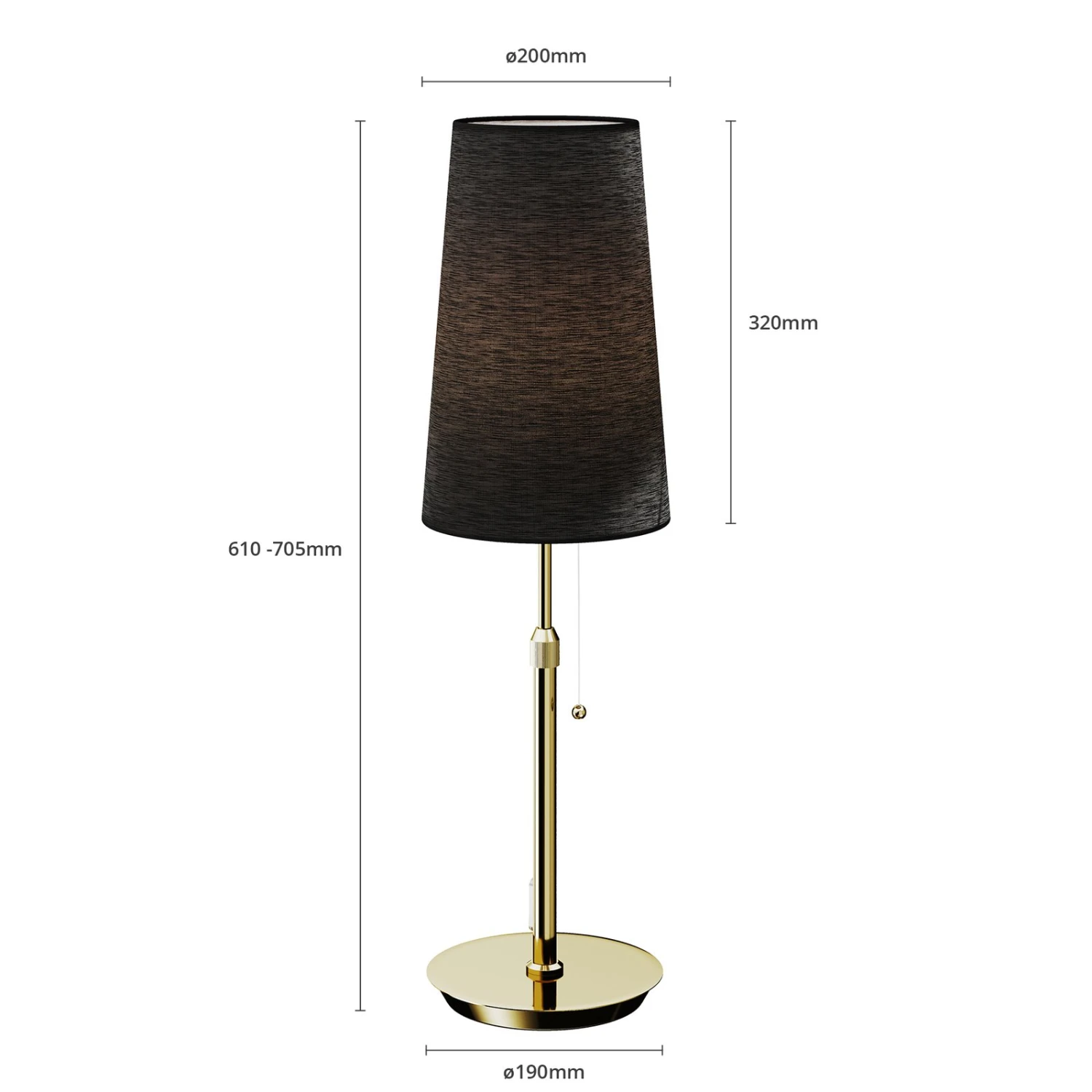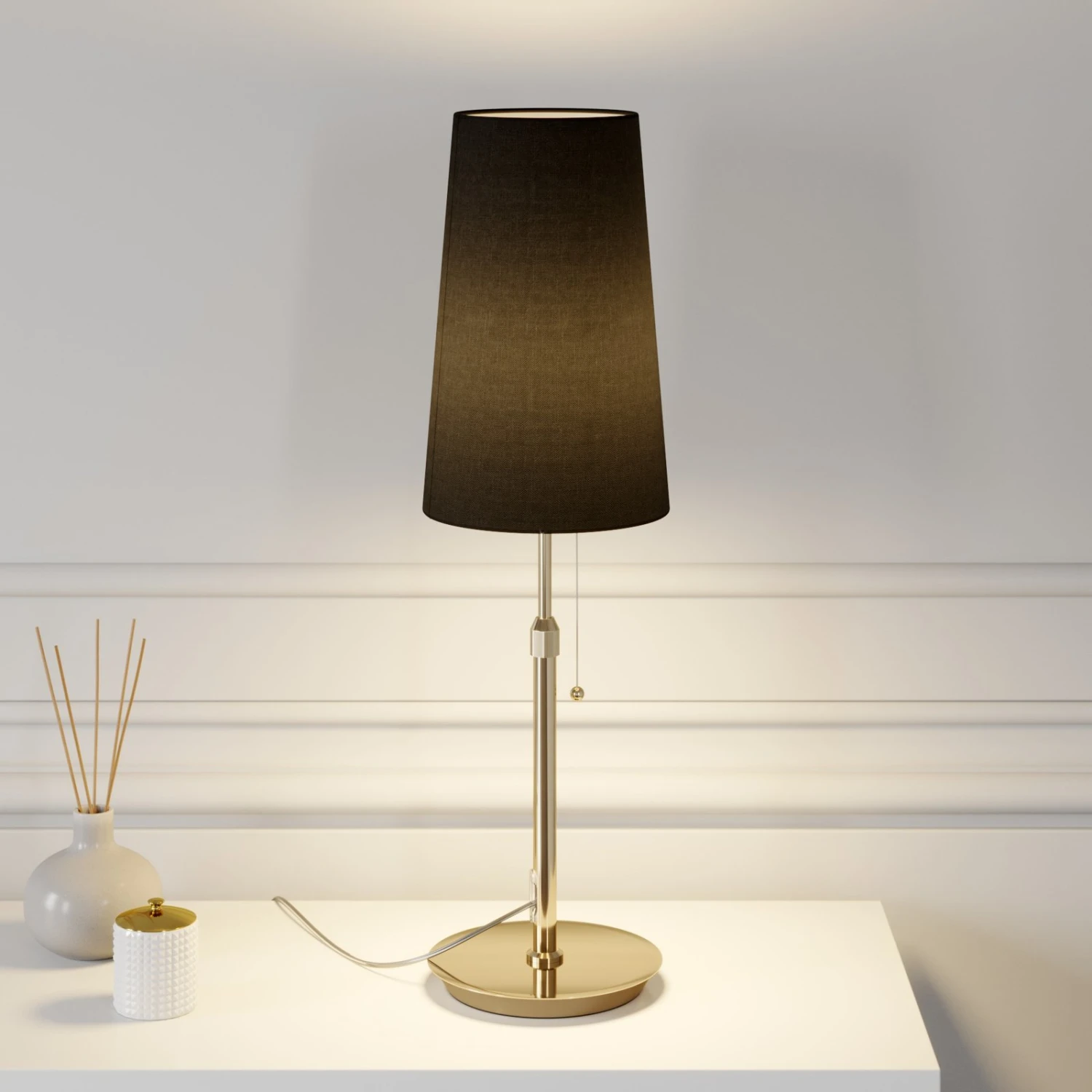 Schmale Stoff-Tischleuchte Pordis mit schwarzem Textilschirm und Metallgestell in Messing, höhenverstellbar