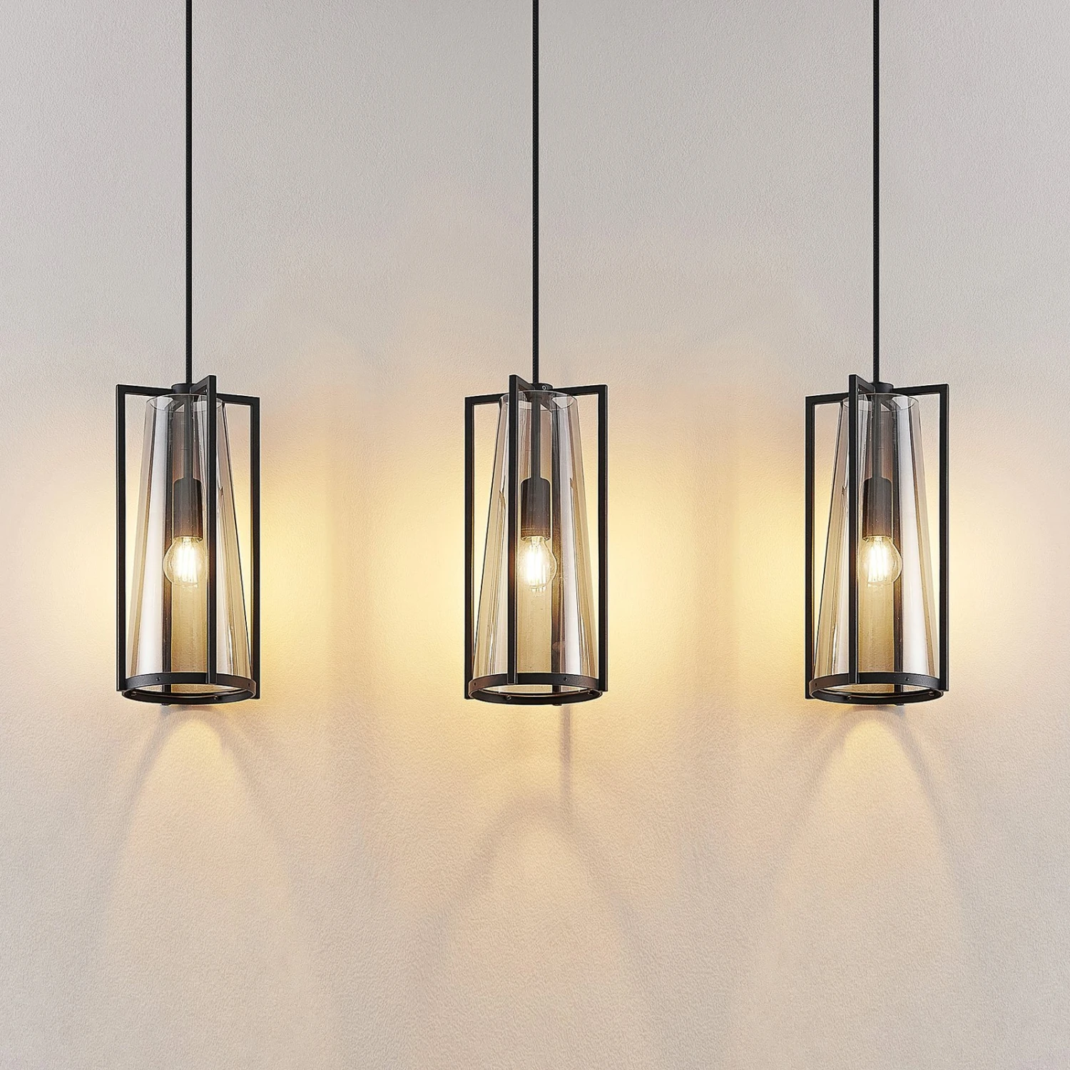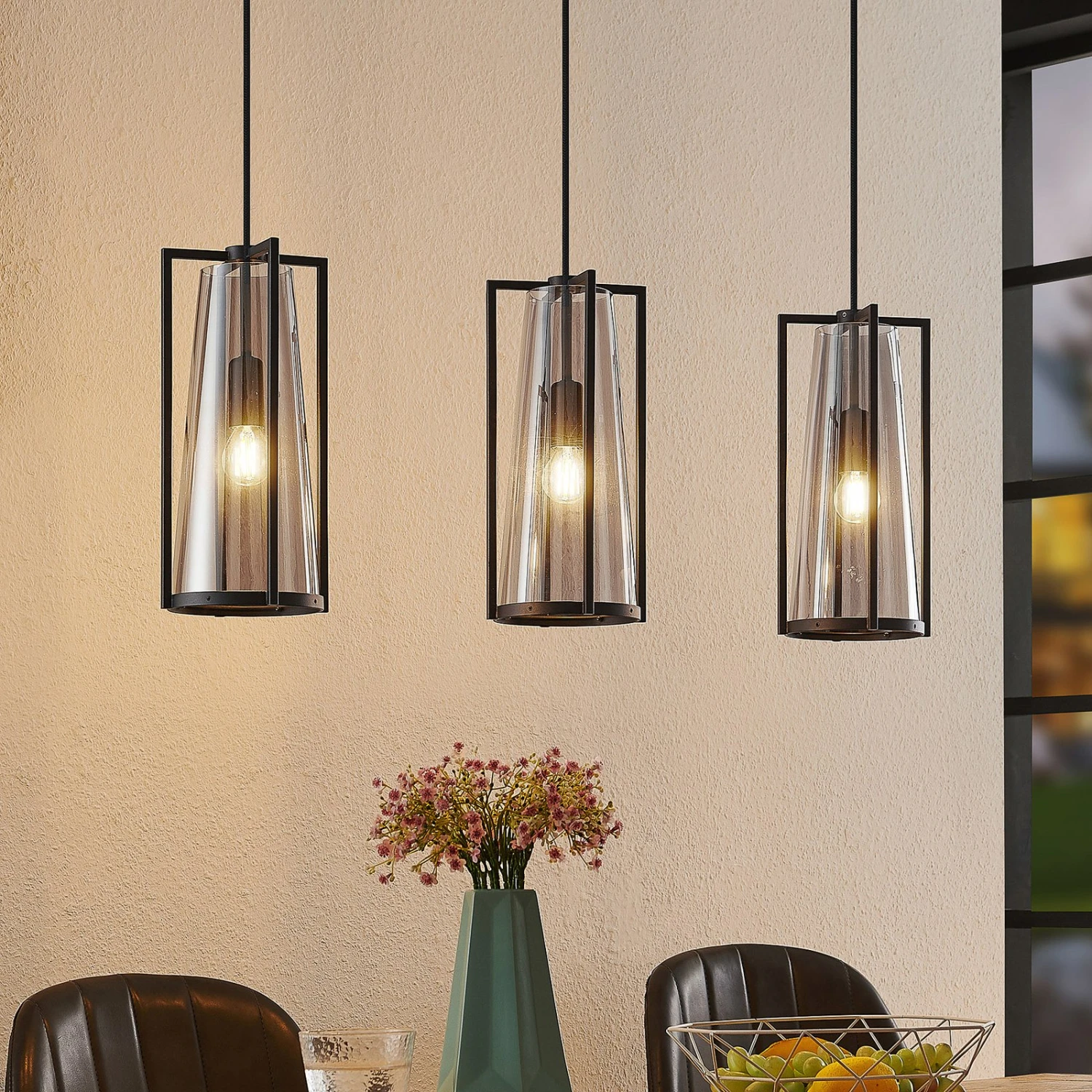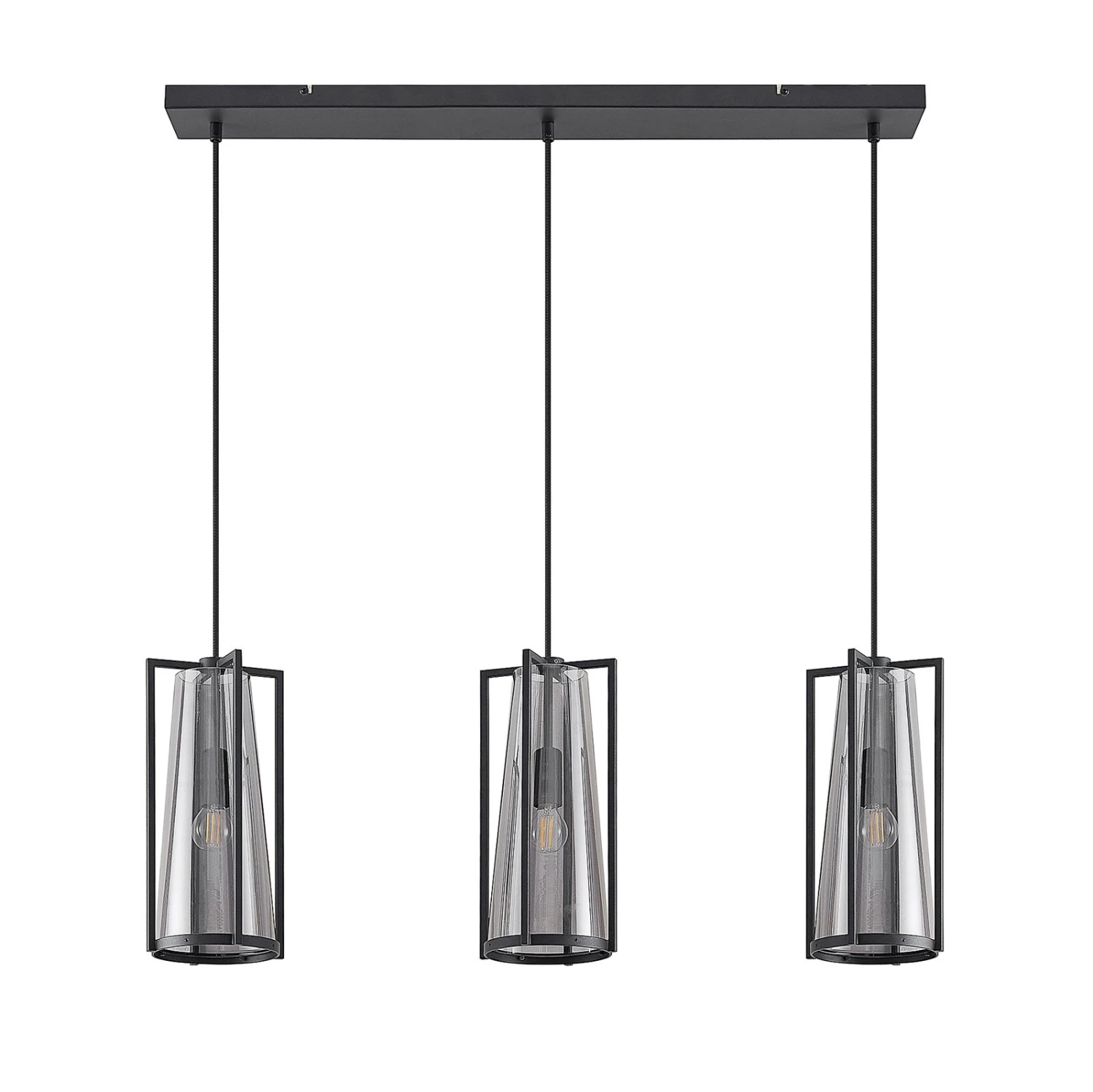 Bei Rufina sind drei Lampenschirme in länglicher Form angeordnet und sie bestehen sowohl aus einem vierteiligen Metallrahmen in Schwarz als auch aus einem Rauchglaskegel, der den Schirm darstellt. Das Rauchglas bewirkt eine sanfte Abblendung des Lichts, das mit dem Glas gemütlicher erscheint und die Tönung wirkt ebenso edel wie extravagant. Die Leuchtmittel sind – zumindest bei eingeschalteten Lampen – noch gut sichtbar und sollten deshalb zur Gesamtoptik passen, wie es auf Filamentlampen zutrifft, die mit LEDs leuchten, aber klassischen Glühbirnen nachempfunden worden sind. Die Pendellampe passt mit ihrer länglichen Bauform und den drei Lampenschirm im individuellen Design sehr gut über einen Tresen oder einen Esstisch und verschönert Wohnbereiche mit einer dekorativen Wirkung.