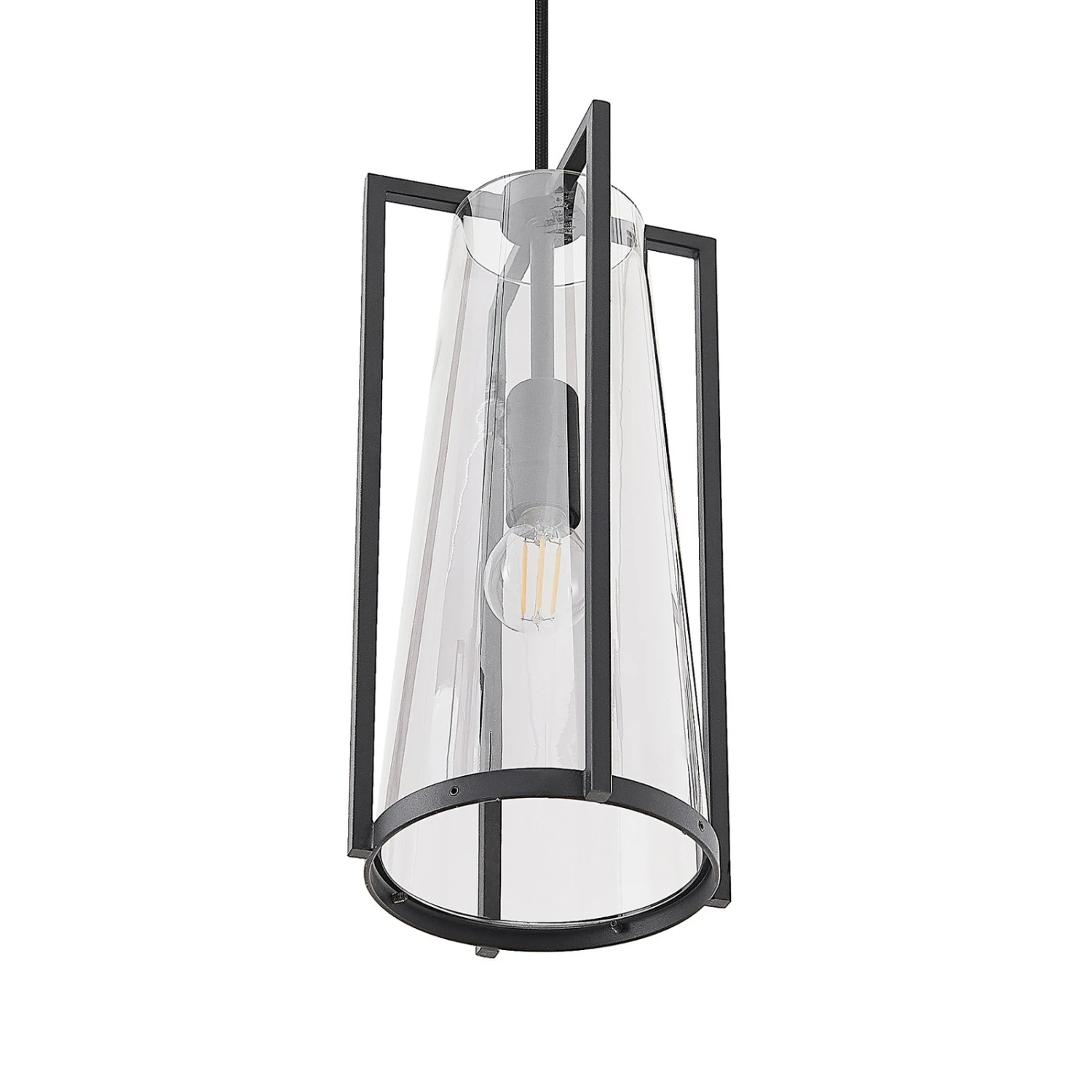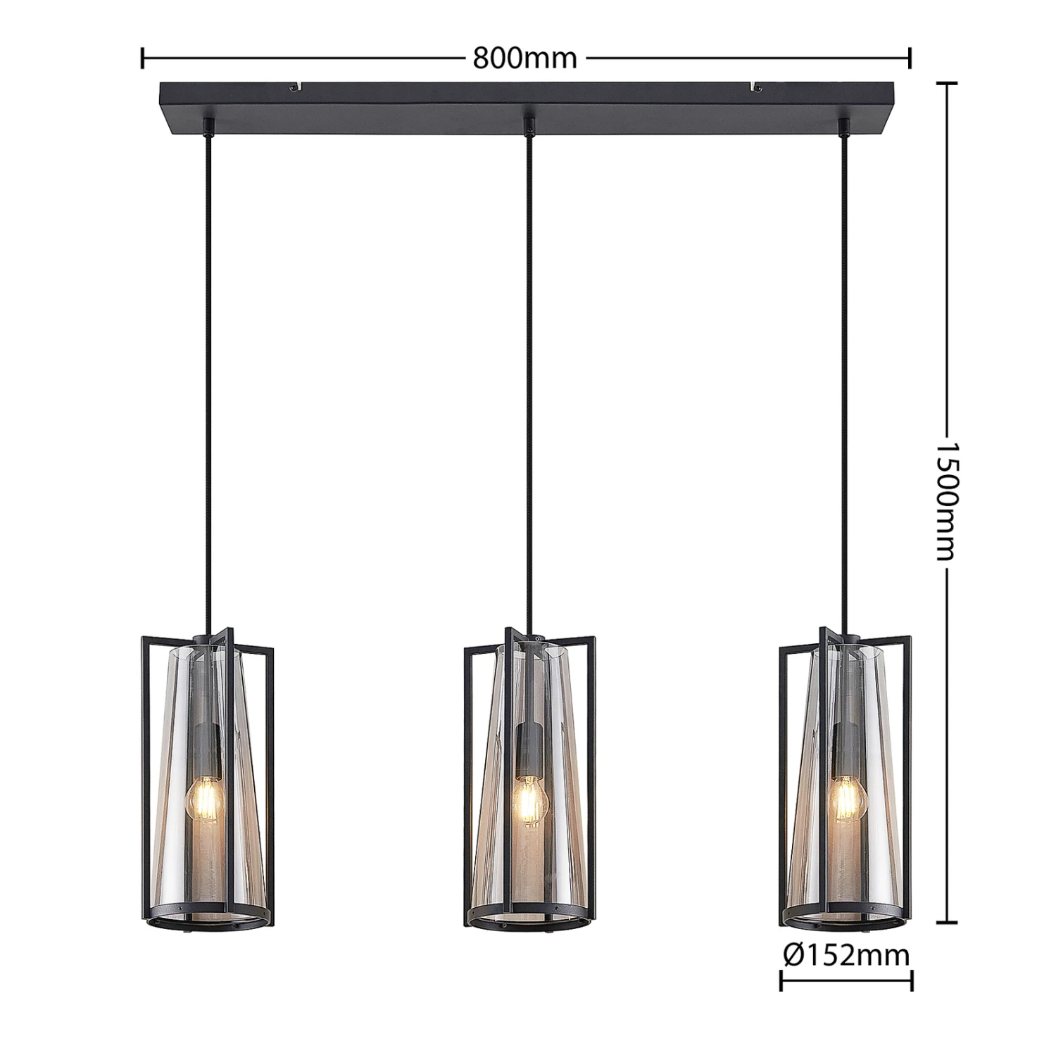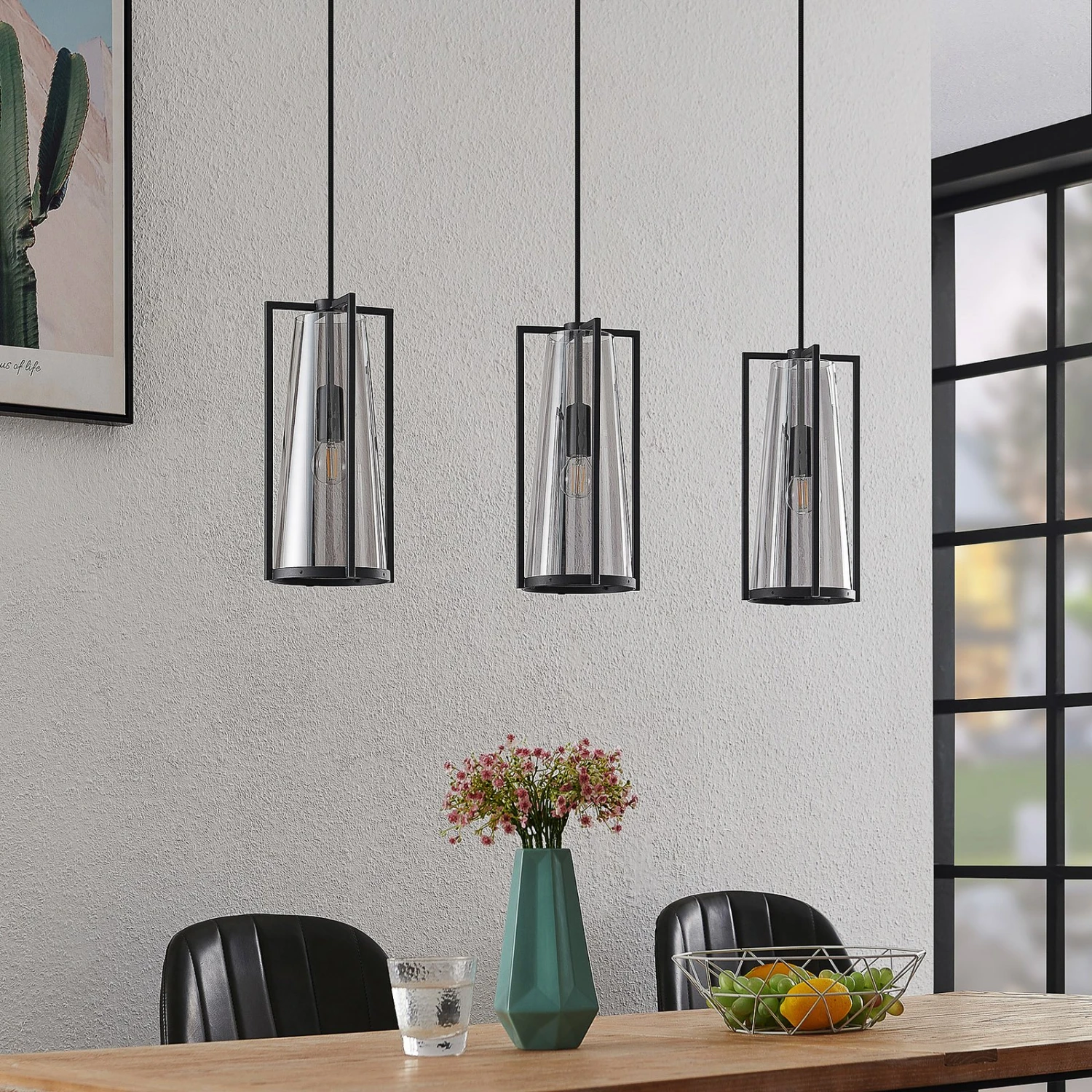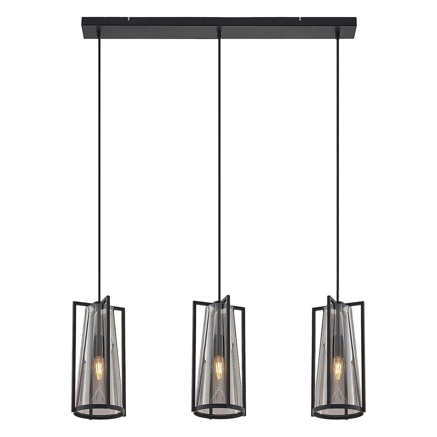 Bei Rufina sind drei Lampenschirme in länglicher Form angeordnet und sie bestehen sowohl aus einem vierteiligen Metallrahmen in Schwarz als auch aus einem Rauchglaskegel, der den Schirm darstellt. Das Rauchglas bewirkt eine sanfte Abblendung des Lichts, das mit dem Glas gemütlicher erscheint und die Tönung wirkt ebenso edel wie extravagant. Die Leuchtmittel sind – zumindest bei eingeschalteten Lampen – noch gut sichtbar und sollten deshalb zur Gesamtoptik passen, wie es auf Filamentlampen zutrifft, die mit LEDs leuchten, aber klassischen Glühbirnen nachempfunden worden sind. Die Pendellampe passt mit ihrer länglichen Bauform und den drei Lampenschirm im individuellen Design sehr gut über einen Tresen oder einen Esstisch und verschönert Wohnbereiche mit einer dekorativen Wirkung.