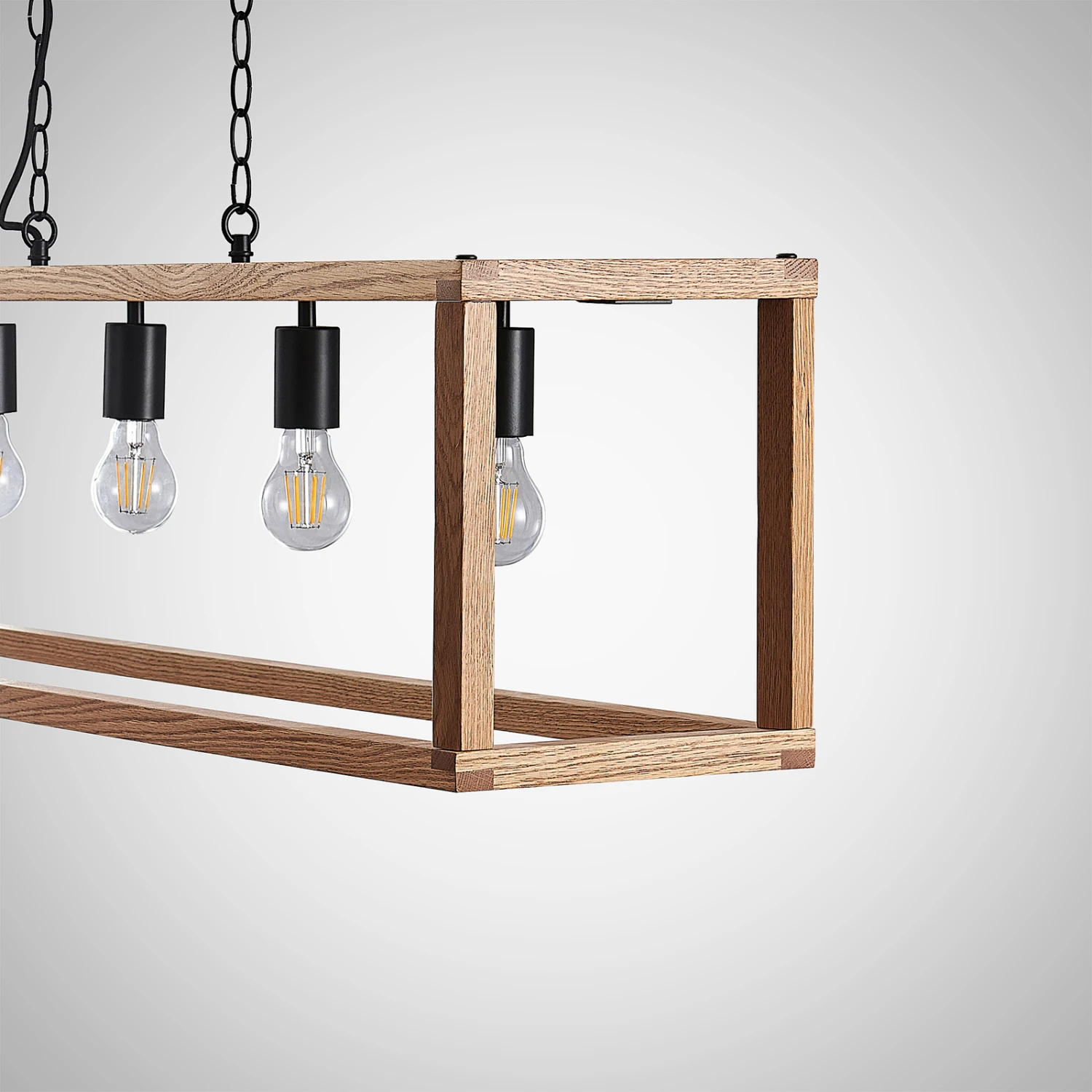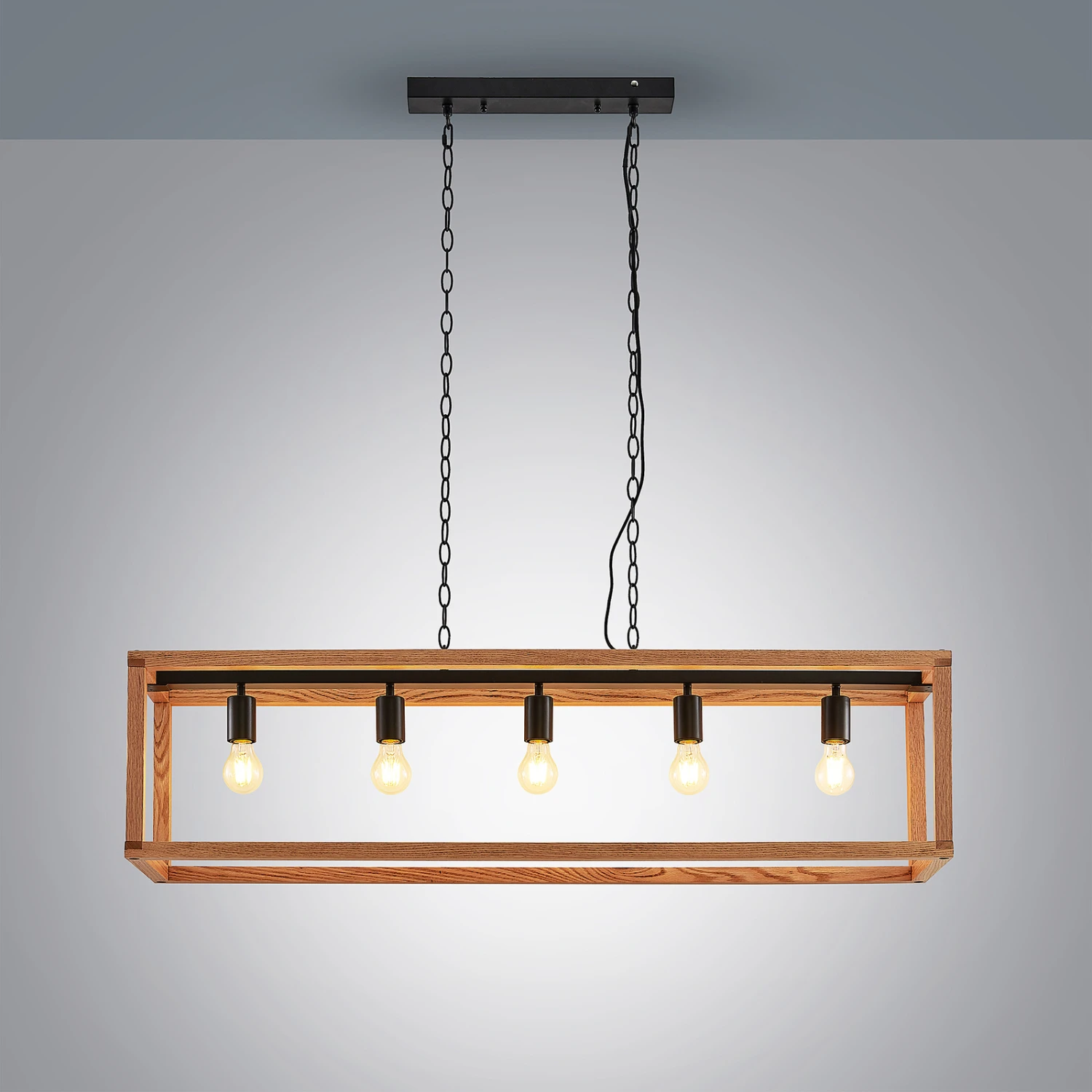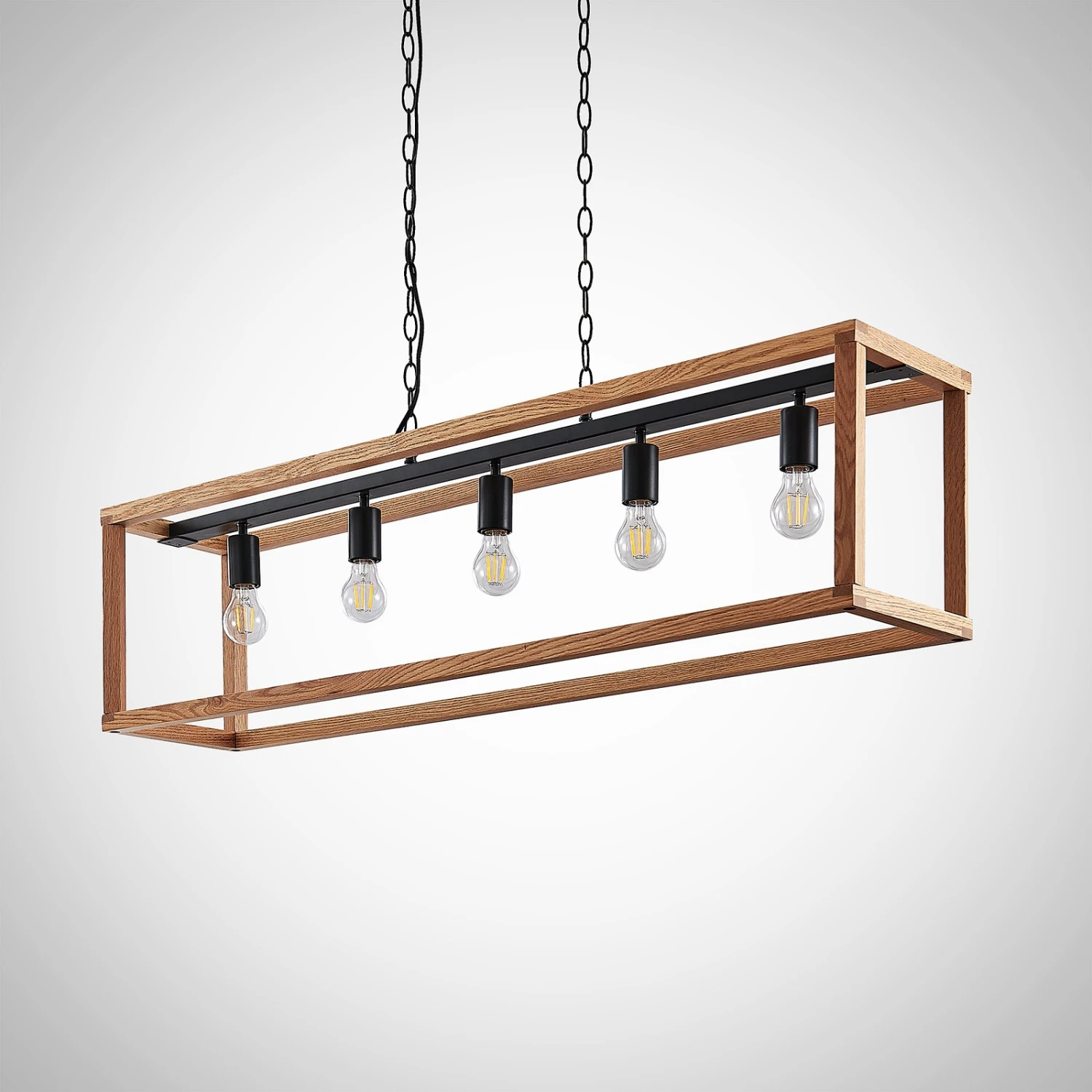 Sedrik ist ein schöner Allrounder für den Essbereich, der stets stilvoll daherkommt und sowohl nostalgische Einrichtungen mit Vintagecharakter als auch moderne Wohnstile bereichert. Der Lampenschirm gleicht ohne Zweifel keinem klassischen Objekt seiner Art, sondern präsentiert sich hier als quaderförmiger Rahmen in Holzoptik. Innen sitzen die fünf E27-Lampenfassungen – gut sichtbar, so dass auch die einzusetzenden Lampen sehr präsent erscheinen. Daher sollte man sich auf Leuchtmittel beschränken, die den stilvollen, nostalgischen Look gut unterstreichen, wie es auf Filament- oder Rustikalampen zutrifft.