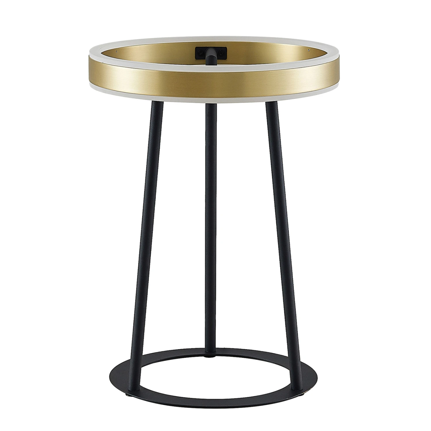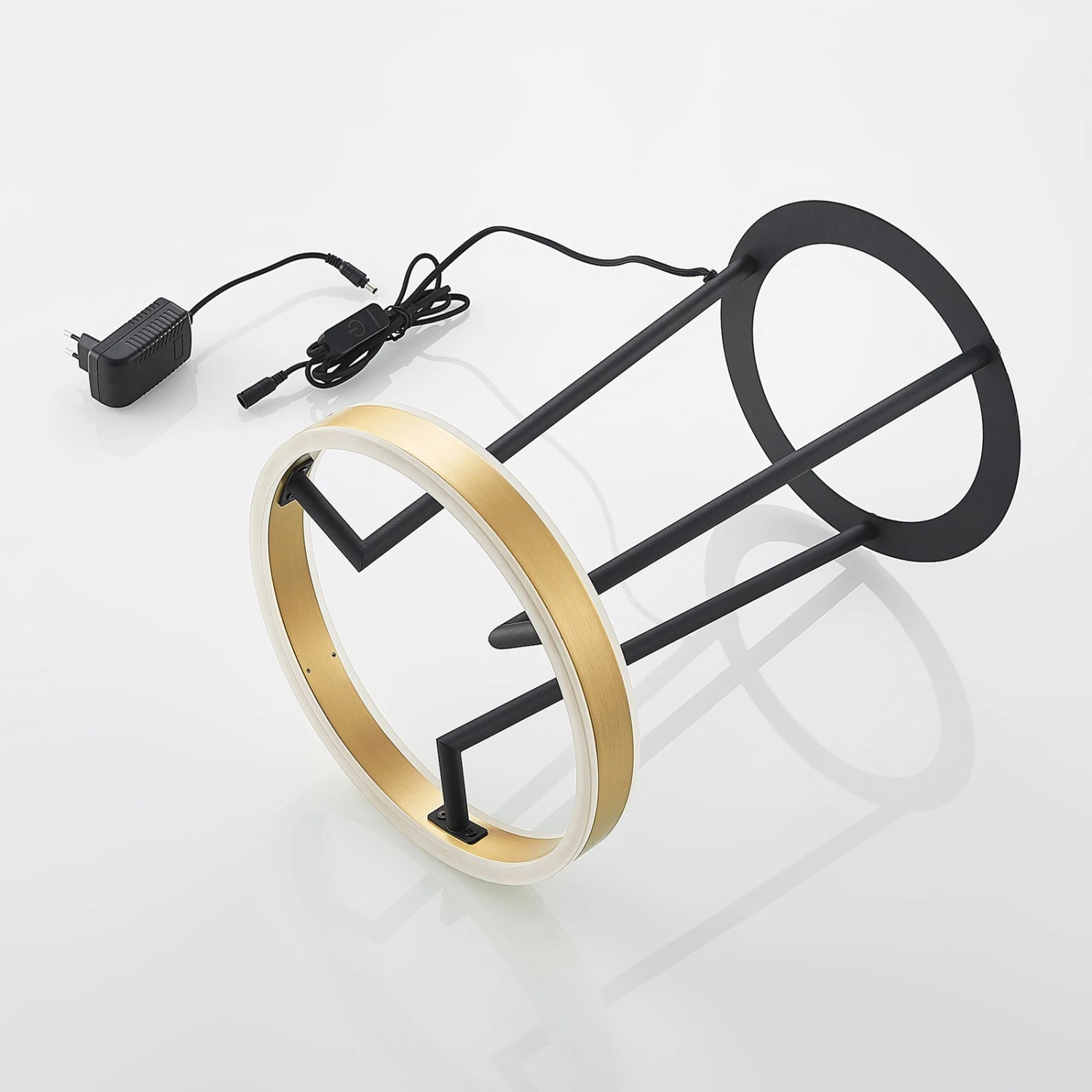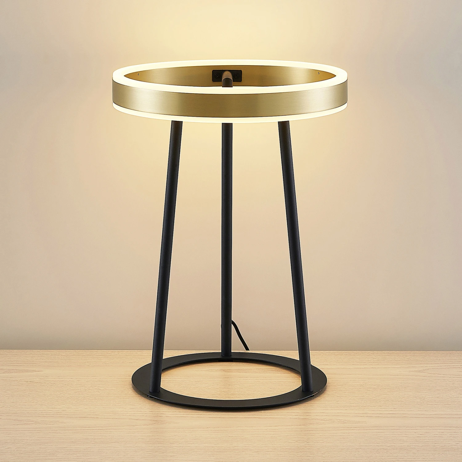 Die LED-Tischlampe Seppe eignet sich hervorragend für eine Akzentbeleuchtung auf einer Kommode oder einem Schreibtisch. Sie steht auf einem kreisförmigen Standfuß, von dem sich drei Streben erheben und einen Kranz halten, in dem eine fest verbaute LED sitzt. Durch einen Touch-Schalter ist es möglich, die Leuchte wie gewohnt ein- und auszuschalten. Durch die 3-Stufen-Dimmtechnik mit integrierter Off-Funktion lässt sie sich zudem durch mehrmaliges Betätigen des Schalters in drei unterschiedliche Stufen ihrer Helligkeit dimmen: 100 %, 50 % und 10 %. Die attraktive Farbkombination aus Schwarz und Messing macht die LED-Tischleuchte Seppe zu einem stilvollen Dekorationsgegenstand, welcher auffällige Akzente innerhalb des restlichen Mobiliars setzt.