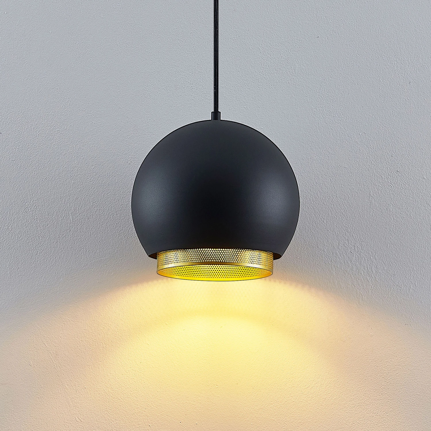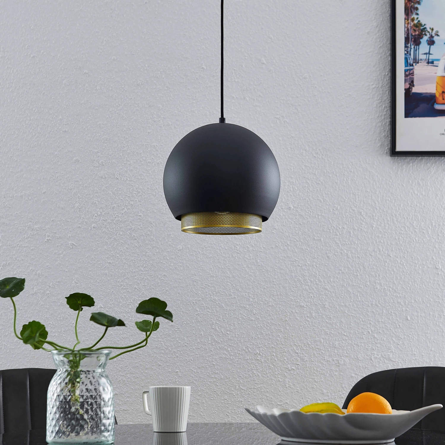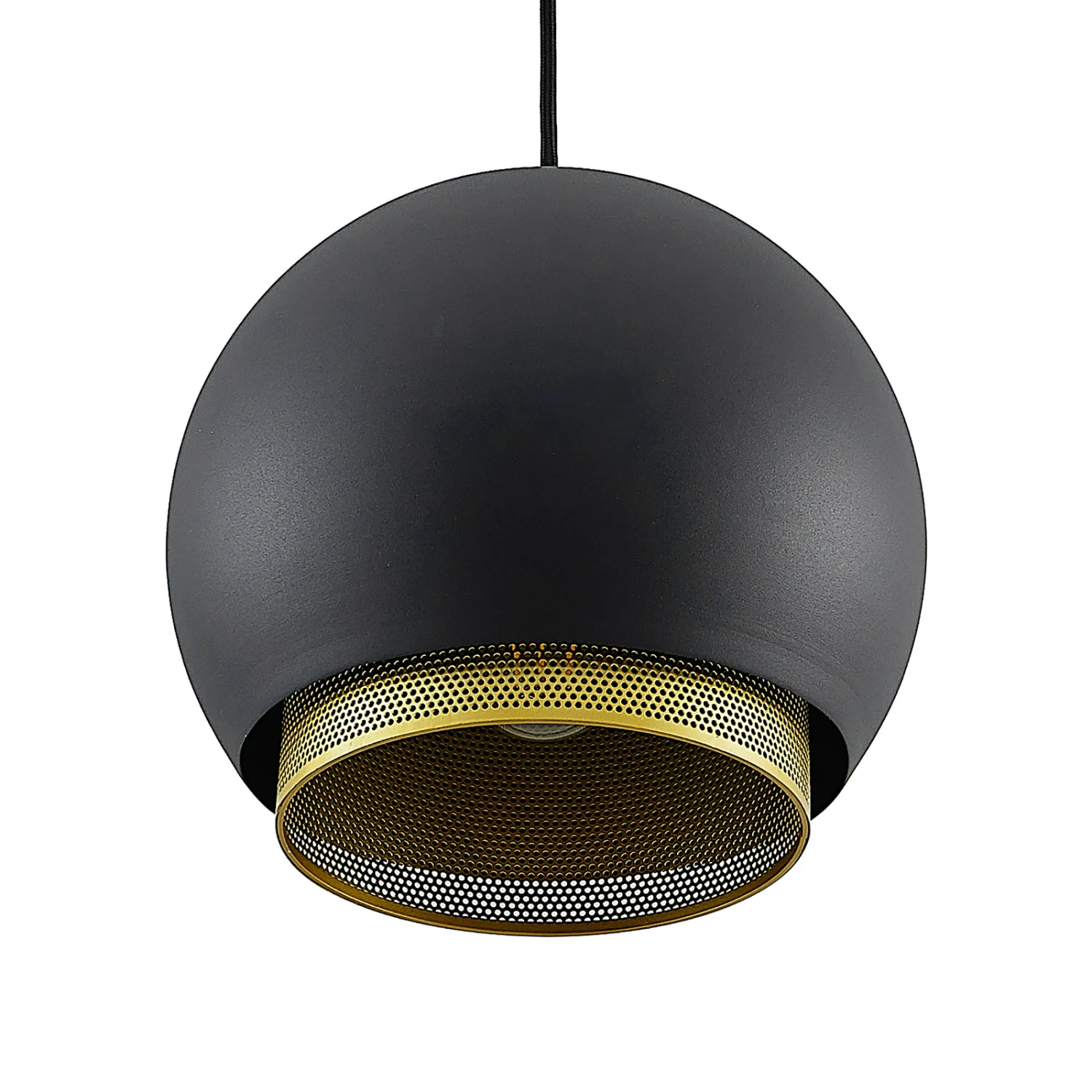 Die Hängeleuchte Sivanel überrascht mit ihrem ungewönhlichen Design. Der üppige Leuchtenschirm ergibt beinahe die Form einer Kugel. Er wurde aus Eisen gefertigt und in einem stilvollen Schwarz gestaltet. Die Leuchte besitzt außerdem einen weiteren Schirm, der sich im Inneren der Leuchte befindet und mit einem goldenen Finish überzogen wurde. Das Interessante dabei ist, dass der Innenschirm zylindrisch geformt ist und mit kleinen Löchern versehen wurde. Diese punktierte Optik verleiht der Leuchte das gewisse Extra. Sivanel eignet sich sowohl für die Nutzung in den eigenen vier Wänden als auch für den Einsatz im Gewerbe.