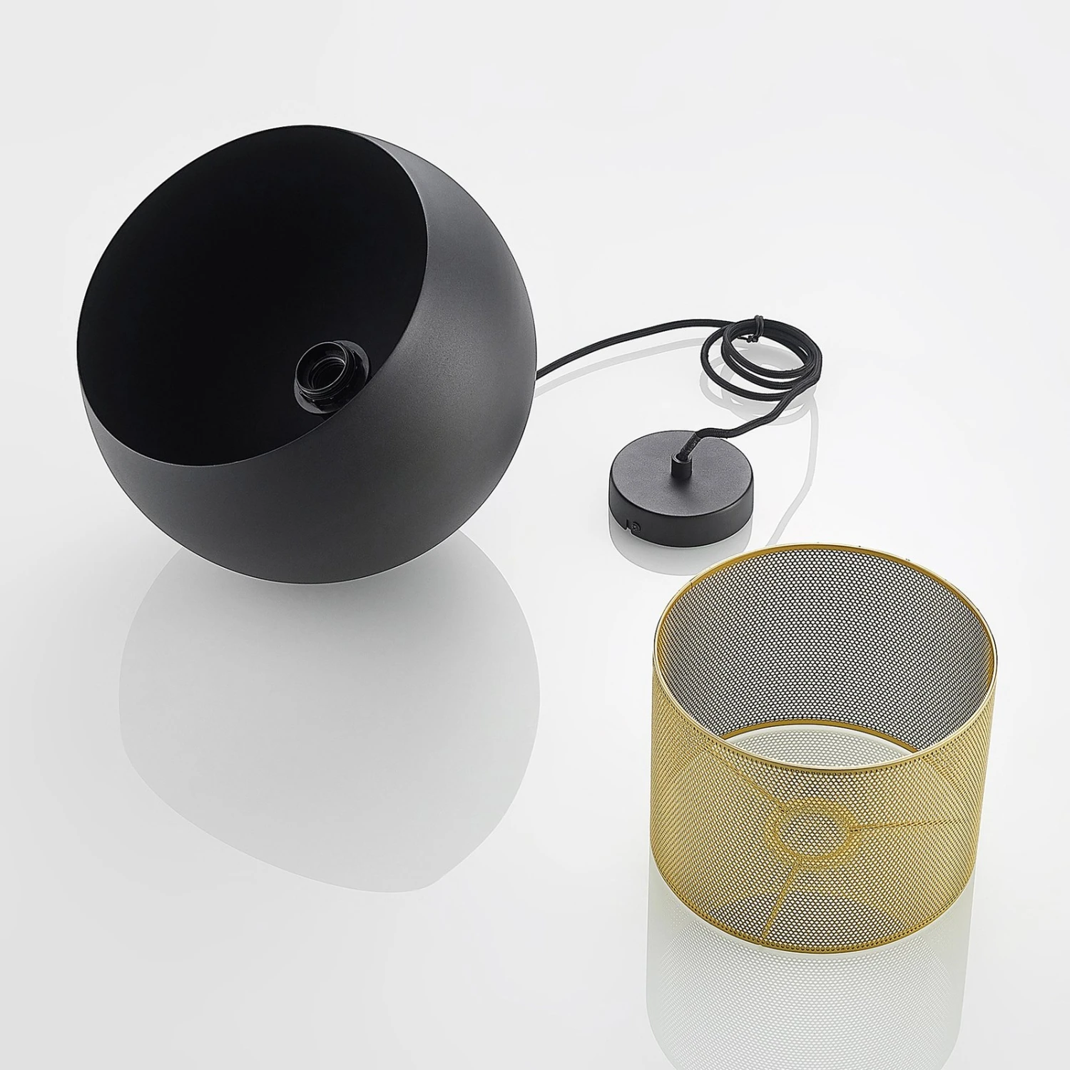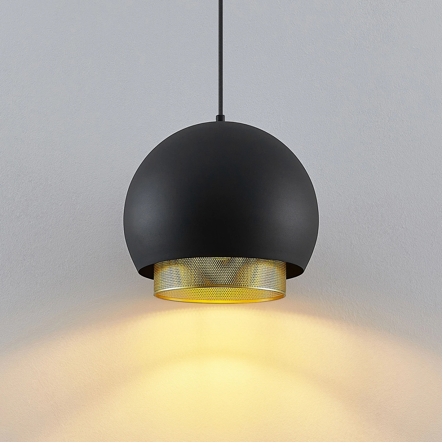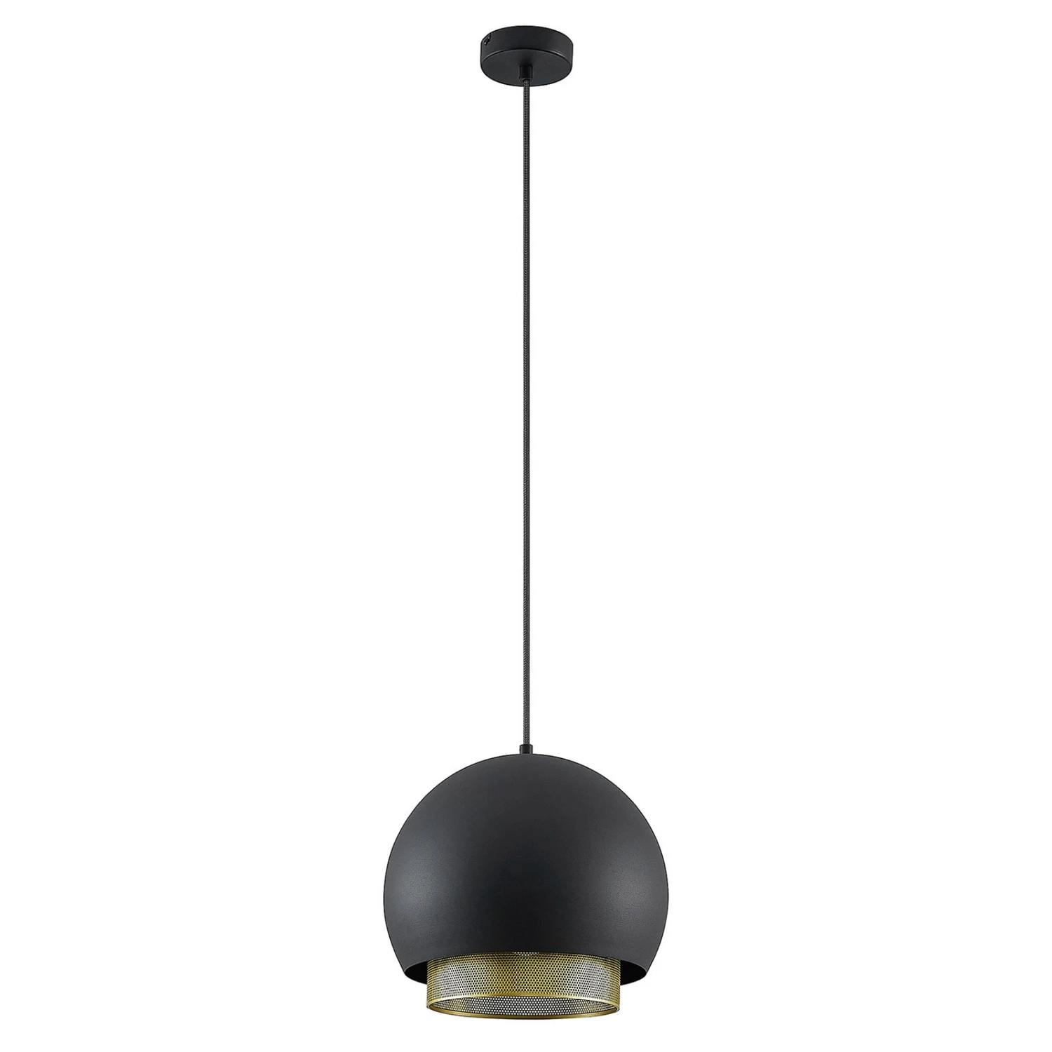 Sivanel ist eine moderne Hängeleuchte, die mit ihrer dunklen Erscheinung sofort ins Auge sticht. Diese einflammige Leuchte besitzt einen doppelten Leuchtenschirm. Der äußere Schirm ist in Form einer Kugel gestaltet und wurde mit einem schwarzen Oberflächenfinish versehen. Der innere Schirm ist zylindrisch geformt und an vielen Stellen punktiert worden. Seine goldene Farbe bringt einen einladenden Akzent in den Raum und sorgt dafür, dass der Lichtschein einen warmen Effekt hat. Diese Leuchte kommt sowohl über dem eigenen Esszimmertisch als auch über einer gewerblichen Theke schön zur Geltung.