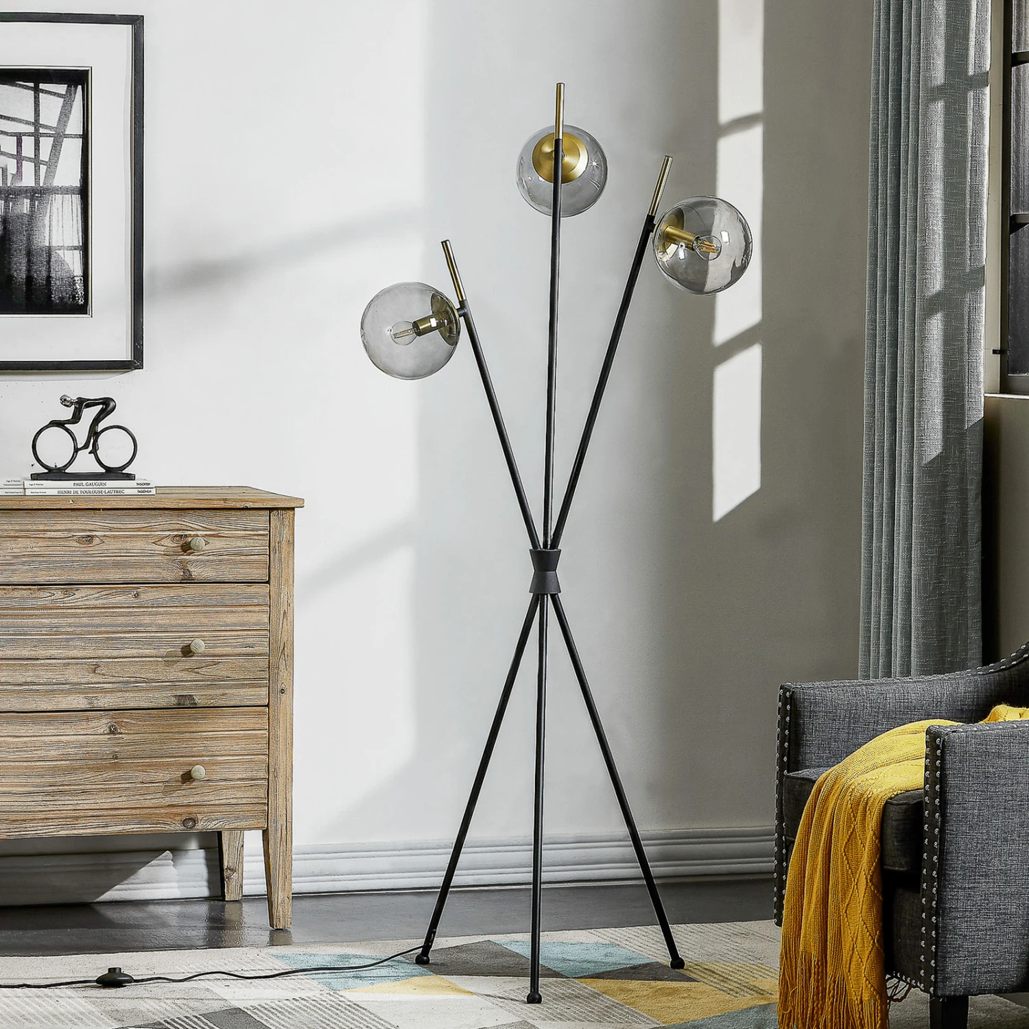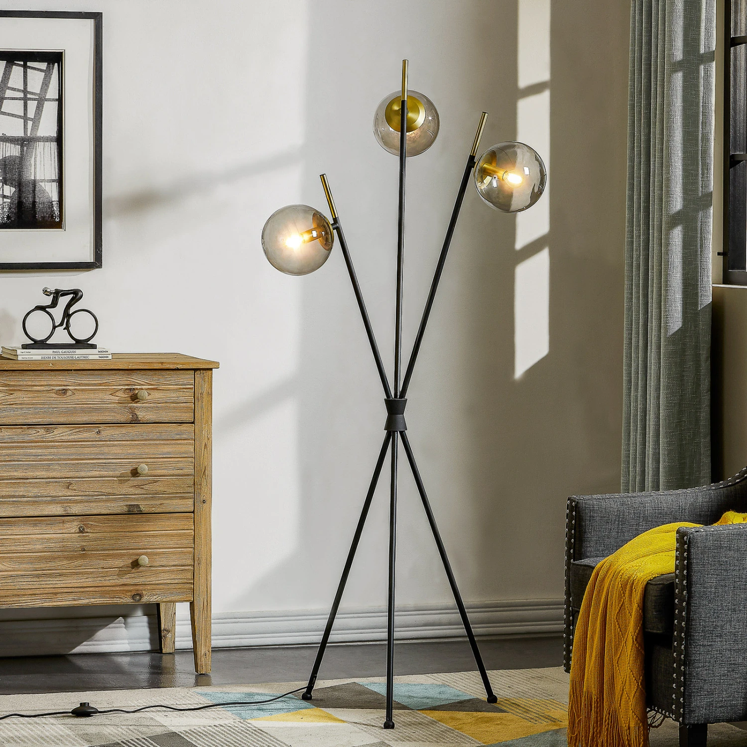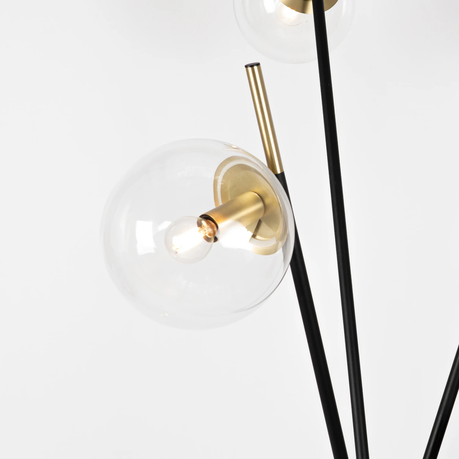 Sotiana passt in ein besonders elegantes Umfeld und ist eine Stehleuchte, die mit drei Glasschirmen bestückt ist, die alle einer Kugel gleichen und edel funkeln. Im Inneren sitzt jeweils eine Messingfassung, die das Design wirkungsvoll unterstreicht und zusammen mit dem restlichen Gestell, das in Schwarz gestaltet ist, einen sehenswerten Drei-Komponenten-Look entstehen lässt. Dabei wirkt das Gestell insofern außergewöhnlich, als dass es zwar in Tripodform gehalten ist, aber in der Mitte wie gebündelt erscheint und oben wieder auseinandergeht und dort je einer der Stäbe in einer Glaskugel mündet. Filamentlampen passen hier besonders gut zur Optik.