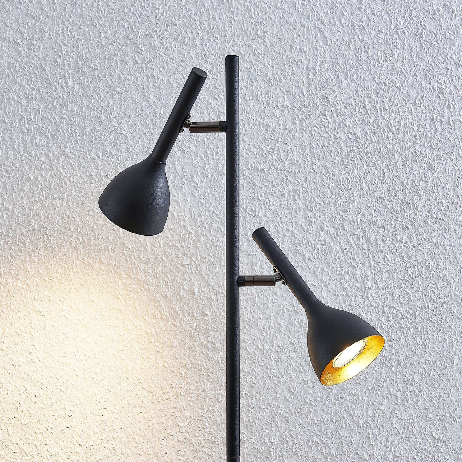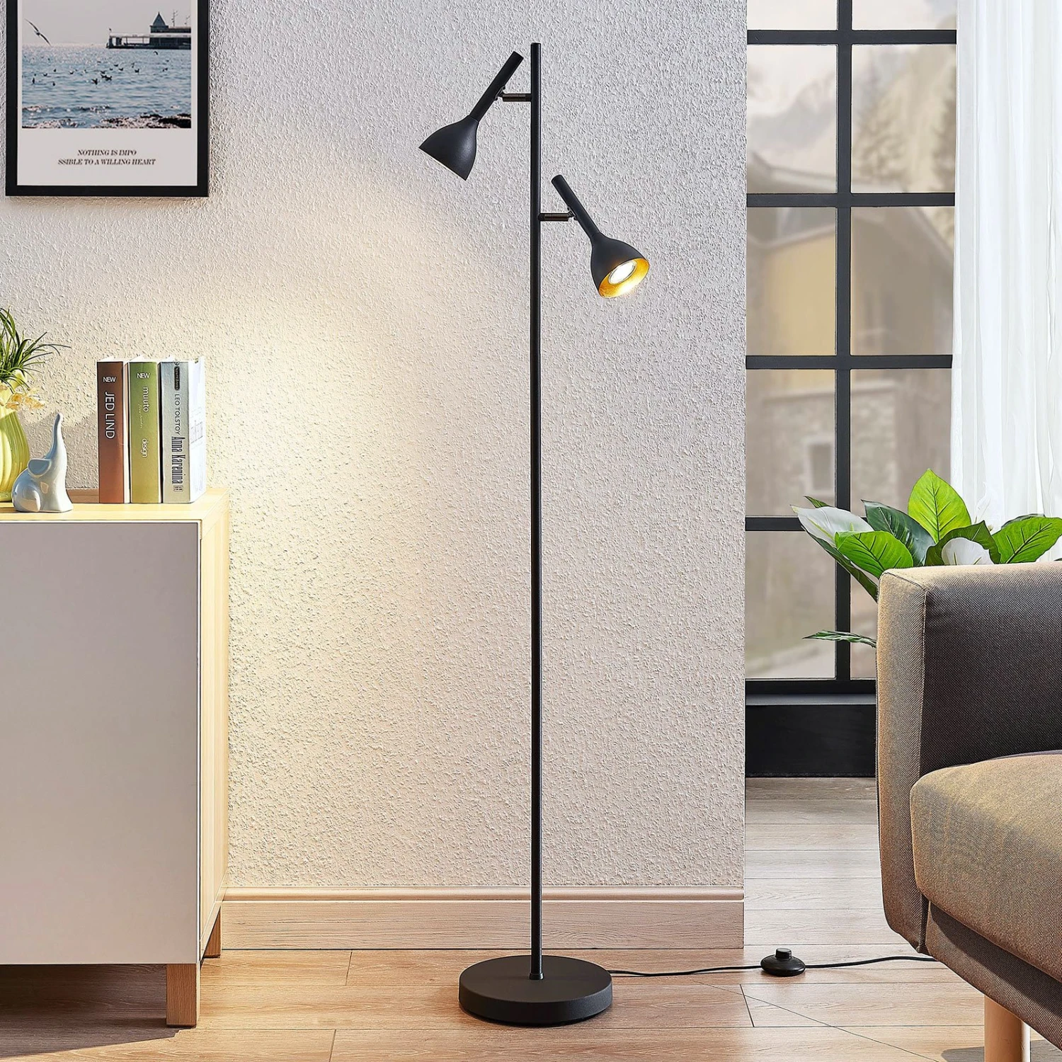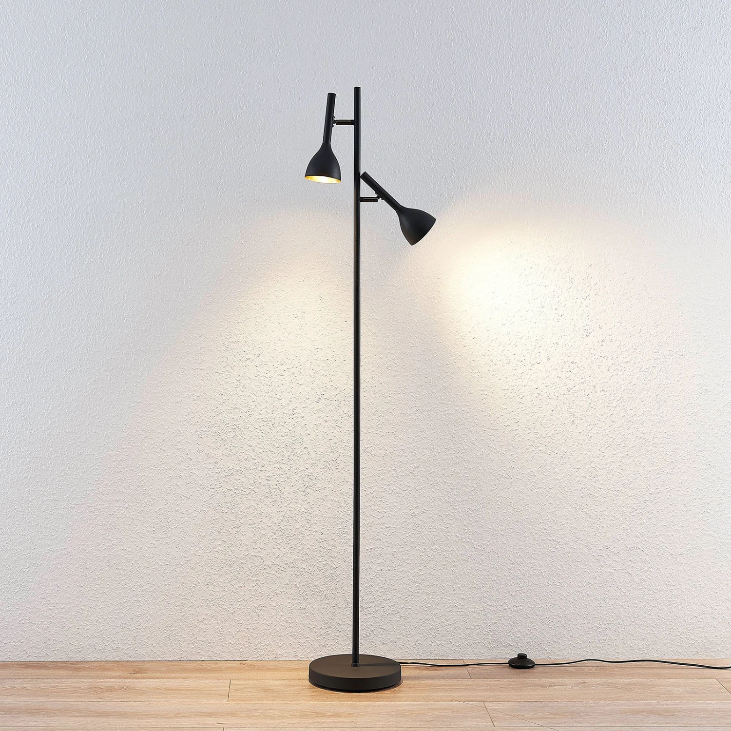Zweiflammige Stehlampe Nordwin mit schmalen, länglichen Schirmen in Schwarz und Gold