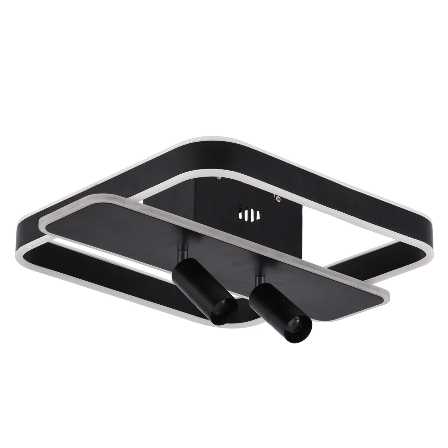 Stigla besitzt eine markante schwarze Oberfläche und ist eine LED-Deckenleuchte, die in einem exklusiven Design mit moderner Note gehalten ist und sich für viele zeitgemäße Stile eignet. Der eckige Rahmen mit abgerundeten Ecken ist durchgängig mit einem LED-Band belegt und er wird zusätzlich ergänzt von zwei beweglichen LED-Strahlern, die in der Mitte auf einem Balken sitzen. Sie können gedreht und geschwenkt werden, so dass man sie beliebig ausrichten kann und das Licht so zielgerichtet wie benötigt einstellen kann. Dabei können die verschiedenen Lichtquellen sowohl getrennt voneinander als auch gemeinsam eingeschaltet werden. Zur Steuerung liegt eine Fernbedienung bei, mit der die Helligkeit auch angepasst werden kann. Die Grundhelligkeit ist dabei so gut, dass man die LED-Deckenlampe Stigla hervorragend als Grundbeleuchtung nutzen kann. Eine Ergänzung um weitere Leuchte ist natürlich jederzeit möglich und erweitert dann die Anwendungsmöglichkeiten, z. B. wenn man sich ein gedämpftes, besonders gemütliches Licht wünscht.