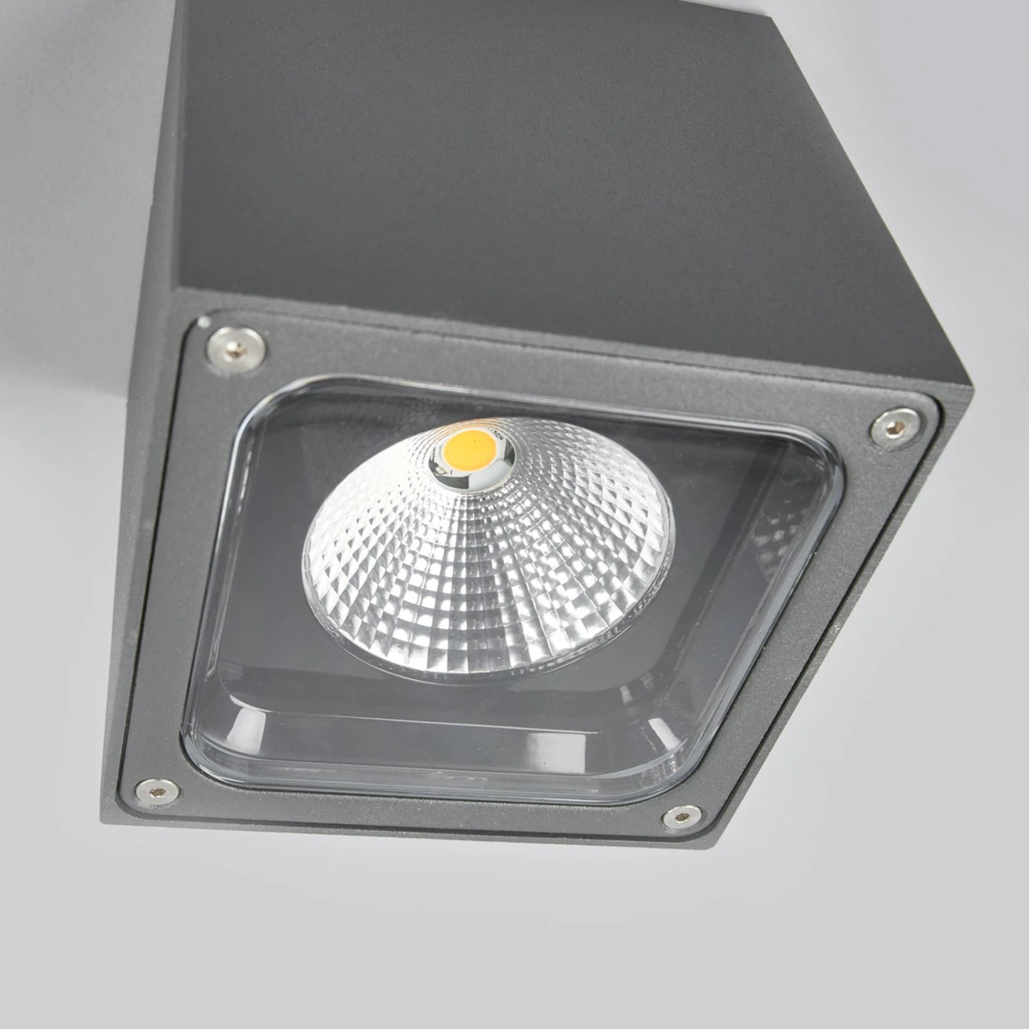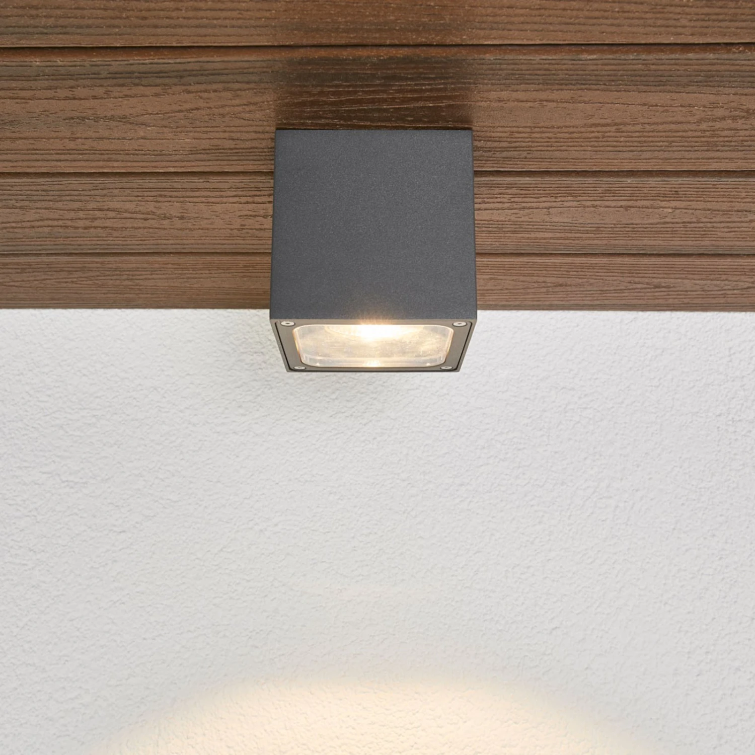 Nutzt man die LED-Deckenleuchte Tanea zur Beleuchtung von Überdachungen im Außenbereich, wie man sie zum Beispiel bei Hauseingängen oder über Terrassen und Balkonen vorfindet, dann hat man dort einen relativ schlichten Lichtspender mit dezenter Präsenz. Der Schirm bzw. Leuchtenkörper ist würfelförmig, besteht aus Aludruckguss und hat ein dunkelgraues Finish. Überdies gewährleistet die LED-Technik, dass der Energieverbrauch auf niedrigem Level angesiedelt ist.