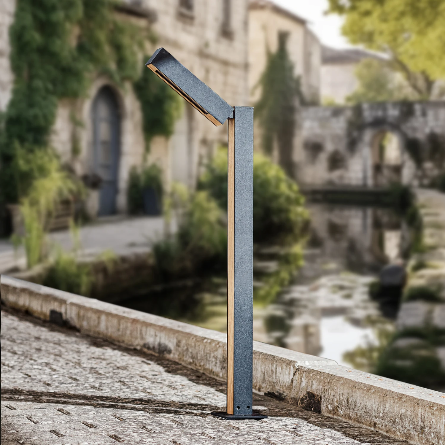 Neigbare LED-Wegeleuchte Taskalin mit attraktivem Holzdekor