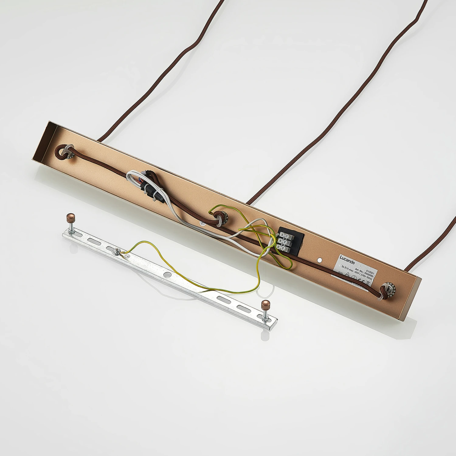 Tetira überzeugt im wahrsten Sinne des Wortes auf ganzer Linie, denn die drei Schirme sind länglich in einer Linie angeordnet, wodurch sich die Hängeleuchte gut für die Ausleuchtung einer Tischfläche eignet. Die Lampenschirme bestehen aus Metall in einer Art Käfiggeflecht mit vielen Durchlässen. So entsteht eine effektvolle Lichtwirkung, wobei weiße Innenschirme aus Glas die Lichtverteilung besonders weich und gleichmäßig gestalten und das Licht nur nach unten hin direkt entweichen kann. Auch das ist ein Punkt, der für die Beleuchtung eines Esstischs in Küche und Wohnbereich spricht. Die kaffeebraune Oberfläche rundet das individuelle Leuchtendesign stilvoll ab und macht Tetira zu einem sehenswerten Lichtspender für moderne Räumlichkeiten.