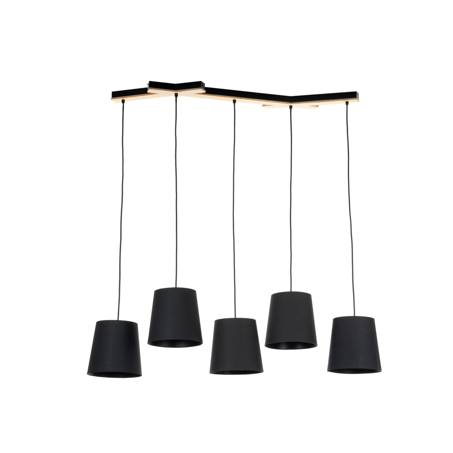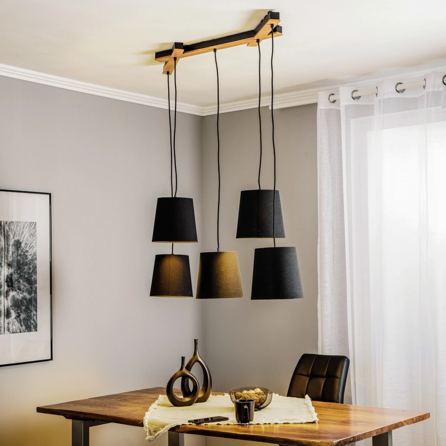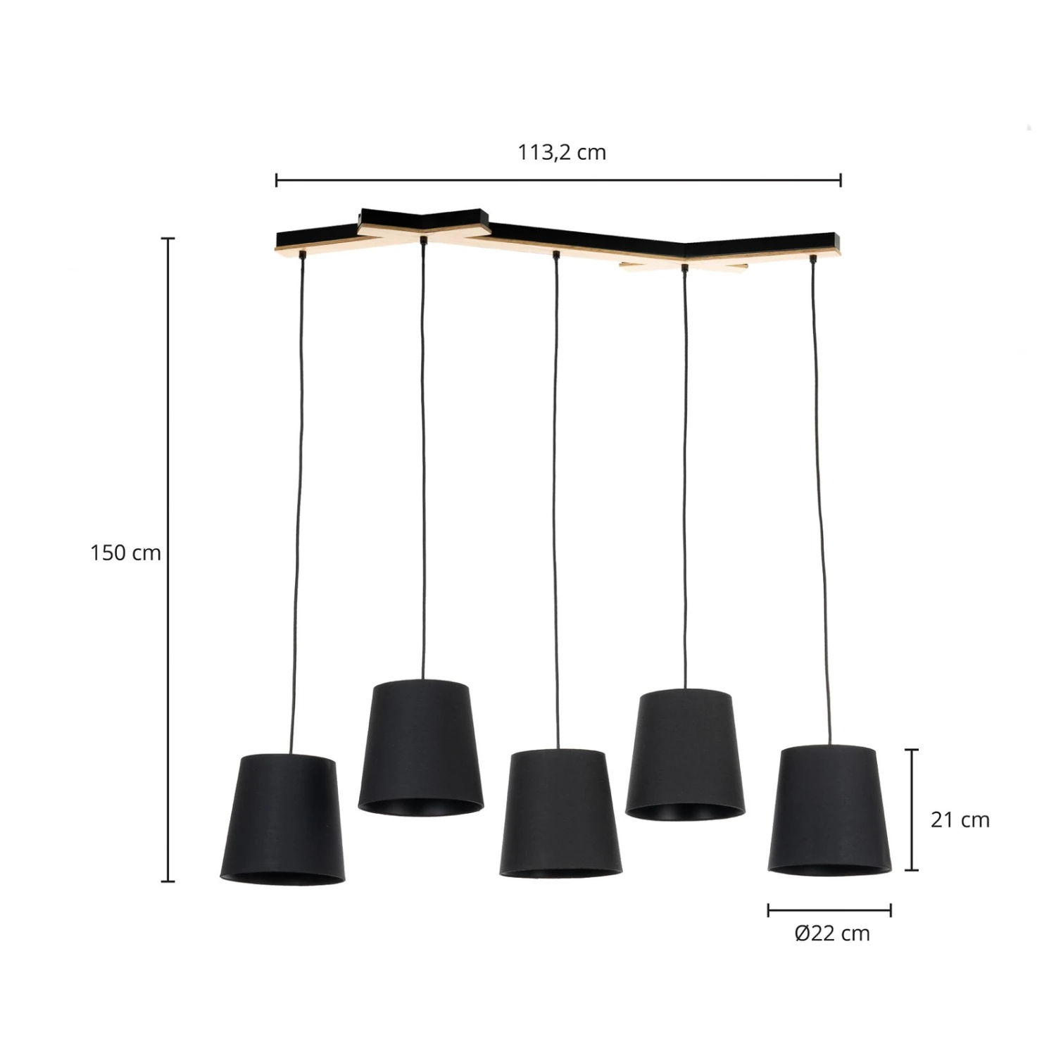 Esszimmer-Pendelleuchte Thamila mit fünf Stoff-Lampenschirmen und einer Deckenhalterung aus Eichenholz