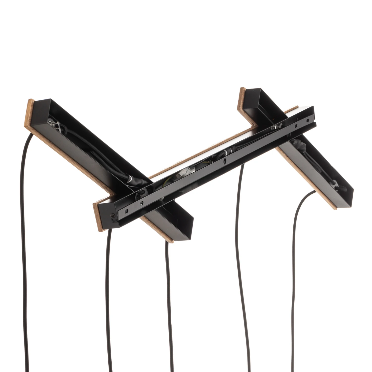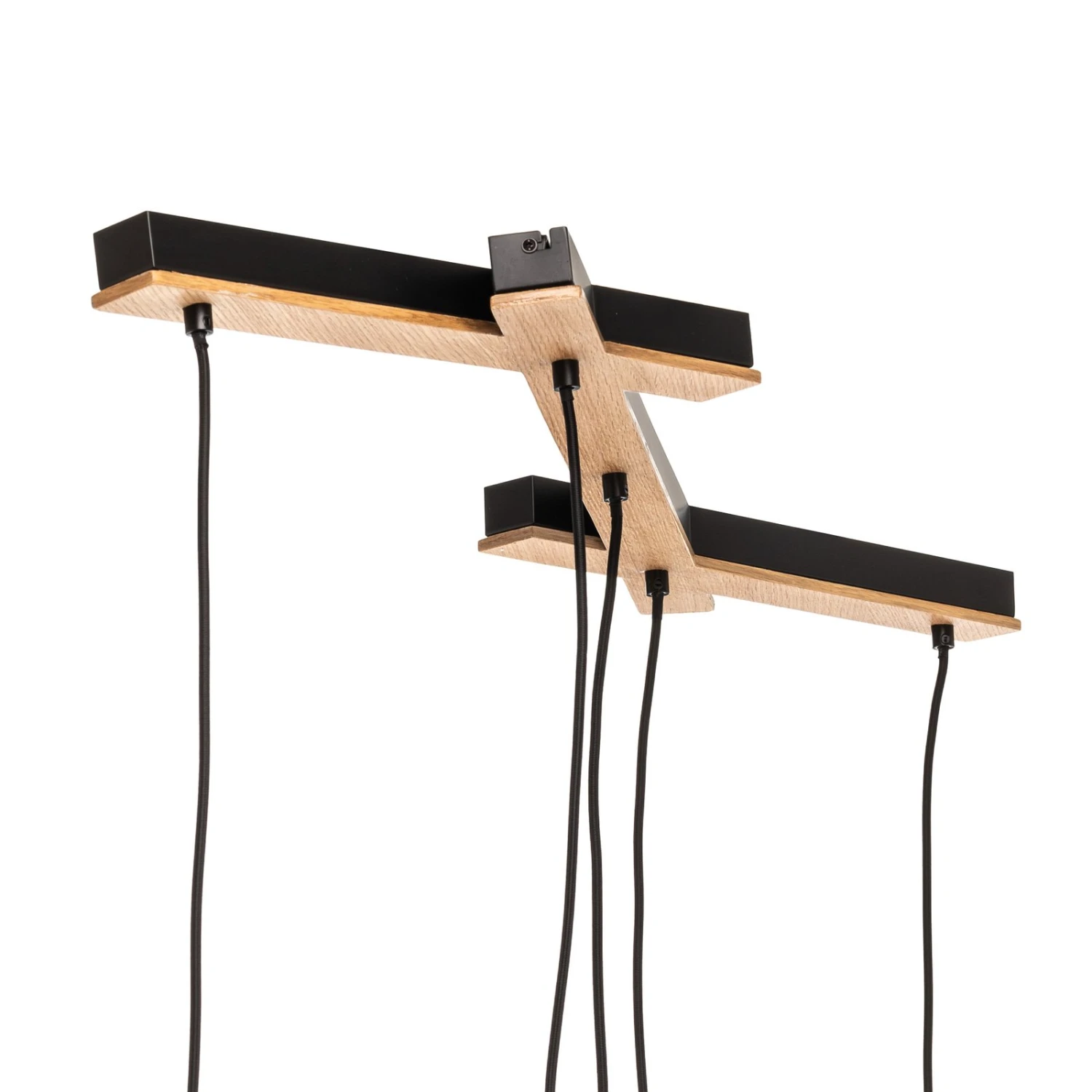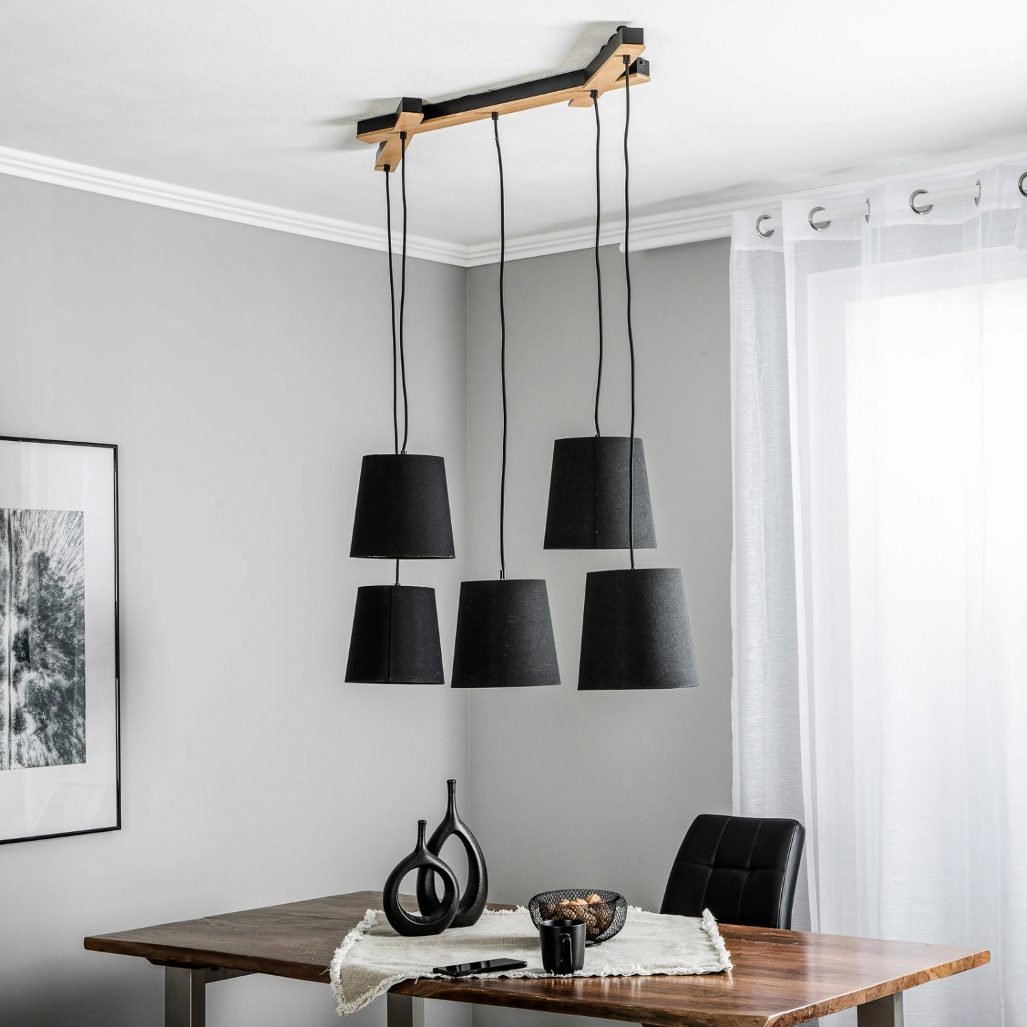 Esszimmer-Pendelleuchte Thamila mit fünf Stoff-Lampenschirmen und einer Deckenhalterung aus Eichenholz