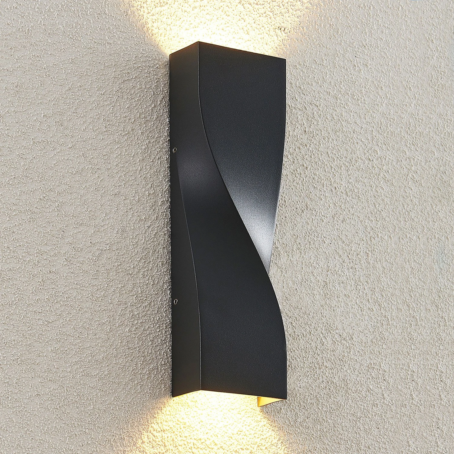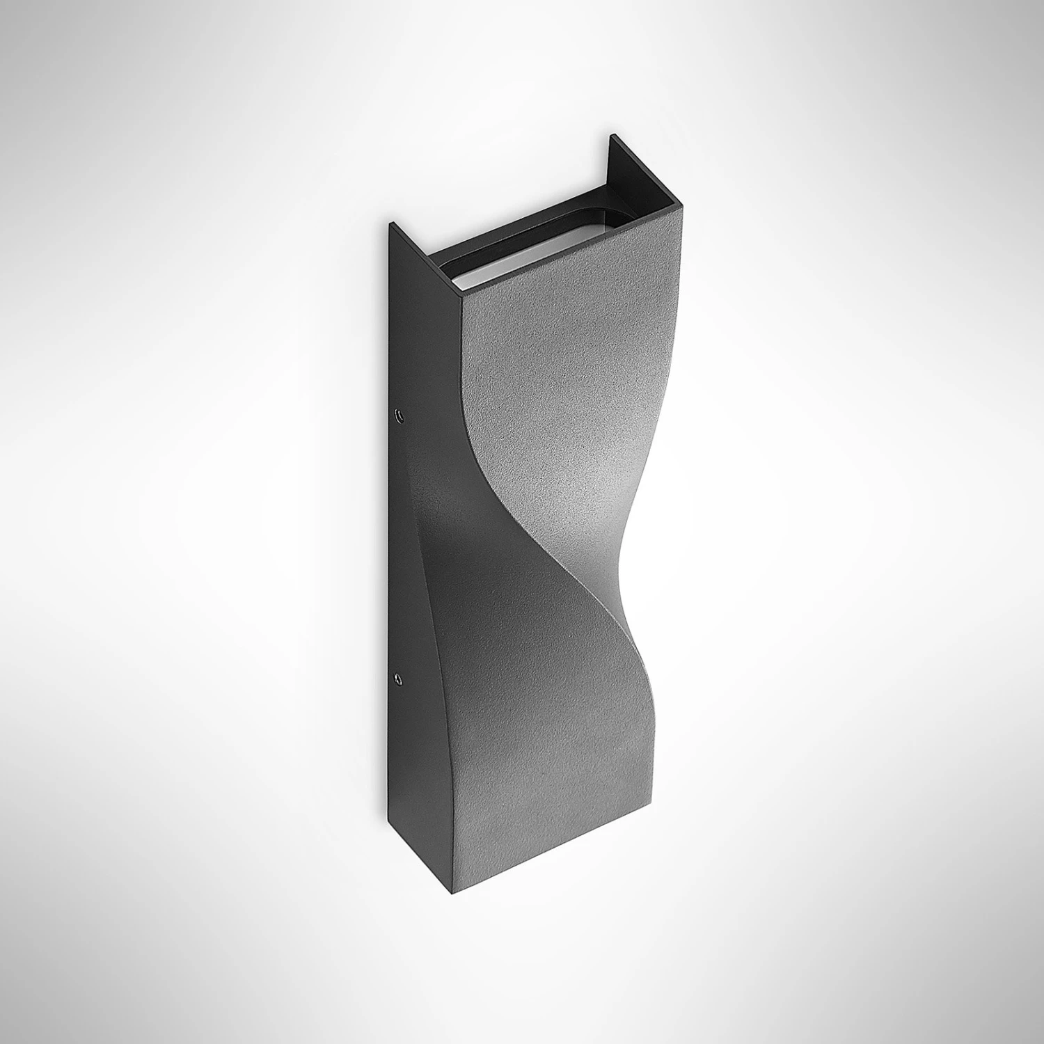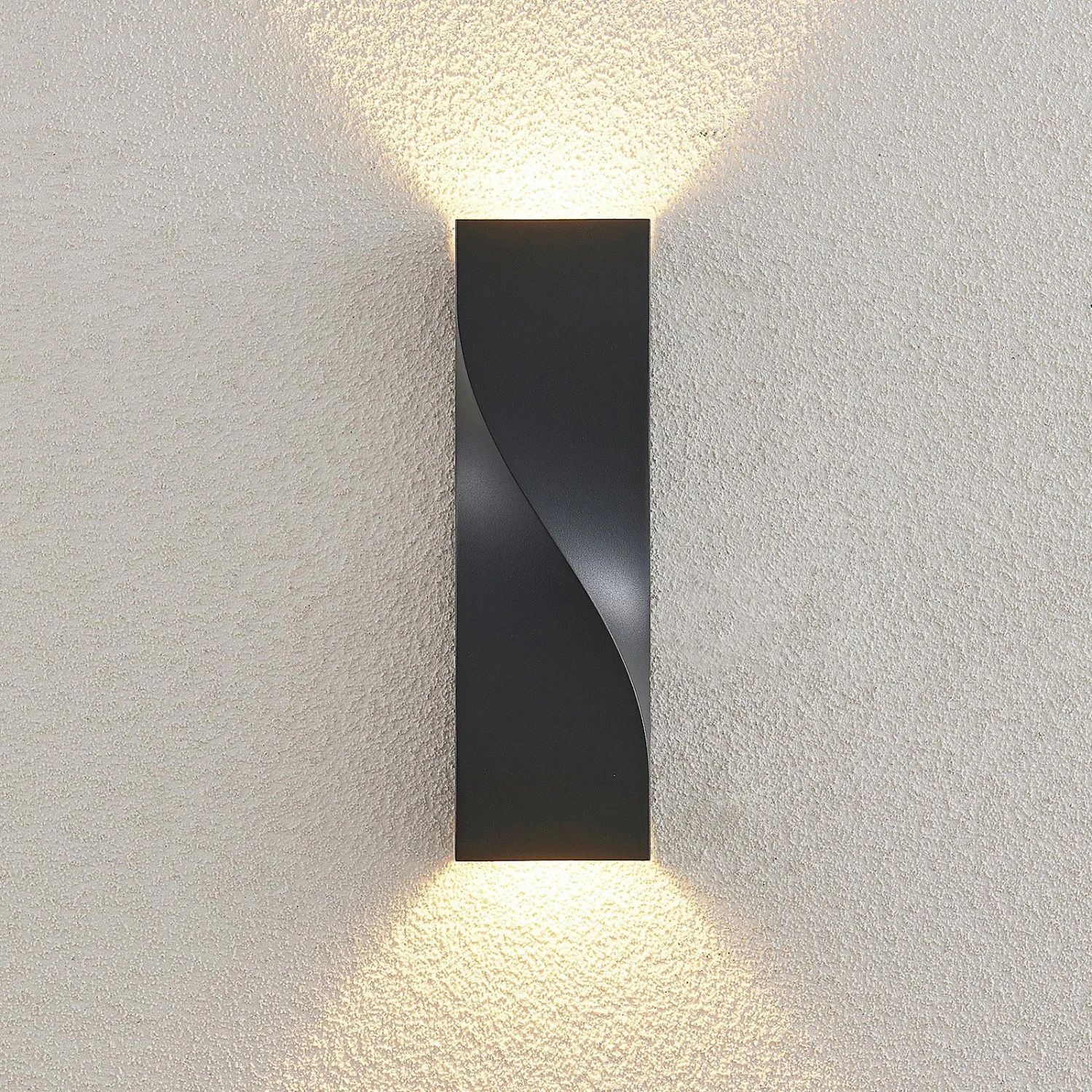 Die Form der LED-Außenwandleuchte Tibelya ist bereits bei Tageslicht ein Hingucker. Rechteckig in der Grundform ist der Korpus der Leuchte auf der Vorderseite elegant gedreht und zeigt eine besondere Raffinesse. Das dunkelgraue Aluminium, aus dem die Leuchten Tibelya besteht, wirkt dabei schlicht, aber dennoch hochwertig und robust. In der Dunkelheit zeigt sich jedoch erst die wahre Schönheit der Außenleuchte, denn die beiden integrierten LED-Lichtquellen strahlen hier je nach oben und unten an der Hauswand entlang und sorgen für einen besonderen Lichteffekt.