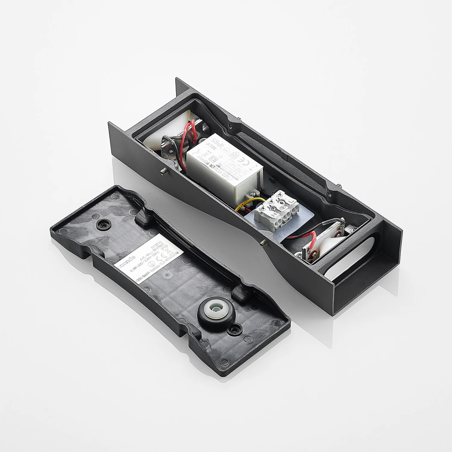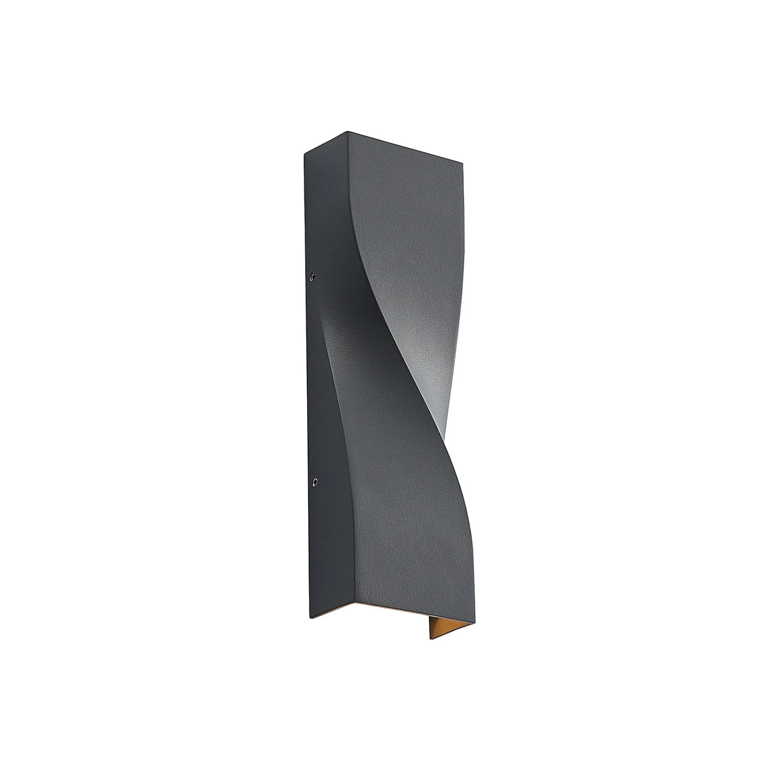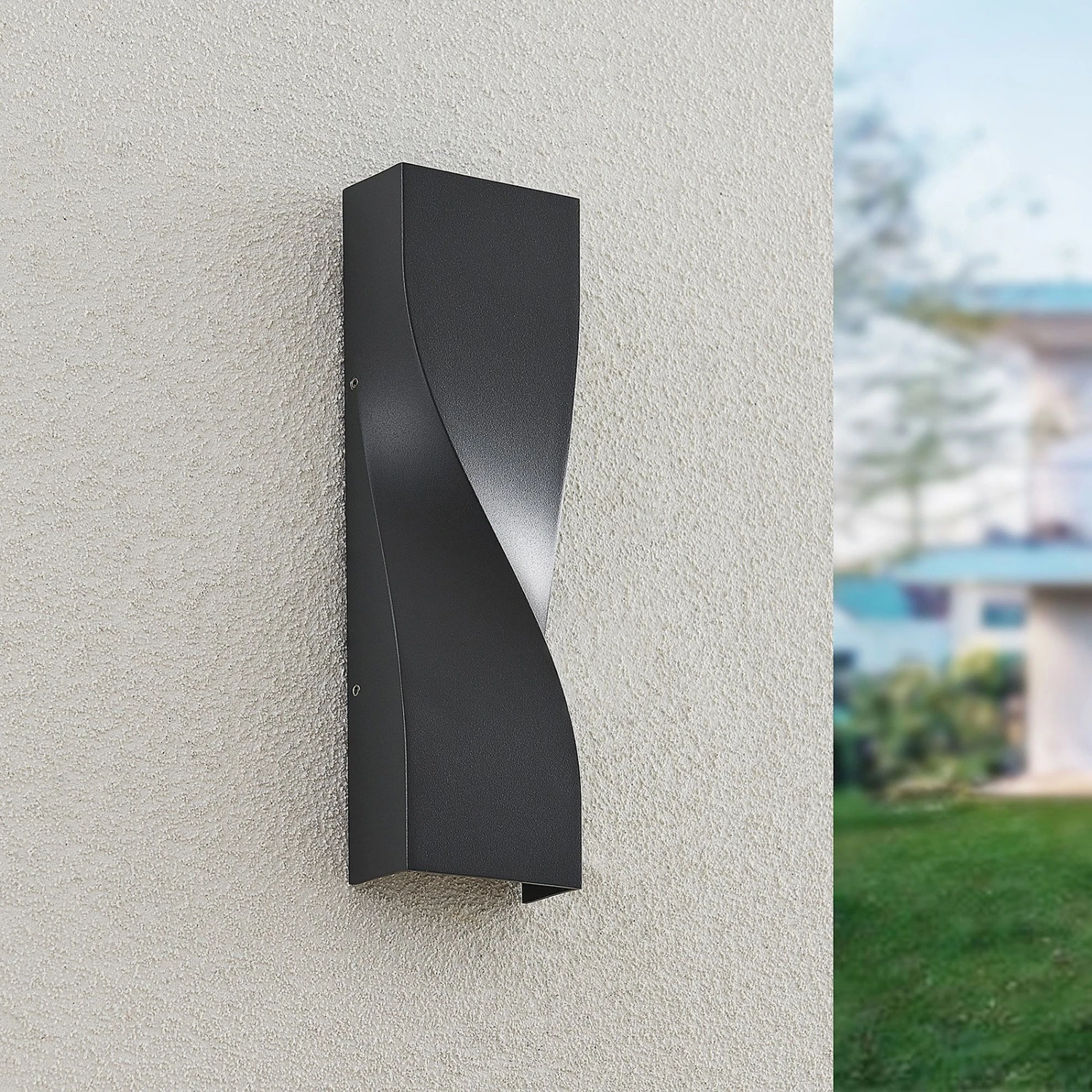 Die Form der LED-Außenwandleuchte Tibelya ist bereits bei Tageslicht ein Hingucker. Rechteckig in der Grundform ist der Korpus der Leuchte auf der Vorderseite elegant gedreht und zeigt eine besondere Raffinesse. Das dunkelgraue Aluminium, aus dem die Leuchten Tibelya besteht, wirkt dabei schlicht, aber dennoch hochwertig und robust. In der Dunkelheit zeigt sich jedoch erst die wahre Schönheit der Außenleuchte, denn die beiden integrierten LED-Lichtquellen strahlen hier je nach oben und unten an der Hauswand entlang und sorgen für einen besonderen Lichteffekt.