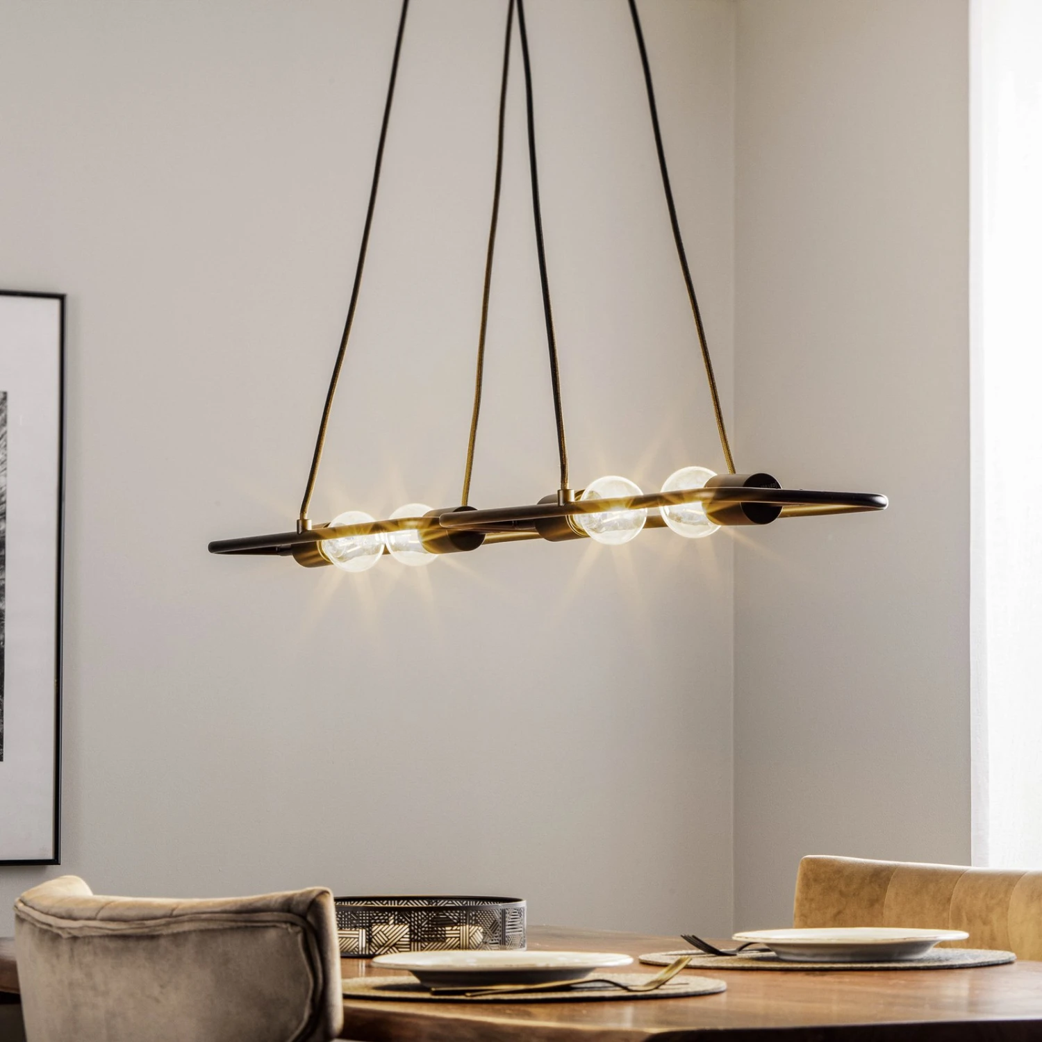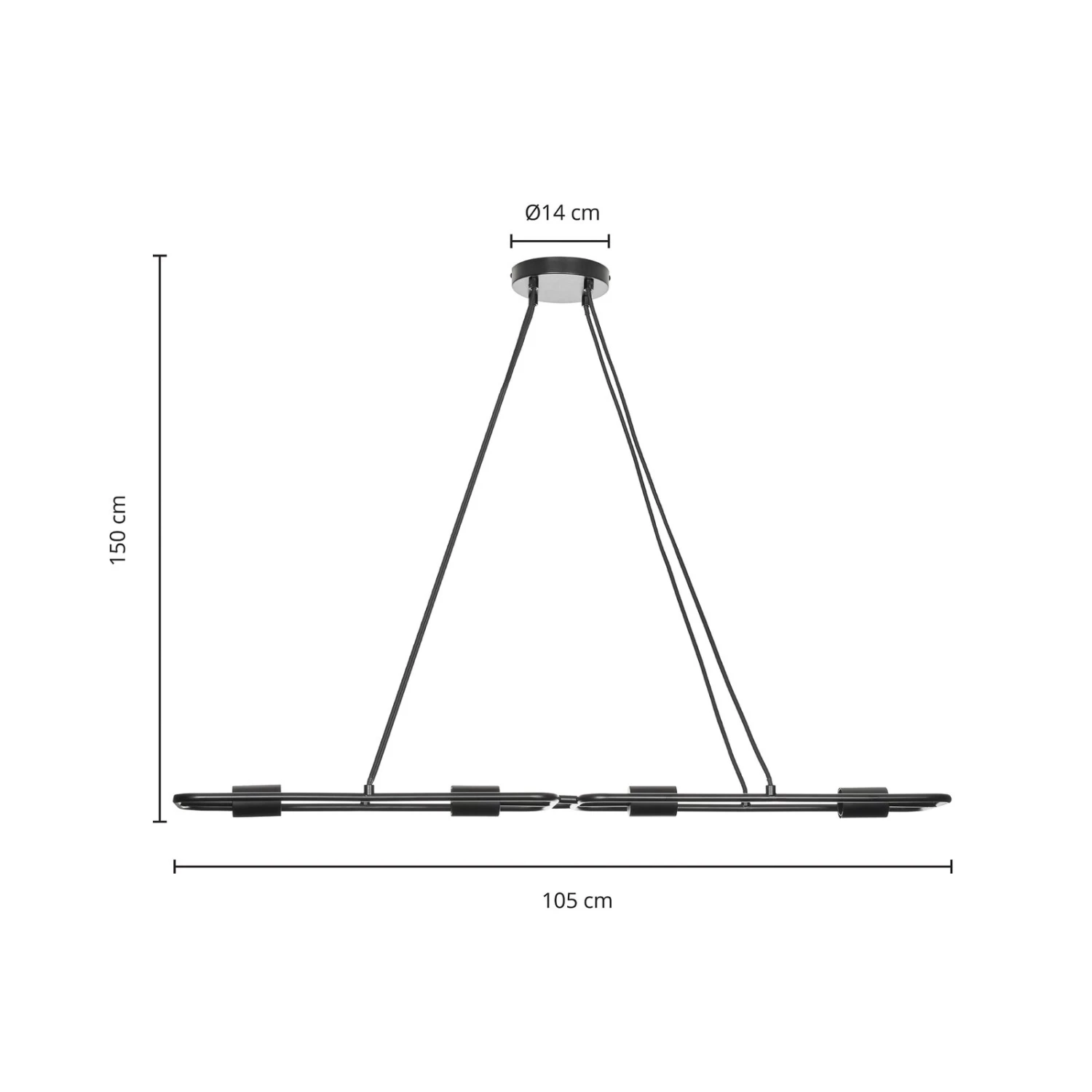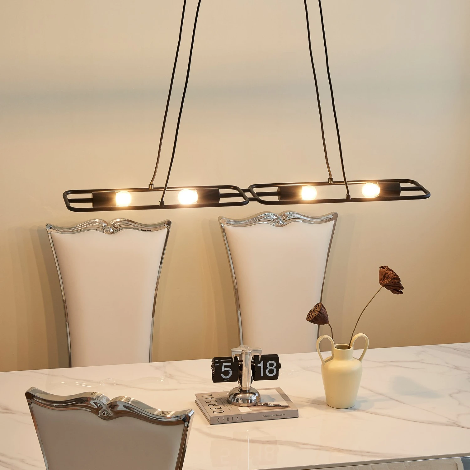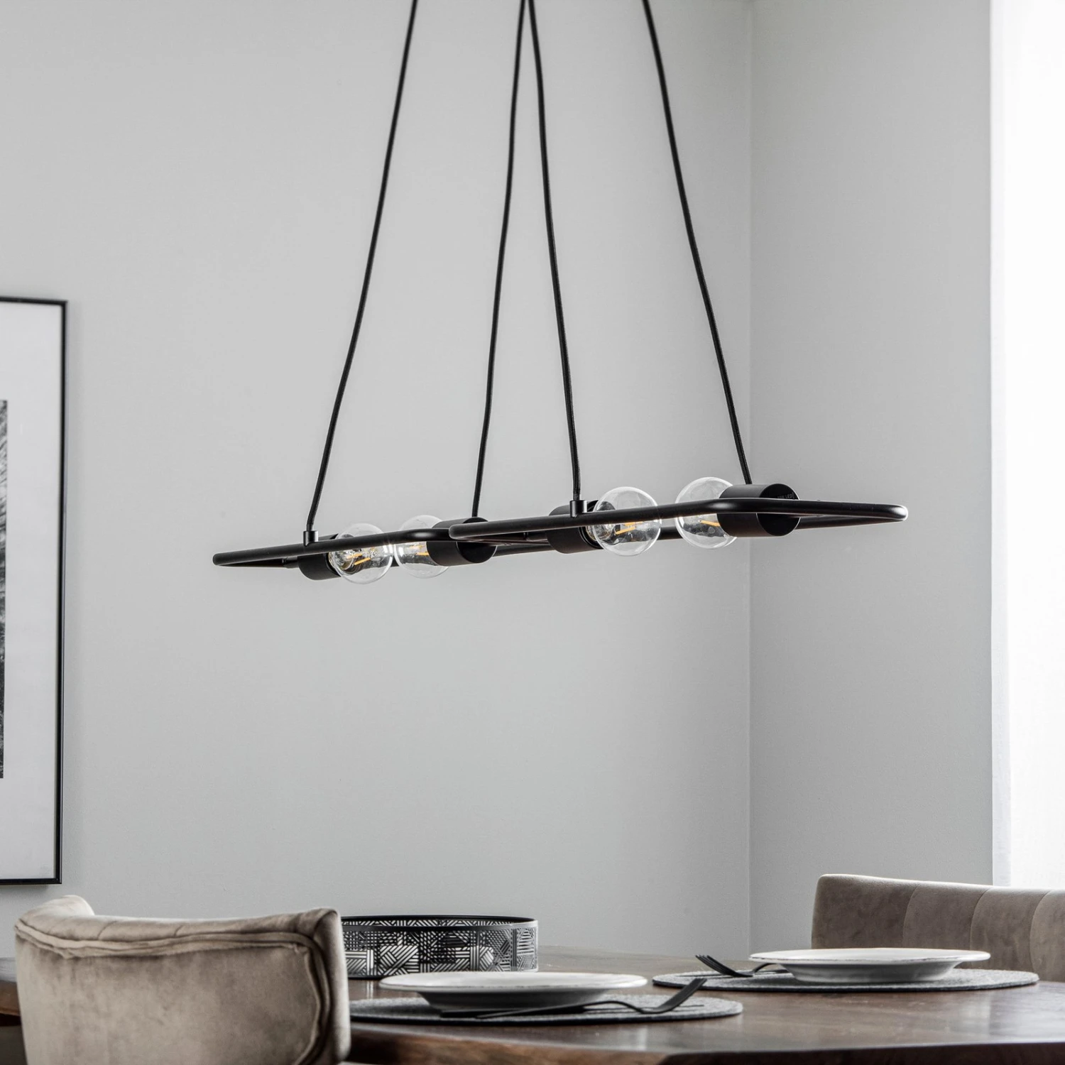 Tornike eignet sich hervorragend für die Beleuchtung eines Wohnzimmers oder eines Schlafzimmers. Die Hängelampe ist aus Stahl hergestellt und präsentiert sich in einer mattschwarzen Farbe. Sie besitzt vier Fassungen, die sich jeweils zu zweit in einem Rahmen gegenüberstehen und mit entsprechenden Leuchtmitteln bestückt werden können. Durch den freien Blick auf die Lichtquellen, eignen sich in diesem Fall vor allem Filament-Leuchtmittel. Diese besitzen ein besonderes Aussehen und verleihen der Leuchte das gewisse Etwas. Mit ihrer Aufhängung eignet sich Tornike perfekt für die Installation über einem Esstisch.
