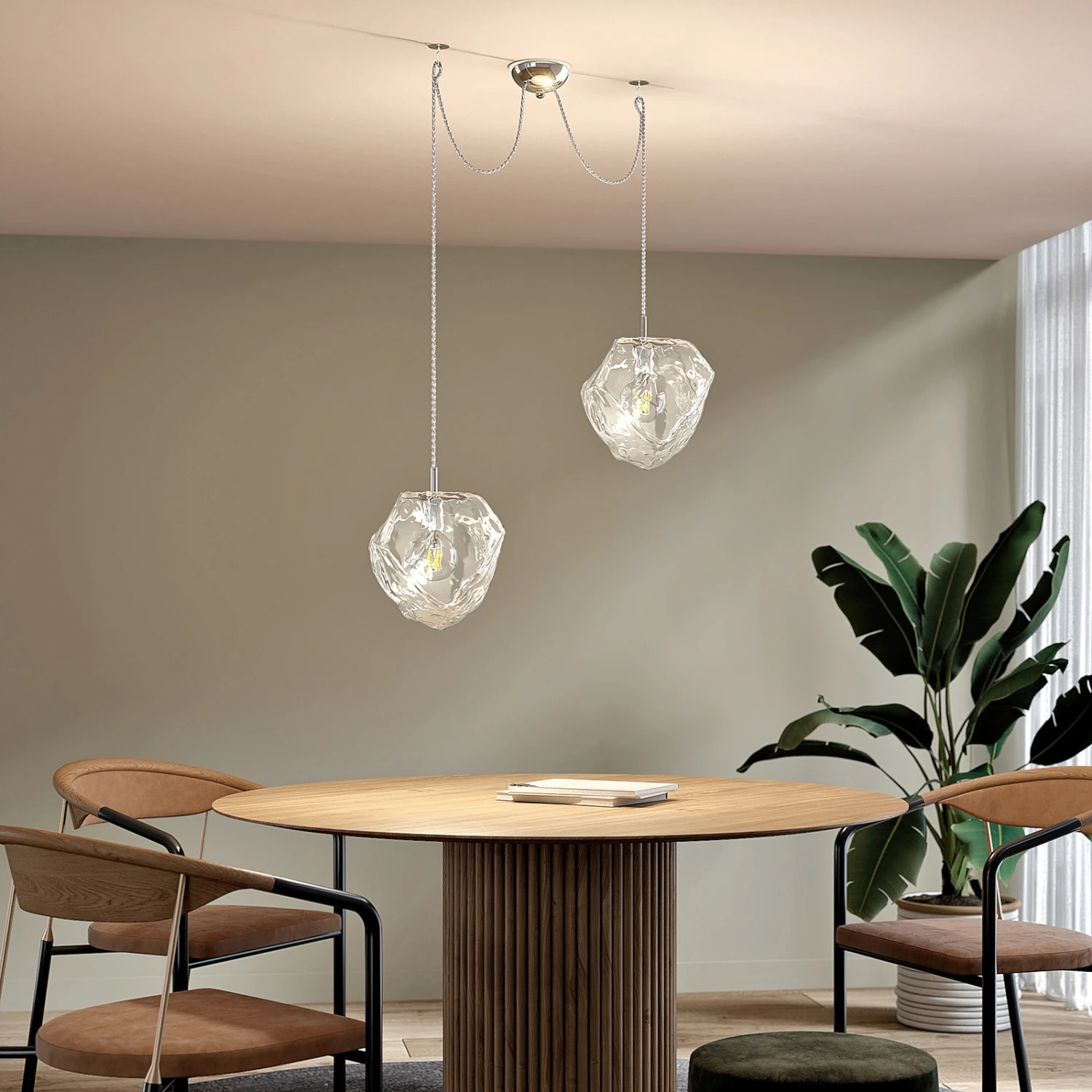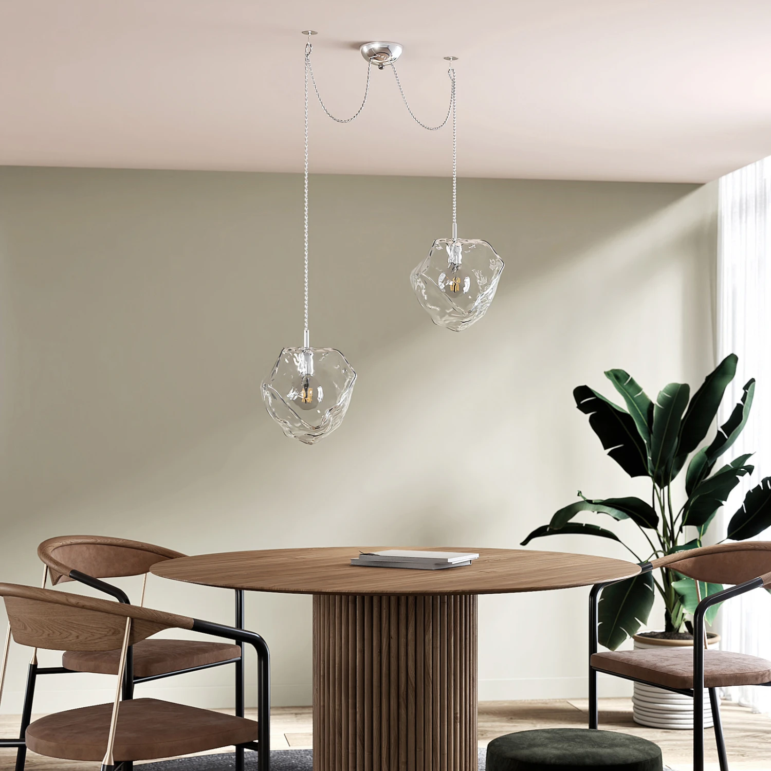 Valina ist eine schöne Hängeleuchte, die besonderes Flair in den Raum bringt. Die Deckenhalterung und Abhängung wurden aus Eisen hergestellt und in einem neutralen Chrom gehalten, sodass der Fokus auf den wohlgeformten Leuchtenschirmen aus Glas liegt. Diese können dezentral an der Decke angebracht werden.
