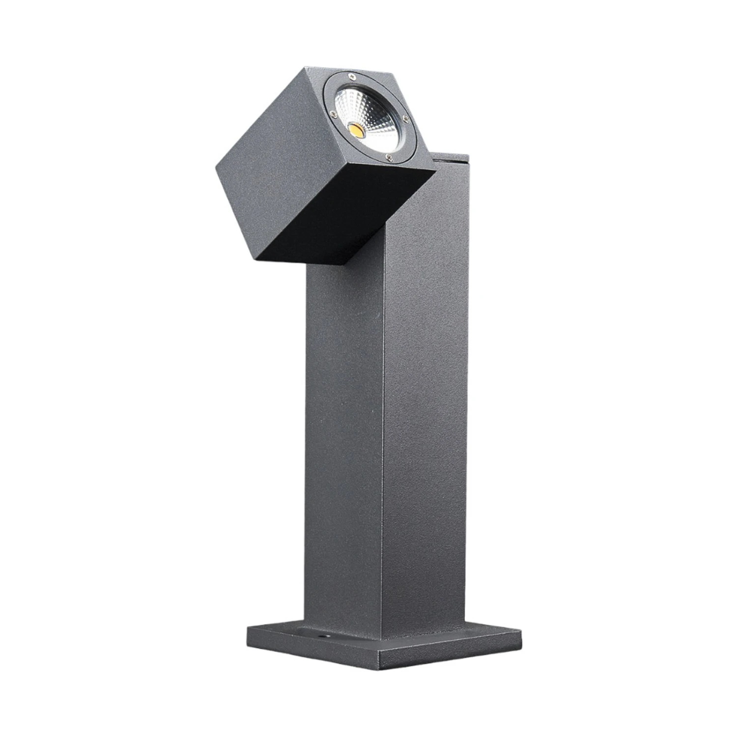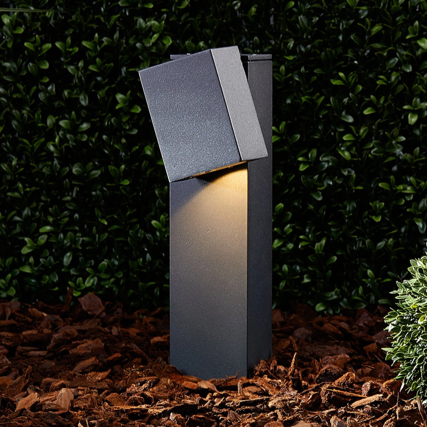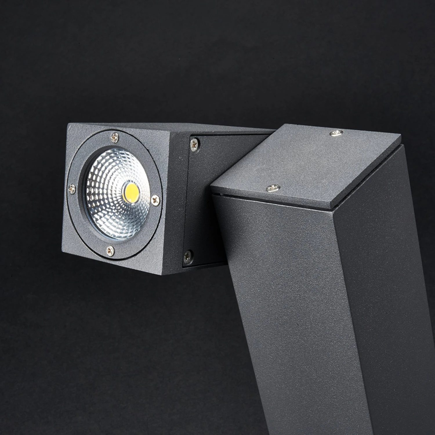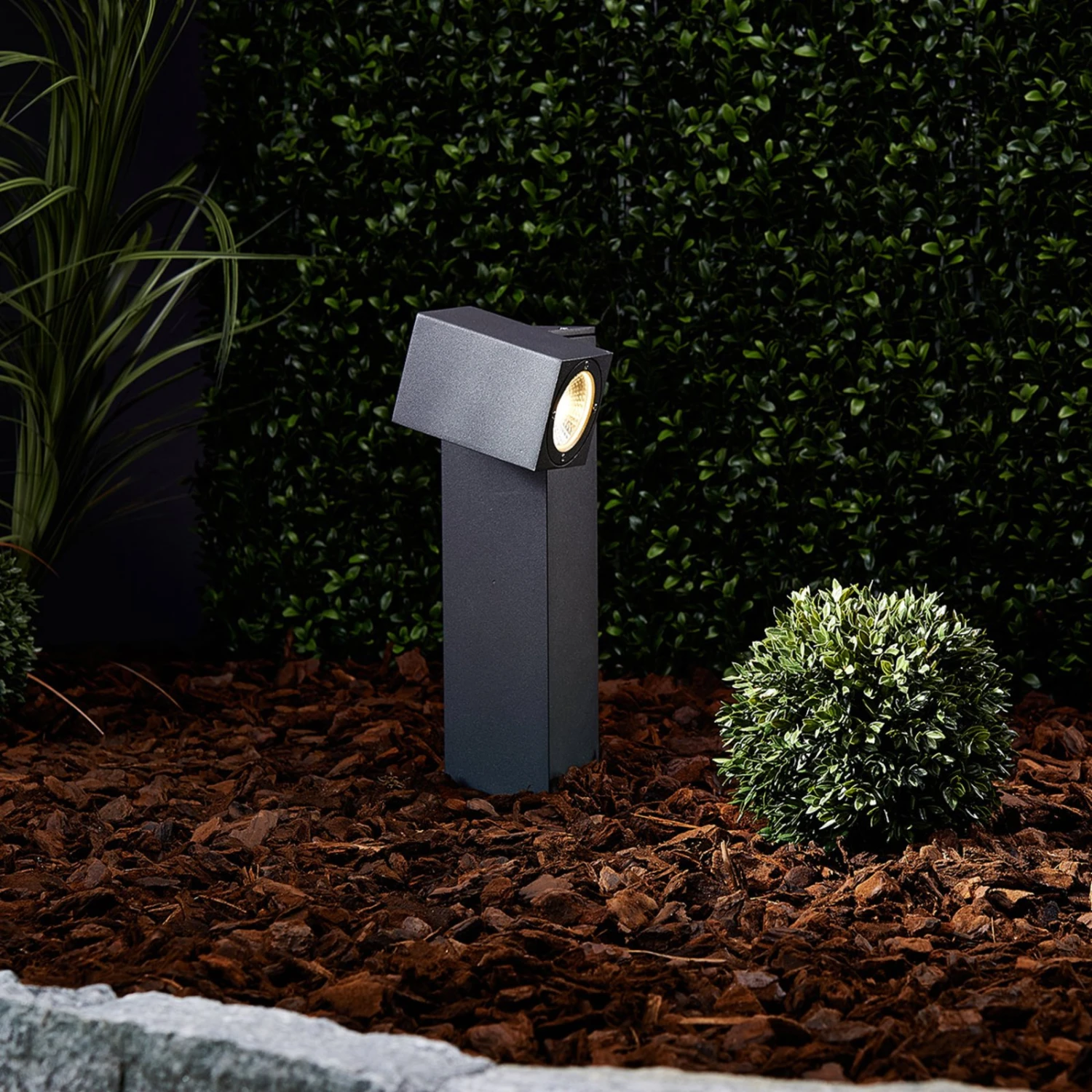 Absolut geradlinig im Design, passt die LED-Sockelleuchte zu allen Häusern, Gebäudekomplexen und Umgebungen, die sich im modernen Stil präsentieren. Neben dem eigentlichen Gestell in Quaderform befindet sich seitlich ein weiteres Element in der gleichen Form, das den Schirm dieser modern anmutenden Außenleuchte darstellt. Die Besonderheit: Dieser ist nicht starr oder fixiert – nein, er lässt sich rundum drehen, um bis zu 320°! Damit stellt das Licht im Garten einen veränderlicher Aspekt dar, der sich mit seiner Lichtausrichtung an die Umgebung anpassen lässt. Stellt man mehrere Leuchten der Serie gemeinsam auf, dann besteht sogar die Option, mit dem Licht zu spielen, indem man die Leuchtköpfe von Zeit zu Zeit neu ausrichtet. Der Lichteffekt wird dann jedes Mal ein anderer sein!