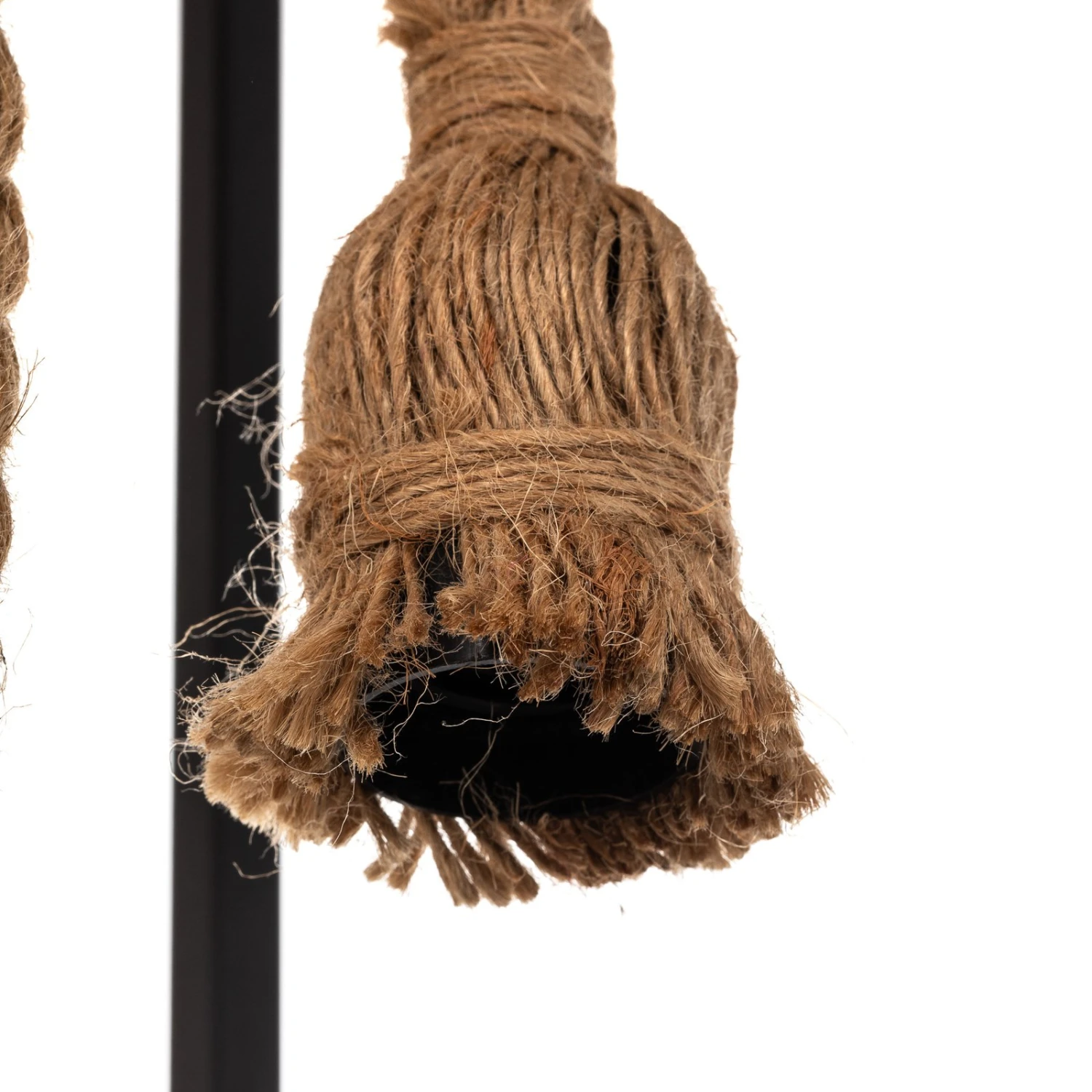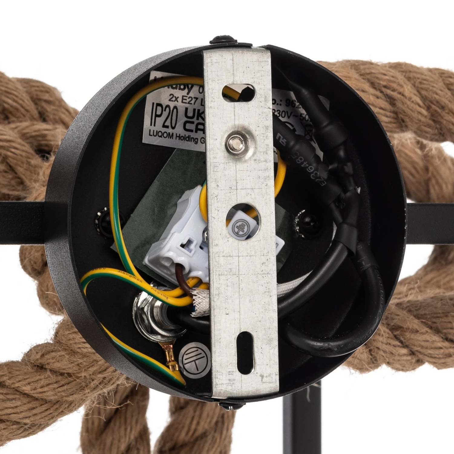 Vlados besitzt durchaus Vintage-Qualitäten und überzeugt mit einem exklusiven Look. Statt eines Schirmes kommt hier ein eckiger Rahmen aus schwarzem Stahl zum Einsatz, der zusätzlich mit zwei Hanfseilen bestückt ist, die vom Stromauslass zu den Fassungen führen und einen optisch schönen Kontrast hervorrufen. Sie lassen sich nach Belieben um das Gestell wickeln, was eine individuellere Gestaltung von Licht und Optik ermöglicht. Da die beiden Lampen präsenter Bestandteil sind, sollten auch die Leuchtmittel so ausgewählt werden, dass sie optisch gut passen. Das trifft in erster Linie auf LED-Filamentlampen oder Leuchtmittel in Rustikaoptik zu, die zumeist auch recht stromsparend sind mit ihrer Leuchtdiodentechnik.