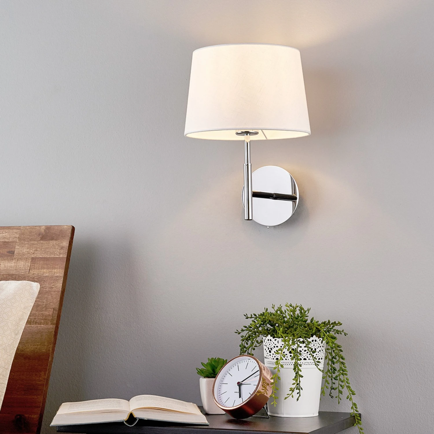 Die Wandlampe Dorothea besitzt einen besonders zeitlosen Charakter. Das liegt daran, dass sie mit der Kombination aus weißem Stoffschirm und Metallgestell ein traditionelles, aber dezentes Erscheinungsbild verkörpert, das man schon seit Jahrzehnten kennt. Das Gestell hat eine schöne Hochglanzchromoberfläche und der weiße Stoffschirm sorgt für ein wunderbar gemütliches Licht. Zur komfortablen Bedienung ist Dorothea mit einem am Gestell sitzenden Kippschalter ausgestattet.
