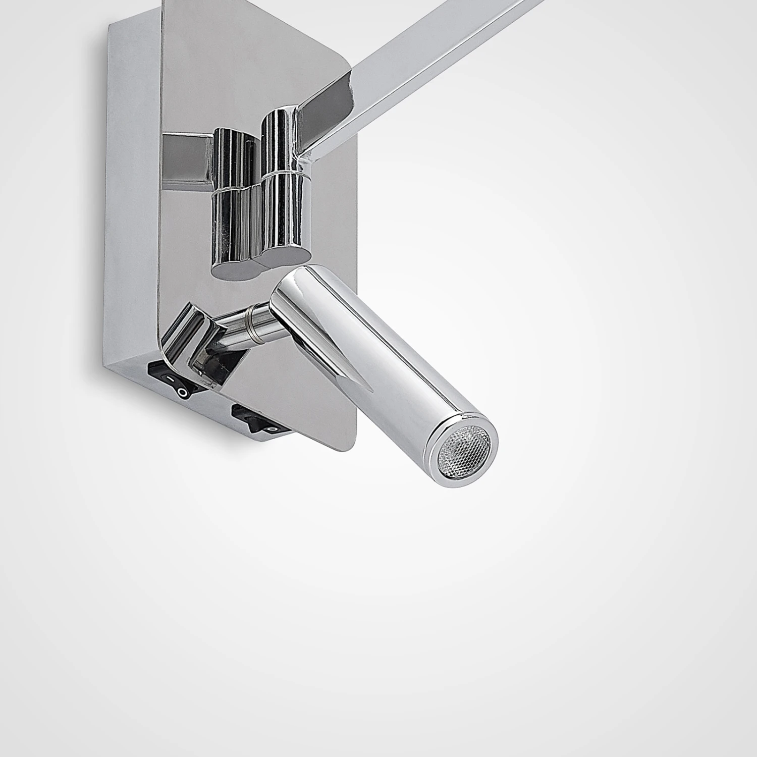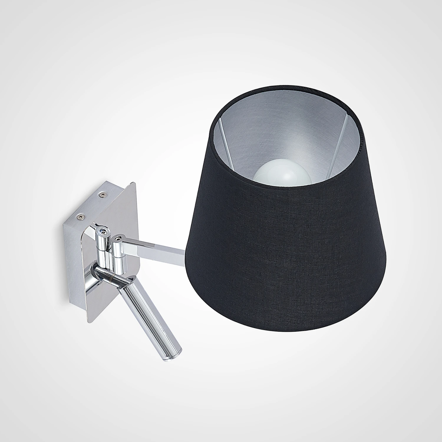 Die klassisch elegante Wandleuchte Irella besteht aus einem textilen, schwarzen Lampenschirm, der mit einem Gestell aus chromglänzenden Metall ergänzt wird. An der Wandplatte ist ein zusätzliches Leselicht angebracht, welches mit warmweißen LEDs für ein zielgerichtetes Licht sorgt, zum Beispiel für das abendliche Lesen. Zwei Schalter direkt an der Leuchte sorgen dafür, dass beide Lichtquellen bequem separat geschaltet werden können.
