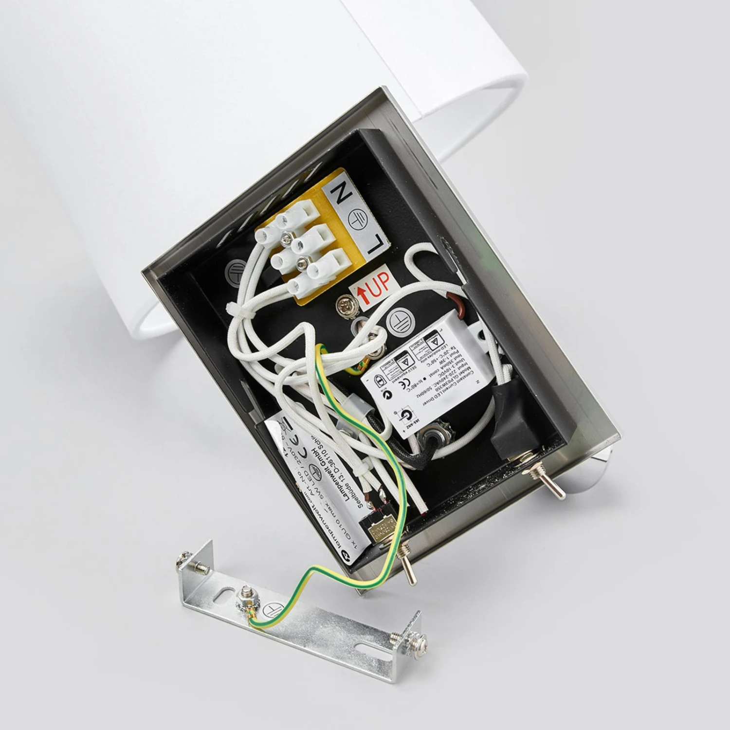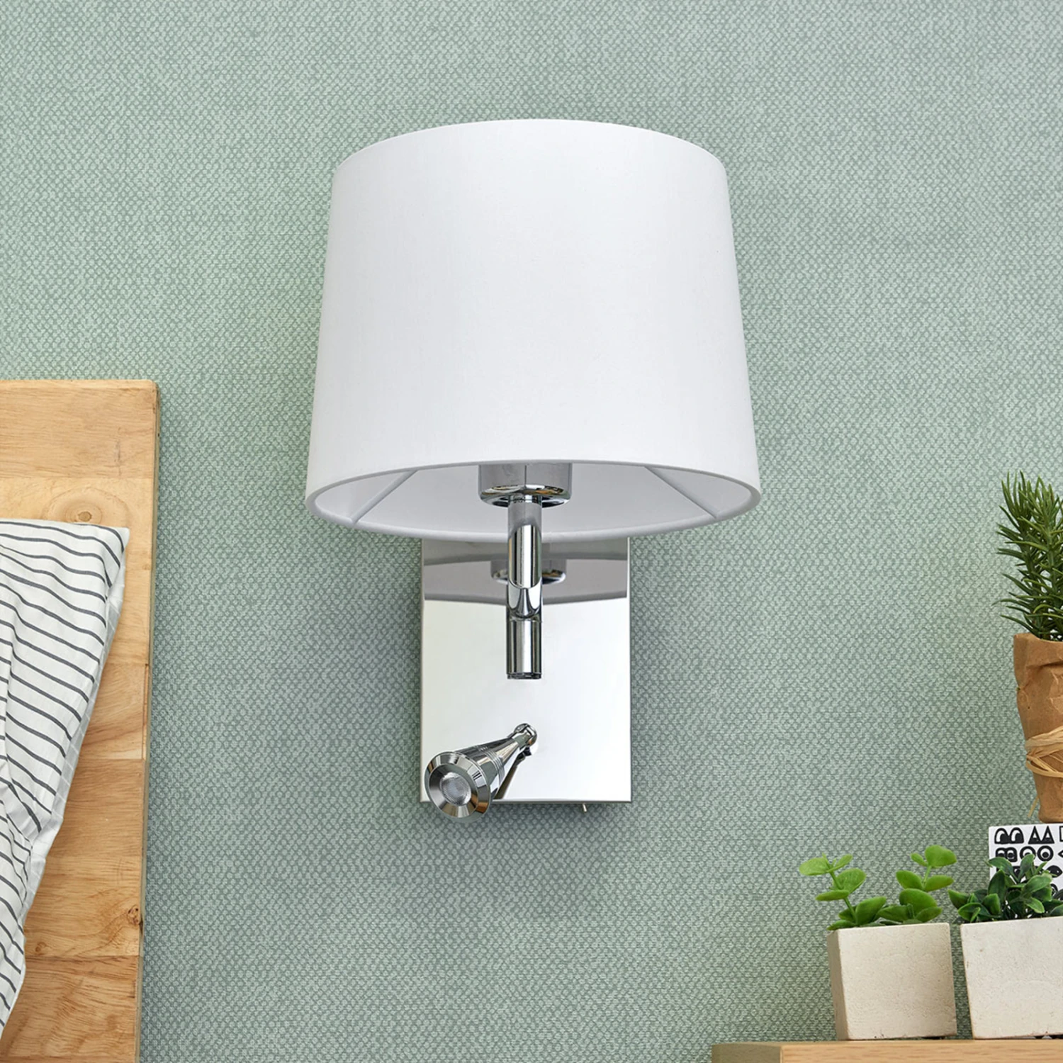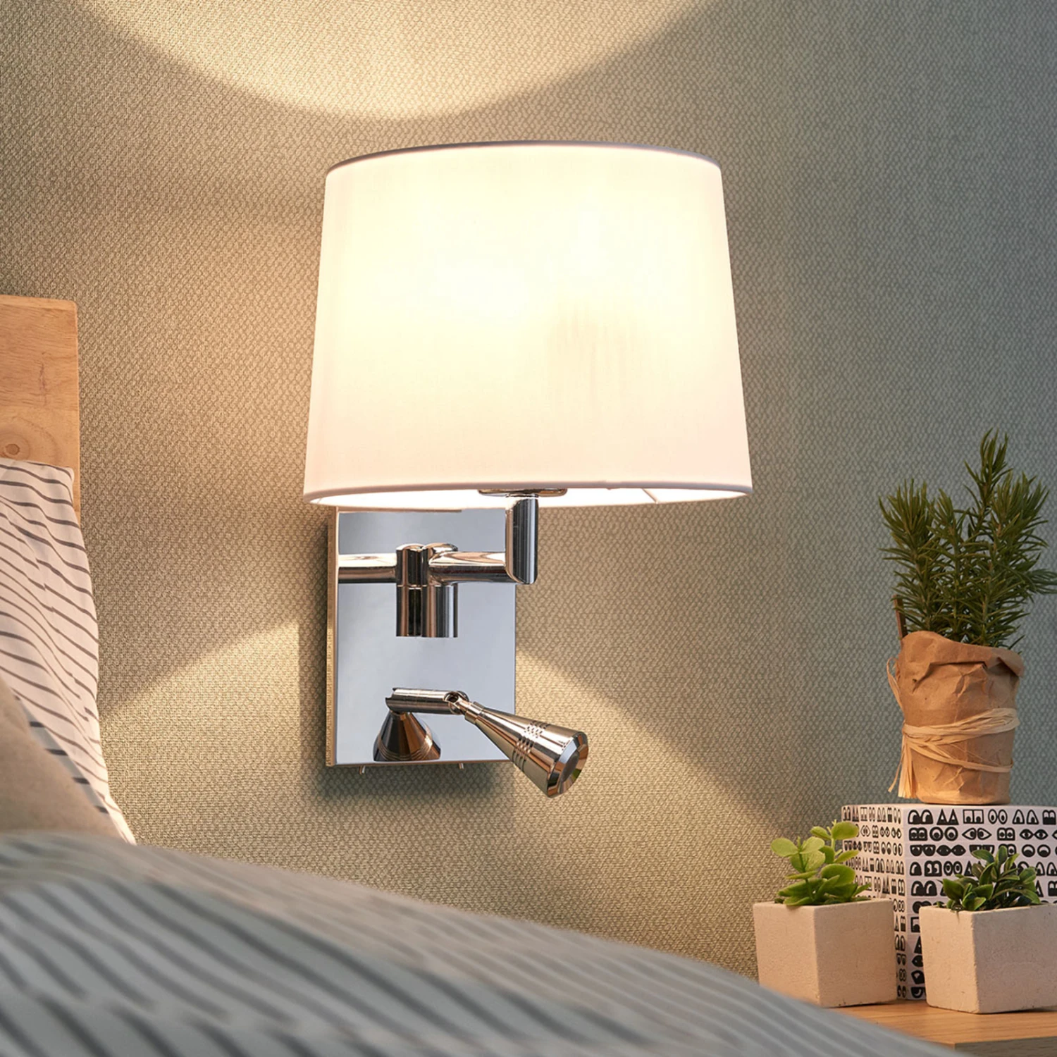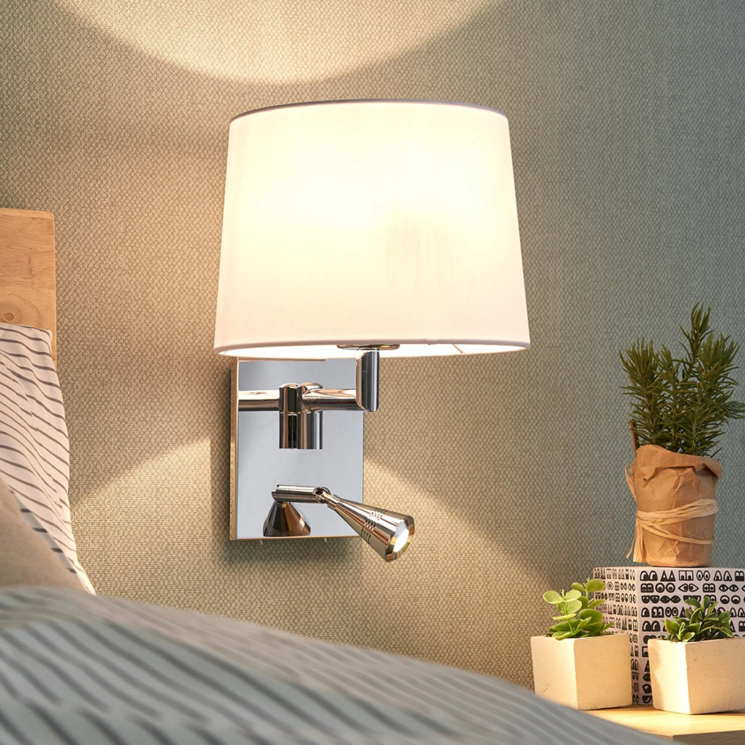 Bent ist eine hervorragende Ergänzung für Schlaf- und Wohnbereiche, denn für die beiden Lichtquellen sind zwei Schalter integriert, damit man die Lampen direkt vor Ort ein- und ausschalten kann. Der Stoffschirm ist weiß und zylindrisch, während die Leselampe eine sehr kompakte Form besitzt und zielgerichteten Lichtschein zum Lesen erzeugt, der vom Stoffschirm nicht geleistet werden kann, weil dieser im Gegensatz für gemütliches, gleichmäßiges Licht zum Entspannen steht. So kann man zwei grundlegend unterschiedlichen Bedürfnissen gerecht werden und findet dies in nur einer Wandleuchte vereint, was sich als sehr komfortabel erweist. Das Leselicht mit integrierter LED-Lichtquelle kann gedreht und geschwenkt und daher optimal ausgerichtet werden.