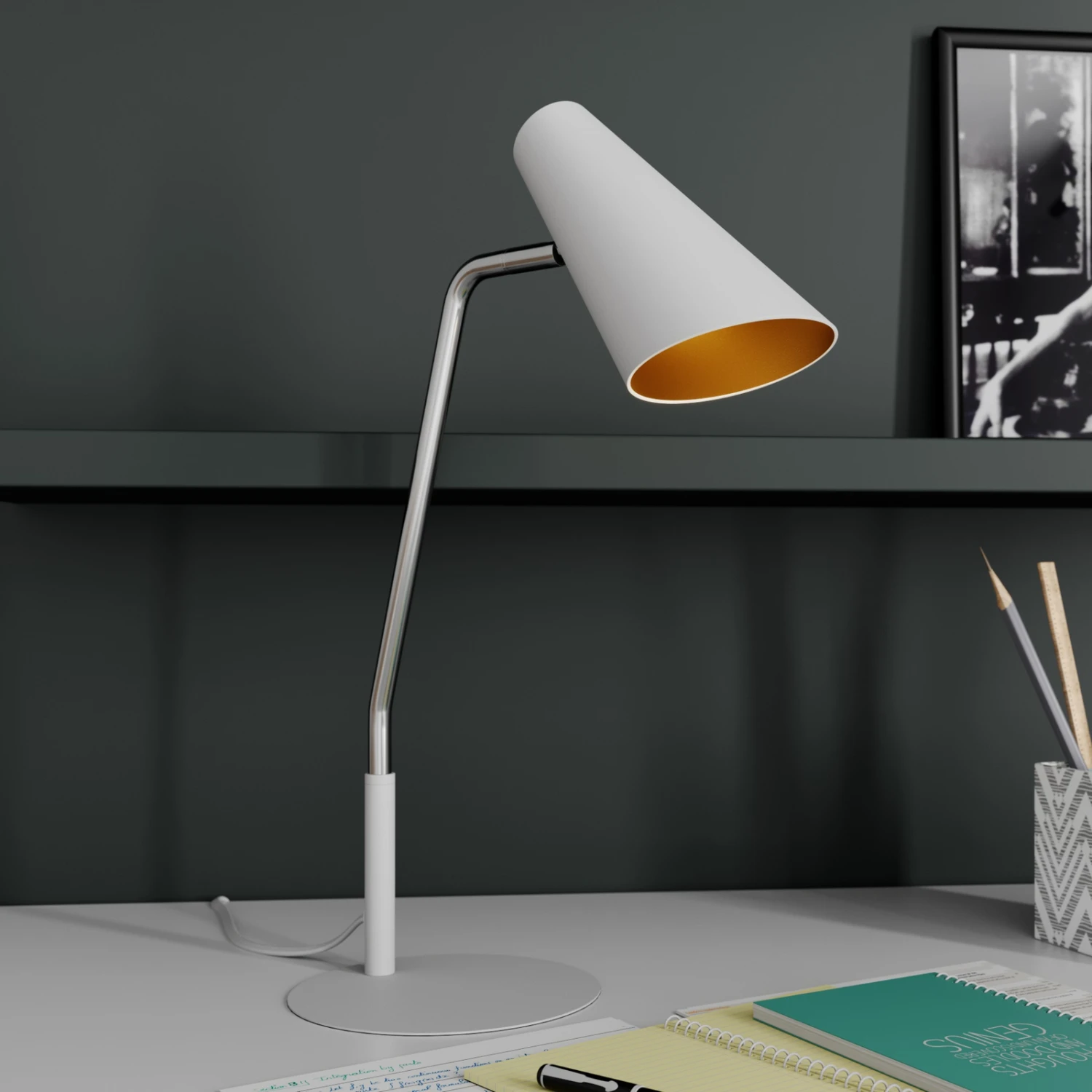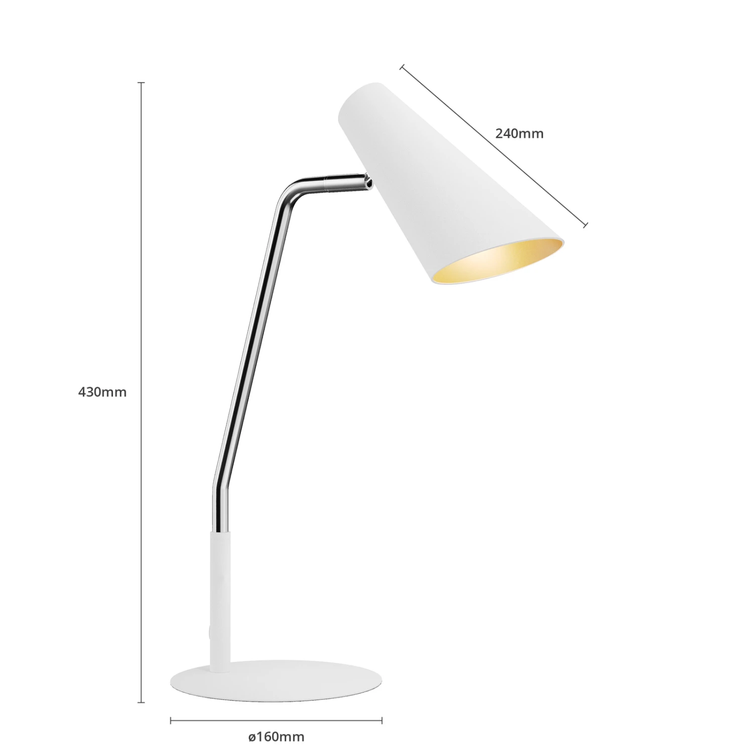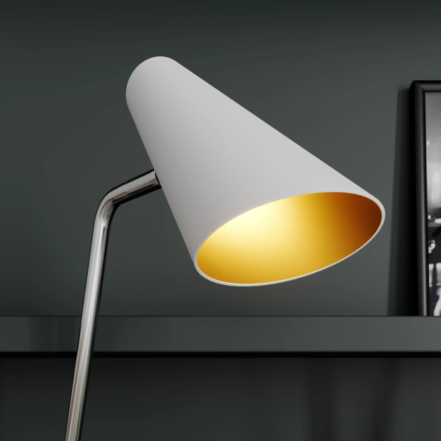 Die Tischleuchte Wibke ist in ihrem Design äußerlich in hellem Weiß und Chrom, im Innern ihres konisch gestalteten Lampenschirms mit kontrastreichem Gold gestaltet. Durch das Design passt die Tischlampe Wibke zu modernen, puristischen sowie skandinavischen Einrichtungskonzepten. Ob auf dem Schreibtisch oder einem Beistelltisch als zusätzliche Lichtquelle, Wibke macht überall eine gute Figur. Der konisch gestaltete Lampenschirm besitzt auf der Oberseite den Schalter zum Ein- und Ausschalten. Dies ist ungemein praktisch, da das Suchen nach dem Schalter am Kabel hier ein Ende hat und das Bedienen der Tischlampe mit nur einem Handgriff ermöglicht wird.