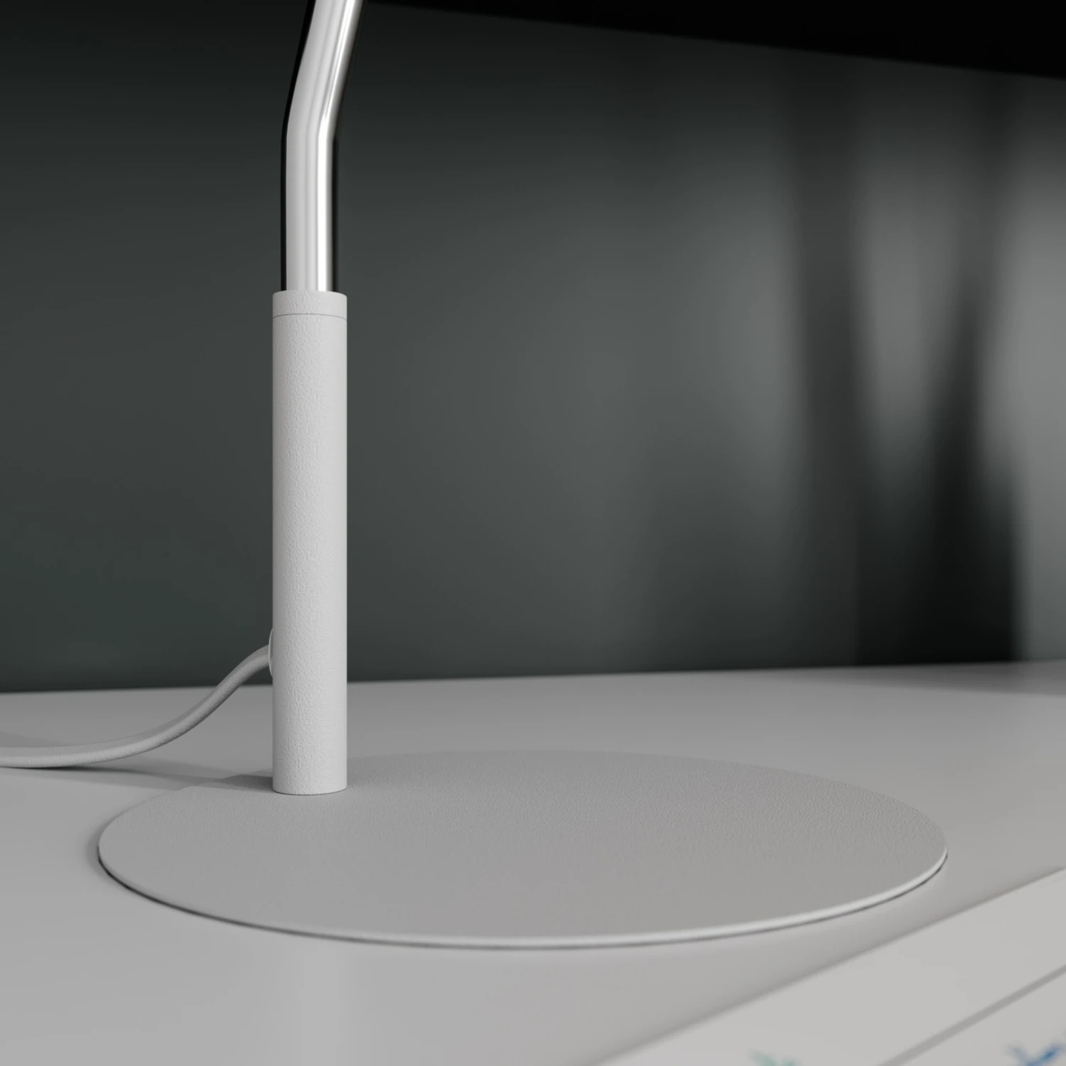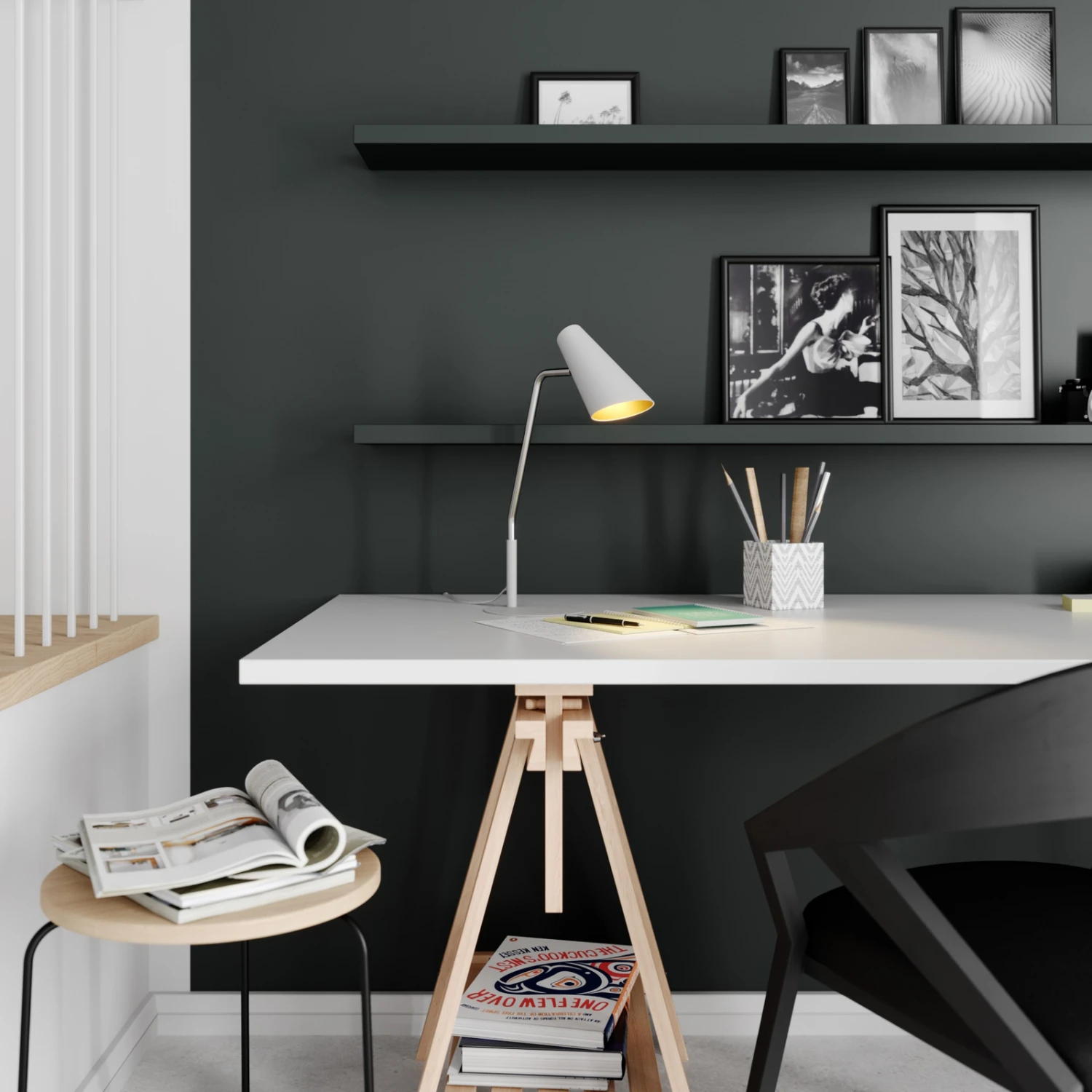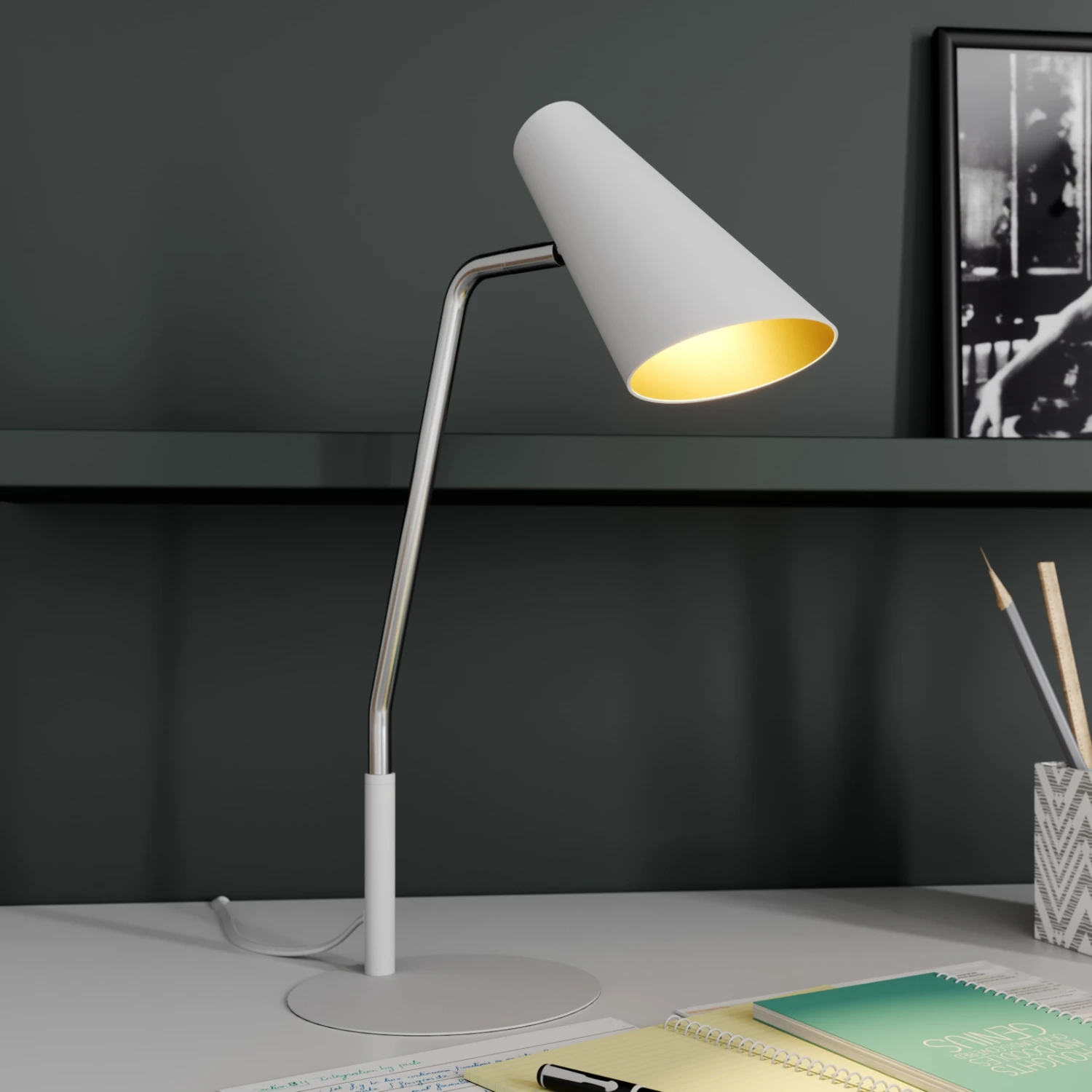 Die Tischleuchte Wibke ist in ihrem Design äußerlich in hellem Weiß und Chrom, im Innern ihres konisch gestalteten Lampenschirms mit kontrastreichem Gold gestaltet. Durch das Design passt die Tischlampe Wibke zu modernen, puristischen sowie skandinavischen Einrichtungskonzepten. Ob auf dem Schreibtisch oder einem Beistelltisch als zusätzliche Lichtquelle, Wibke macht überall eine gute Figur. Der konisch gestaltete Lampenschirm besitzt auf der Oberseite den Schalter zum Ein- und Ausschalten. Dies ist ungemein praktisch, da das Suchen nach dem Schalter am Kabel hier ein Ende hat und das Bedienen der Tischlampe mit nur einem Handgriff ermöglicht wird.