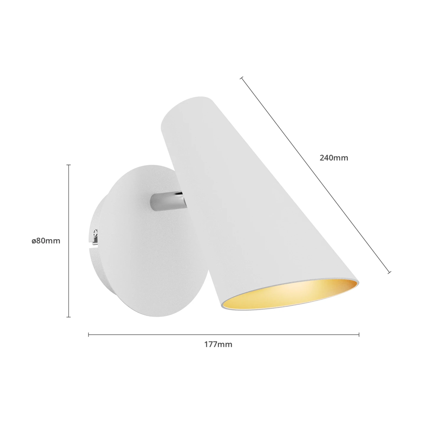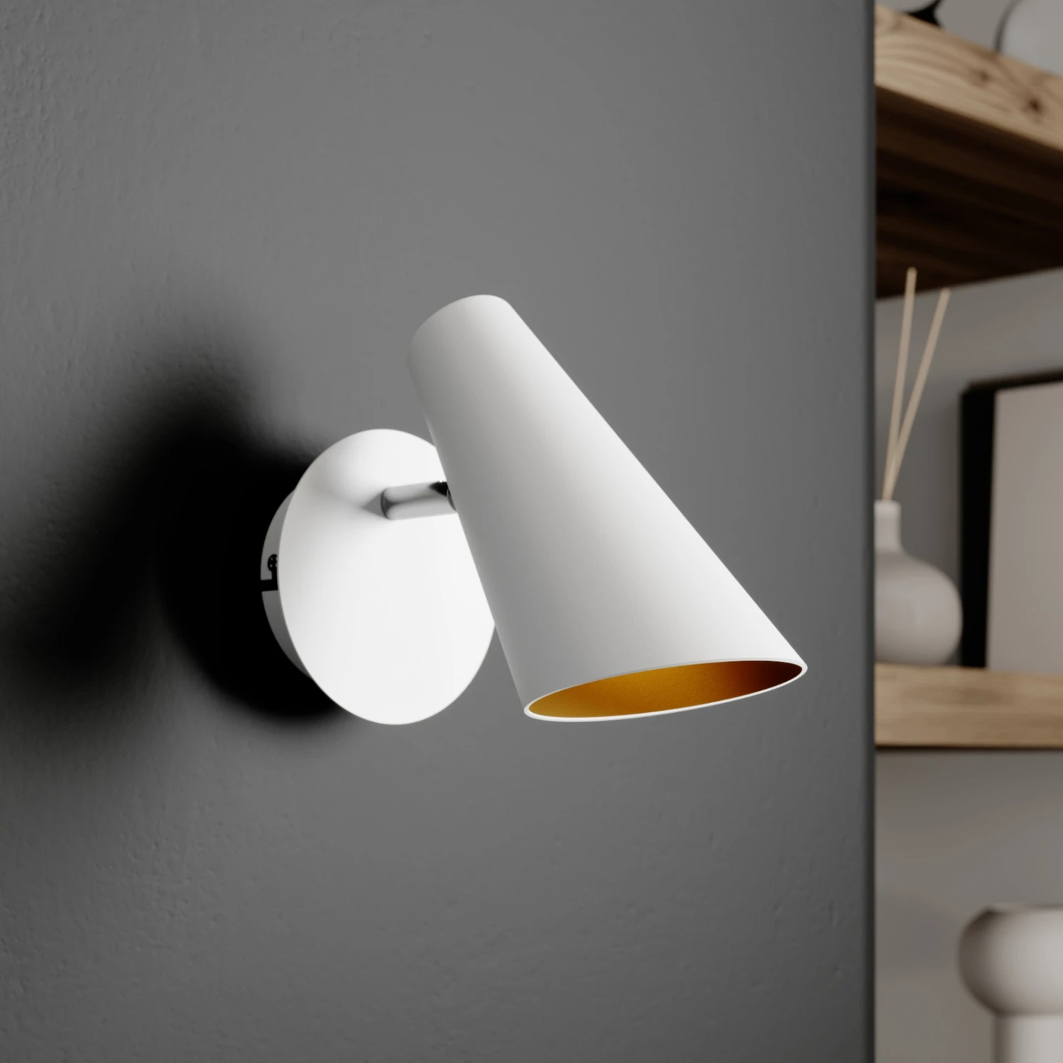 Die modern gestaltete Wandleuchte Wibke orientiert sich optisch am skandinavischen Stil. Ihr Lampenschirm ist konisch gearbeitet und im Innern golden lackiert. Bei Einschalten des Lichts erzeugt die ansonsten reinweiß gehaltene Wandlampe eine angenehme und wohlige Atmosphäre. Ein praktischer Schalter, der direkt auf der Oberseite des Schirms angebracht ist, macht die Bedienung der Lampe Wibke kinderleicht. Der Lampenschirm ist zudem beweglich, womit die Ausrichtung des Lichts individuell angepasst werden kann. Das macht Wibke zu einem modischen Zusatzlicht für die Leseecke oder das moderne Wohnzimmer.