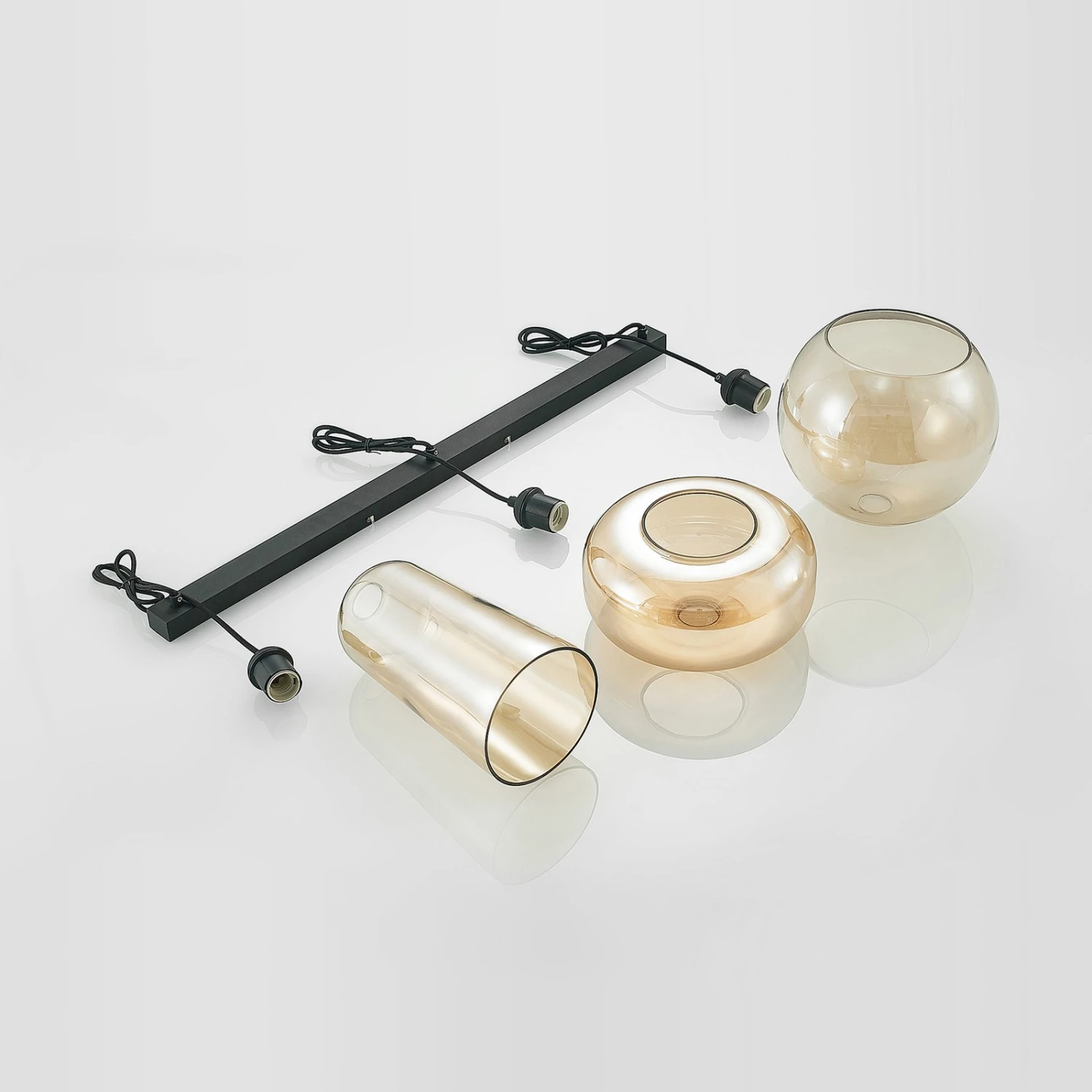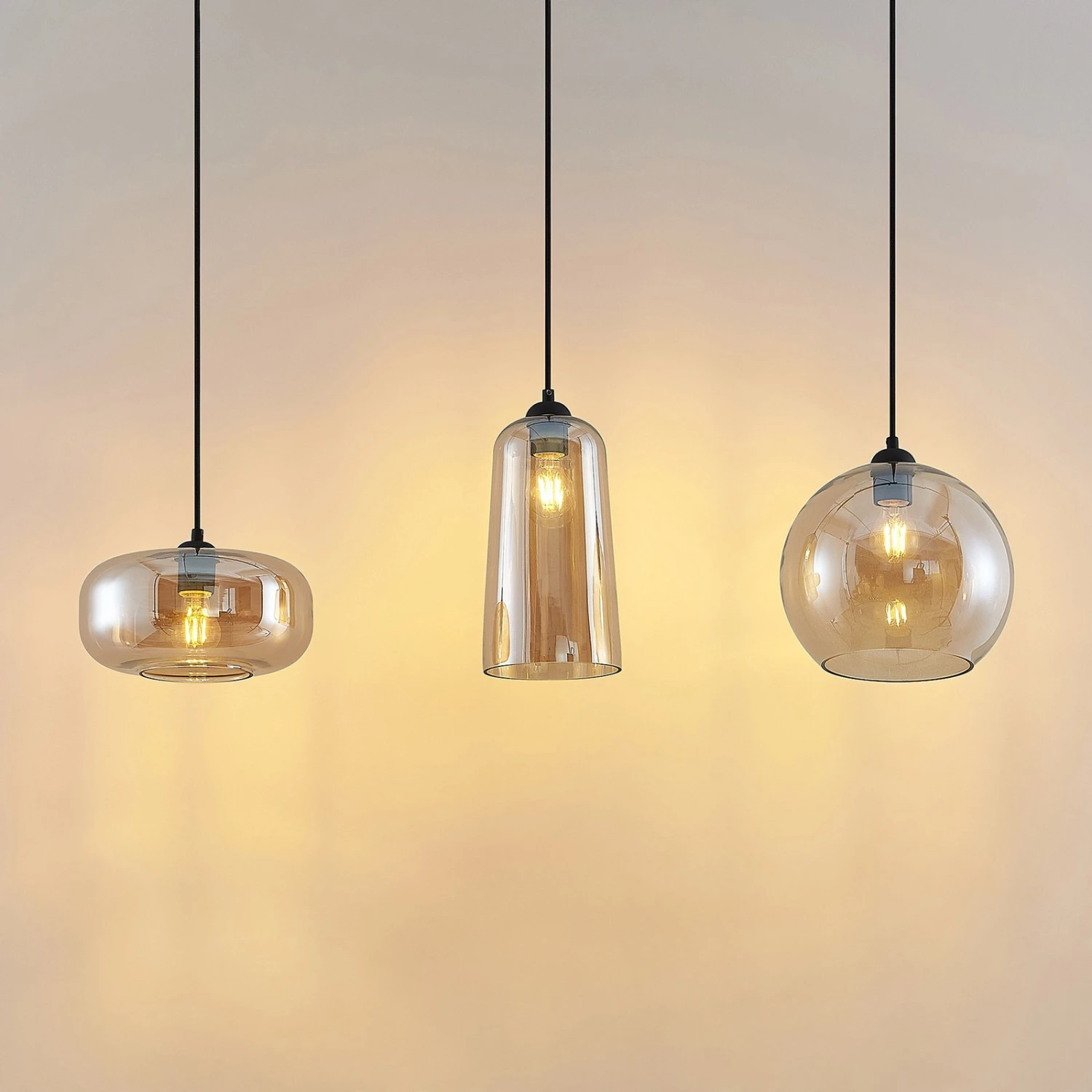 Dreiflammige Hängeleuchte Wilja mit amberfarbenem Glas in unterschiedlichen Formen