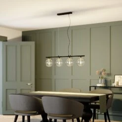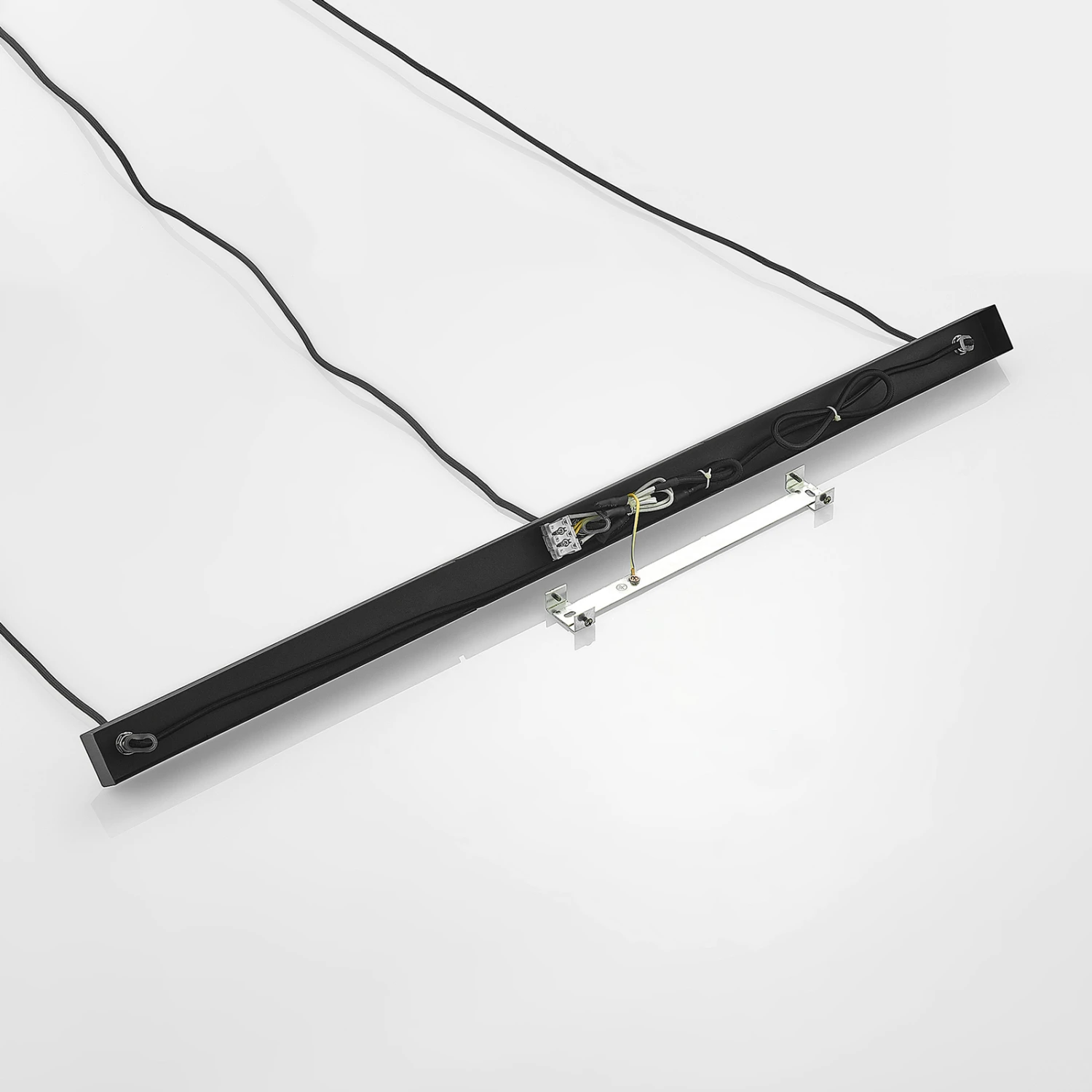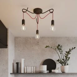 Die moderne Hängeleuchte Wilja besteht aus drei unterschiedlich geformten Lampenschirmen, die aus amberfarbenem Glas gefertigt sind. Diese sind parallel an einem Baldachin befestigt, der wie das Textilkabel in schlichtem Schwarz gestaltet ist. Der Kontrast mit dem amberfarbenem Glas macht Wilja zu einem wahren Blickfang oberhalb von Tischen, zum Beispiel im Esszimmer oder oberhalb eines Küchentisches. Das getönte Glas unterstreicht eine gemütliche Atmosphäre besonders schön, gerade bei eingeschalteten Lichtquellen.