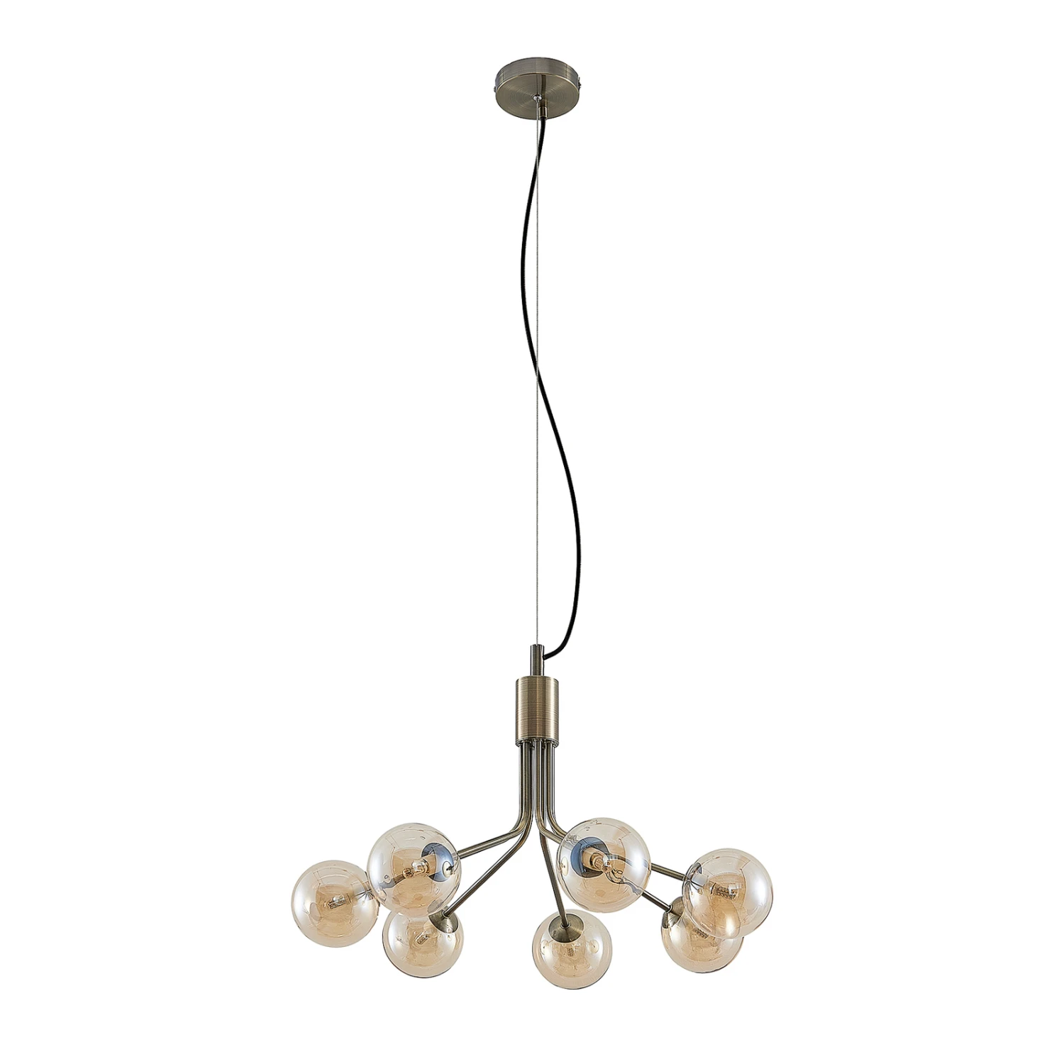 Fünfflammige Pendellampe Wynona mit Kugelschirmen aus geriffeltem Glas und einem Gestell in Altmessing